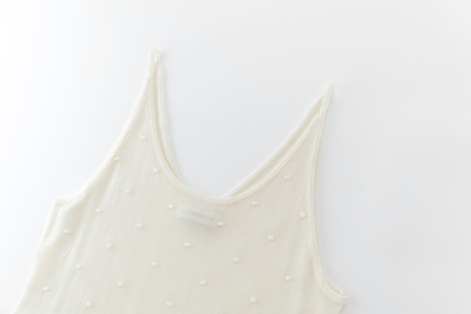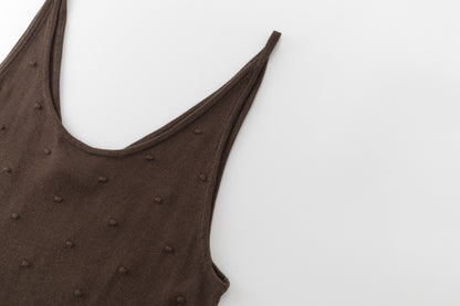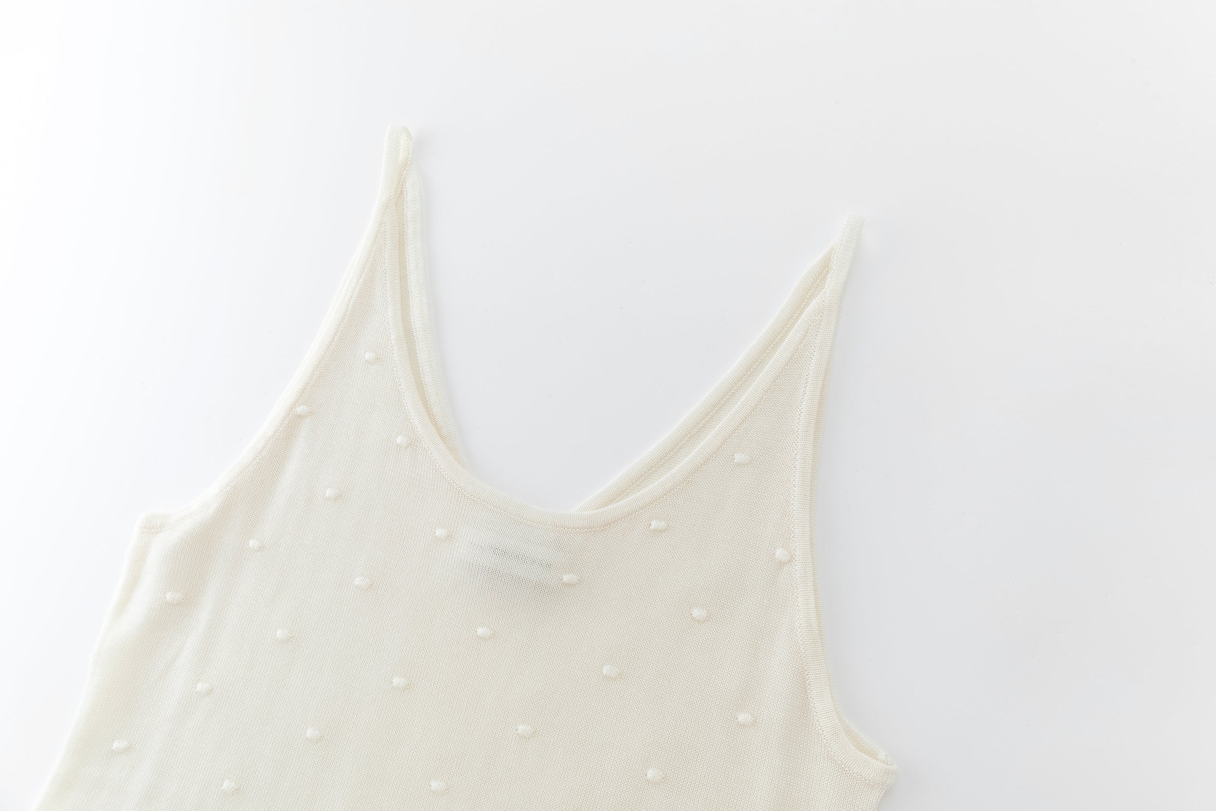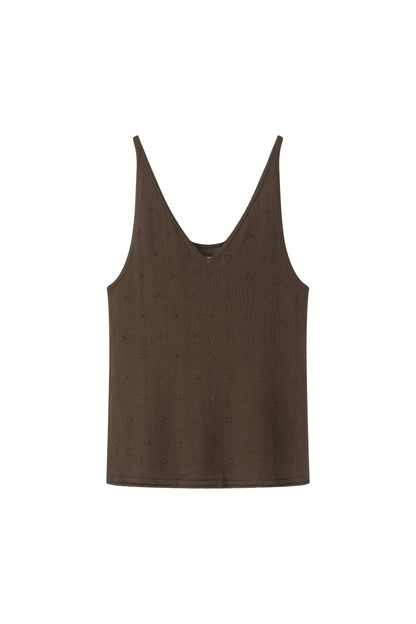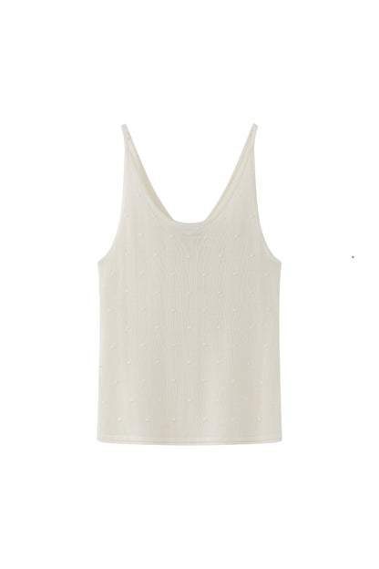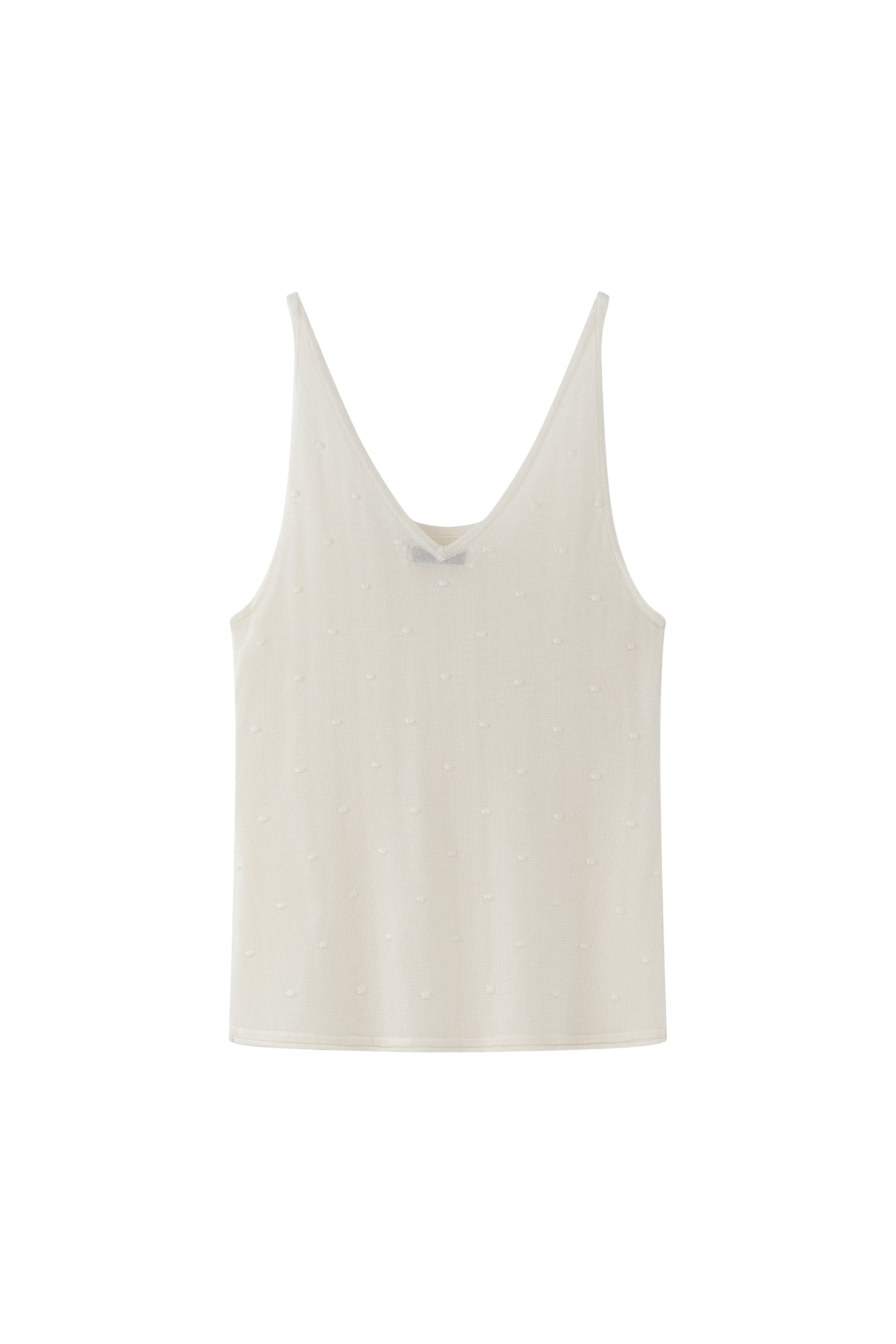 Lightweight knit tank featuring delicate dot details and fine straps. Designed for versatility, it can be worn on either side, offering the choice between a V-neck or a U-neck front.
