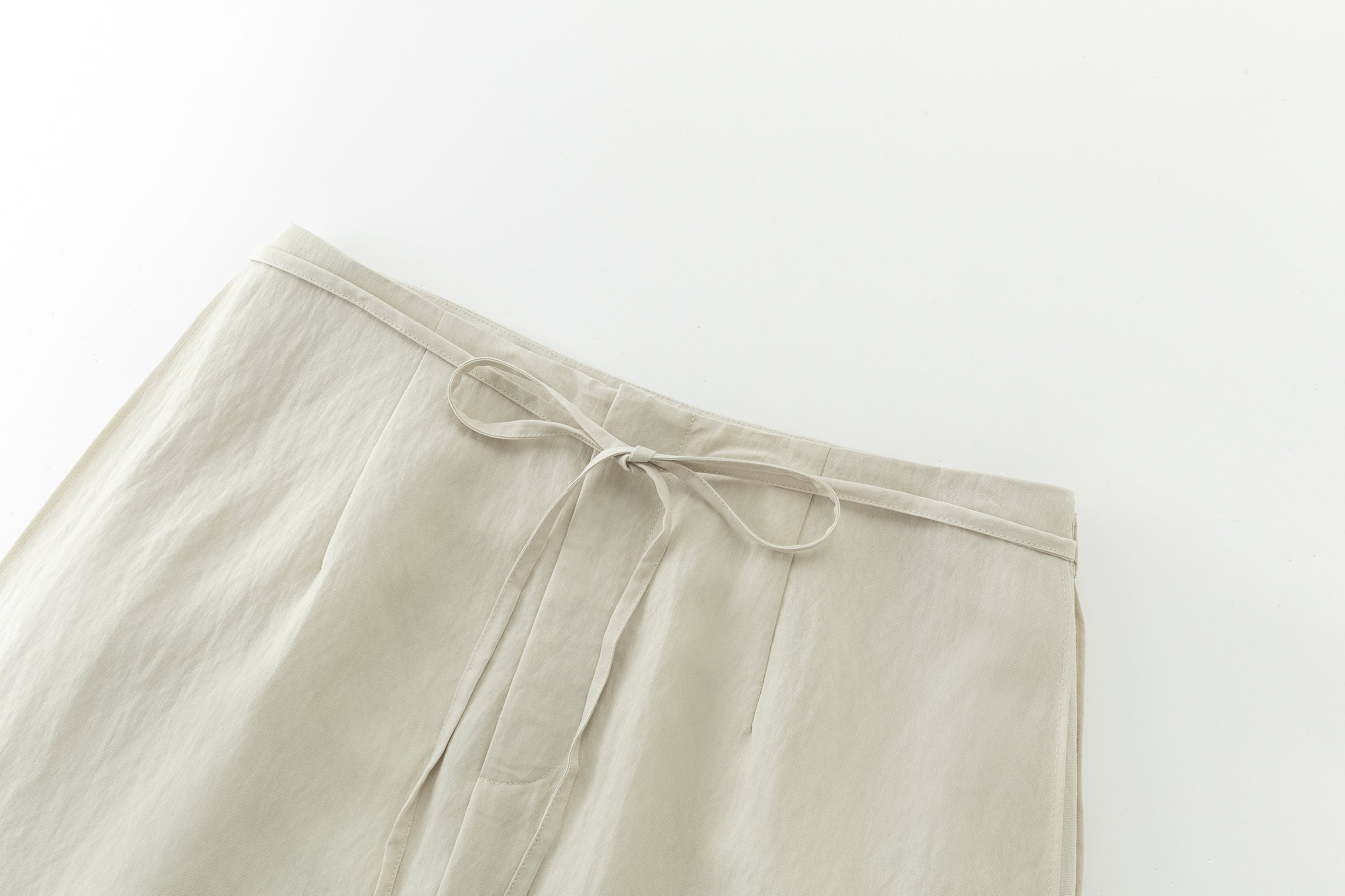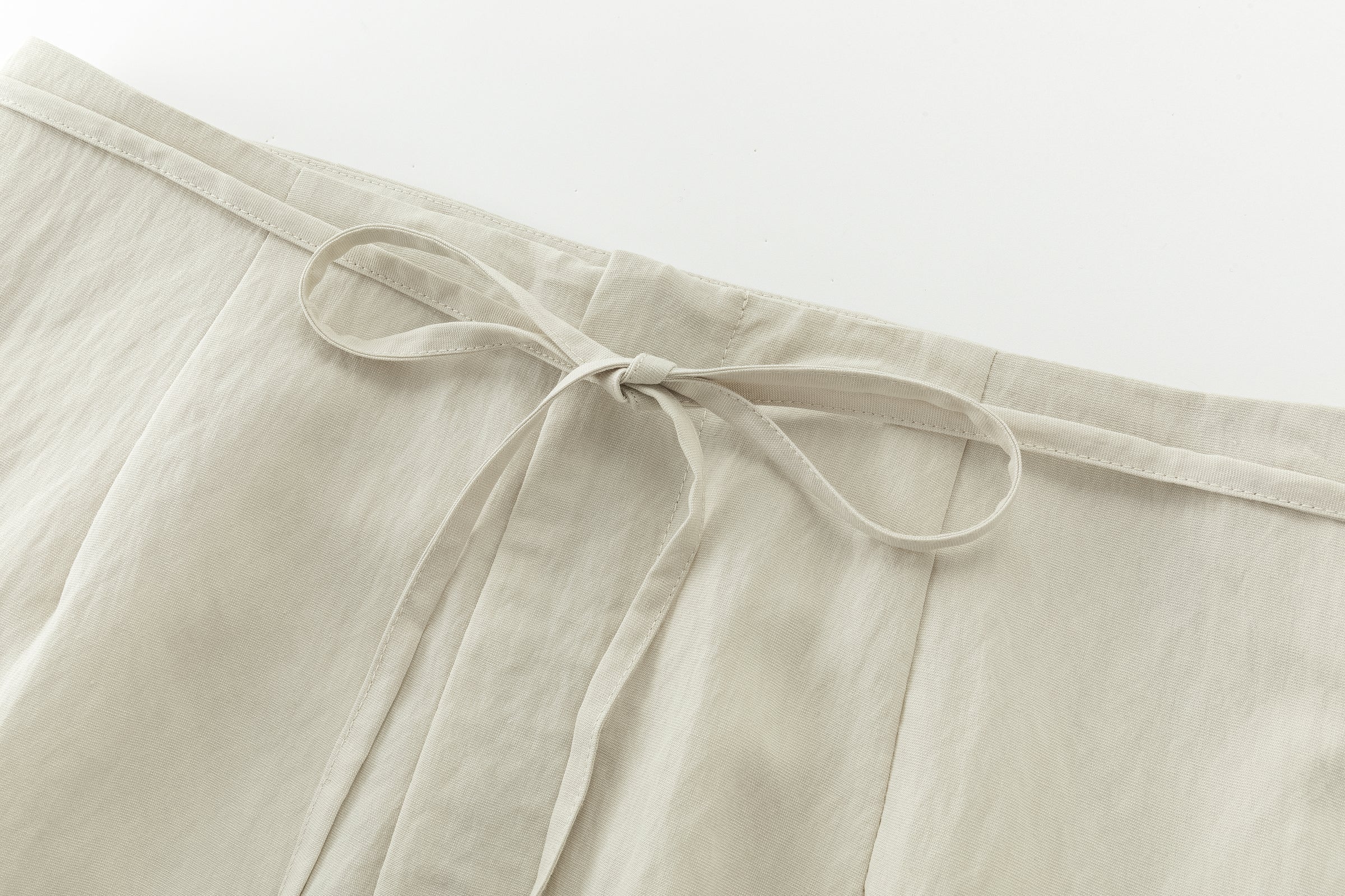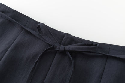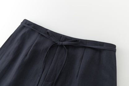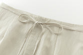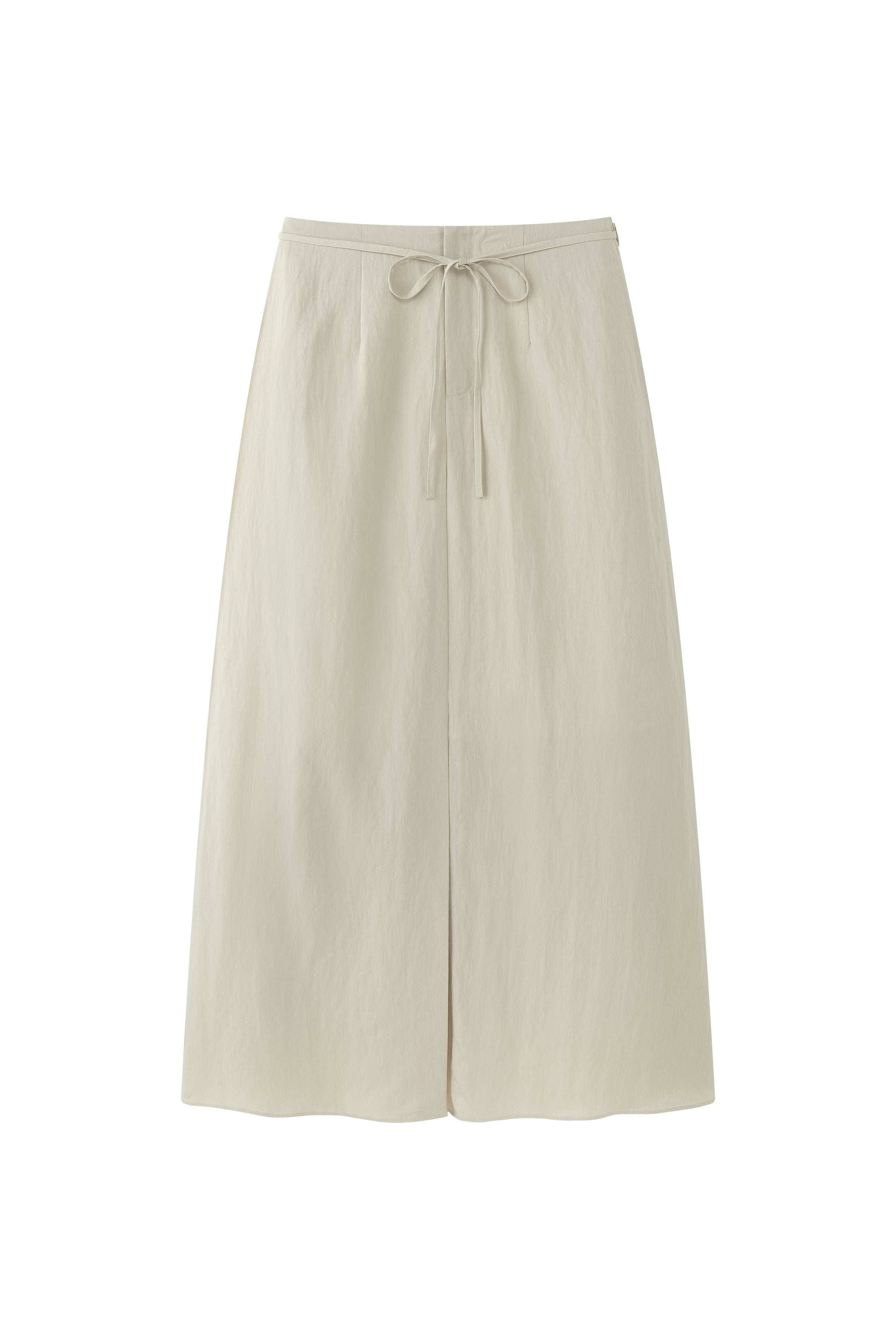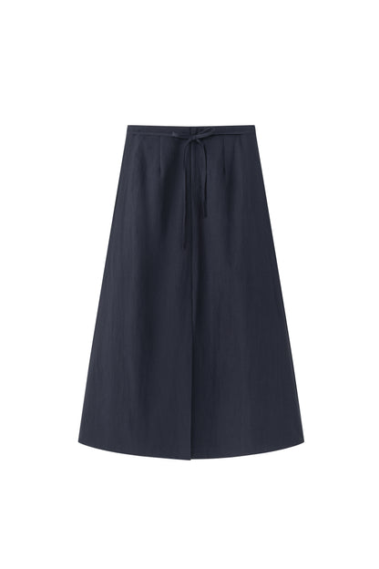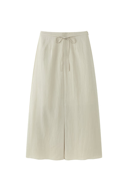 Wide skirt crafted in lightweight fabric with a fluid drape. Designed with a front slit for ease and movement, and adjustable side ties.