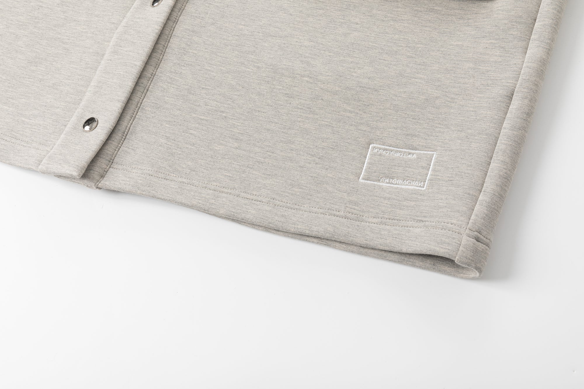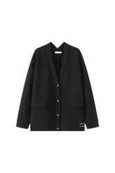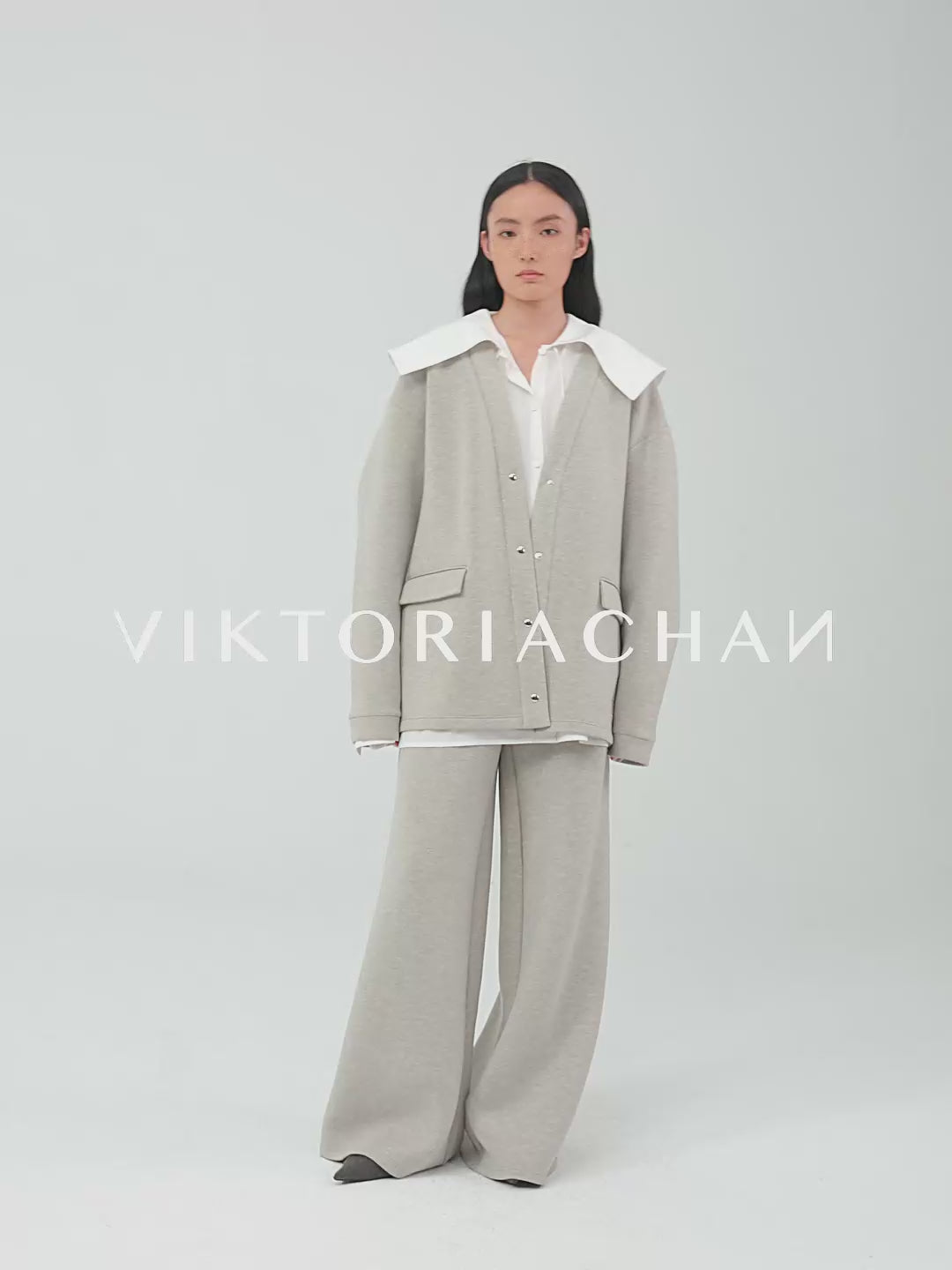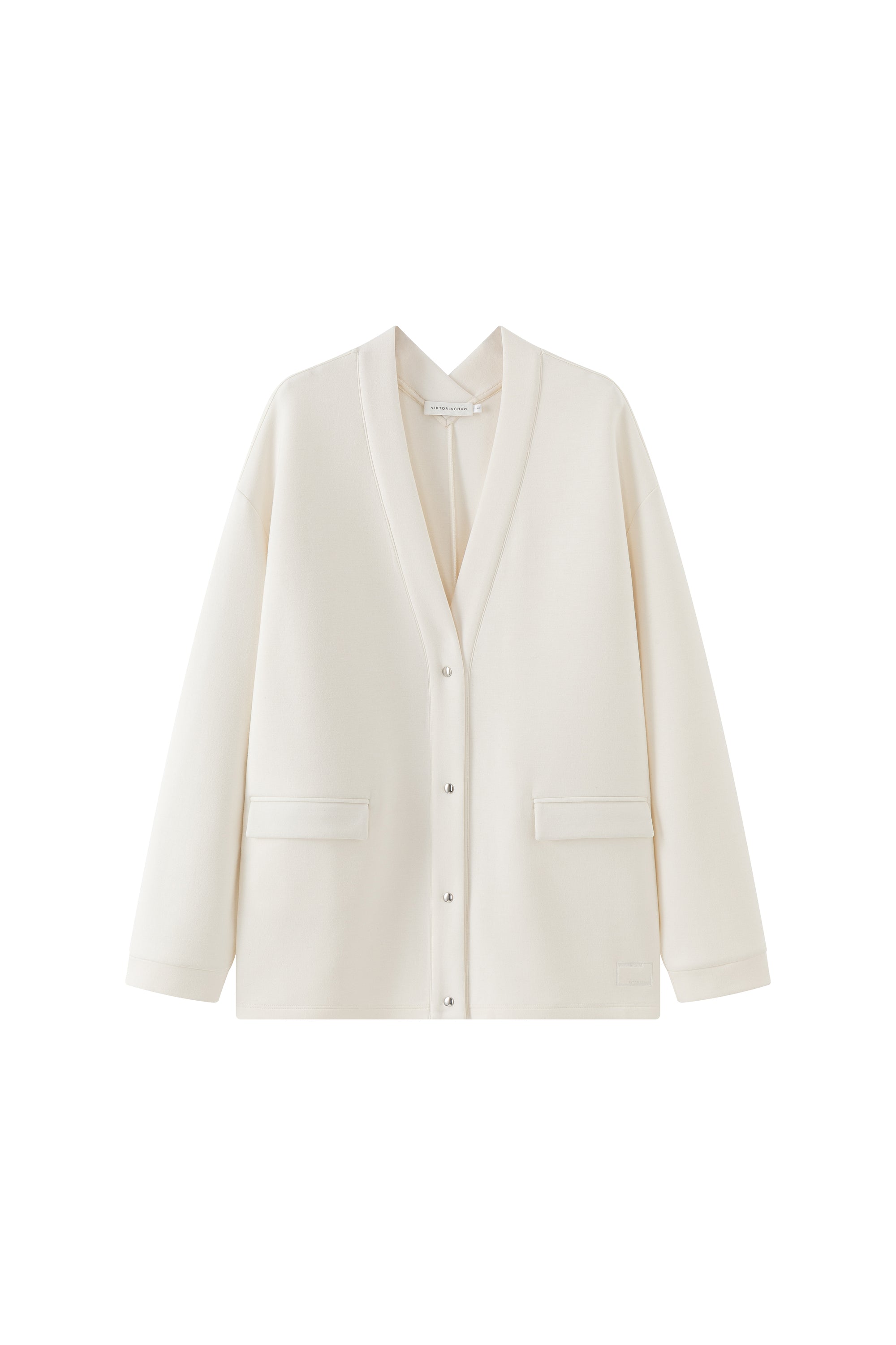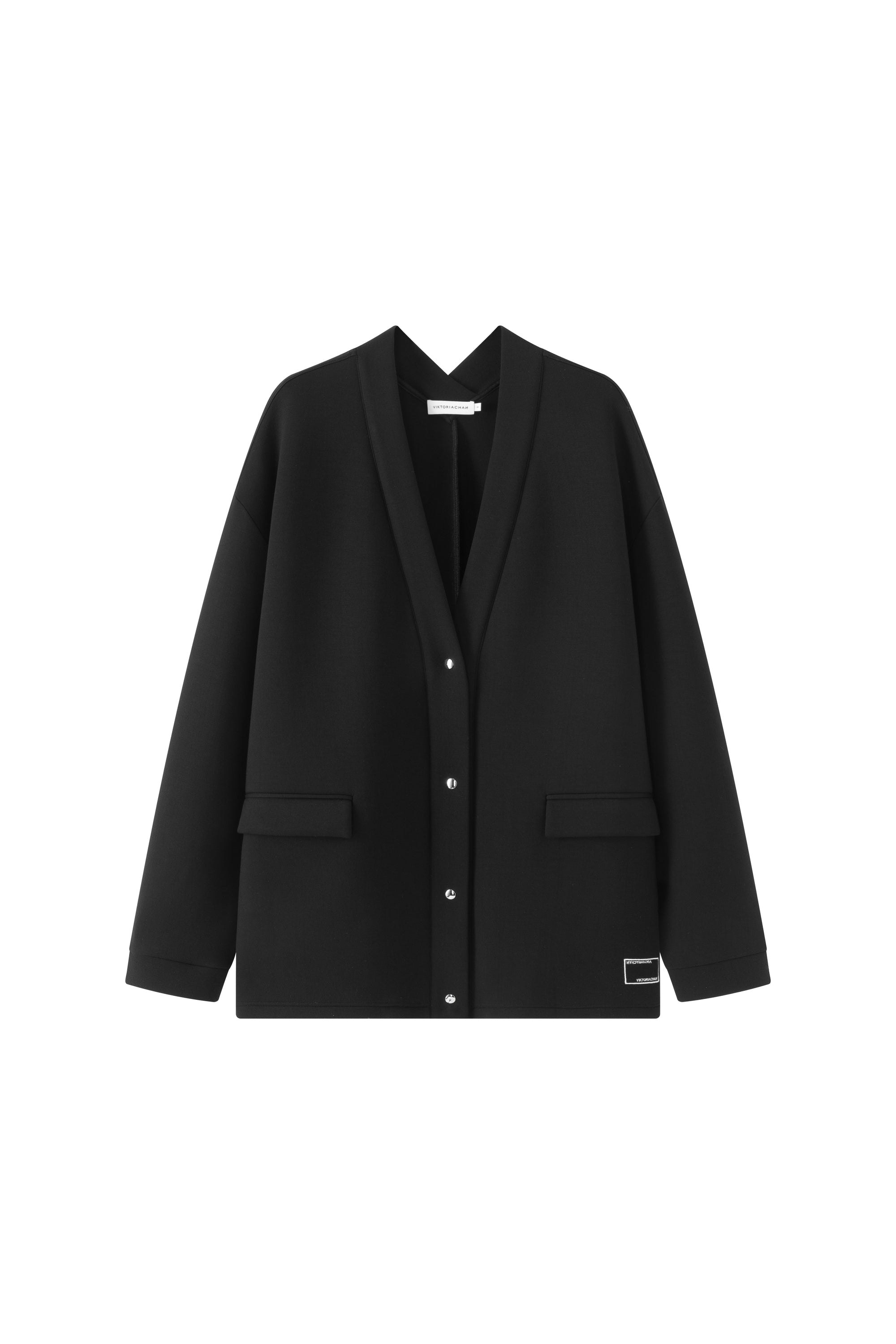 Oversized V-neck cardigan with metallic press buttoned-up front. Flap front pockets.