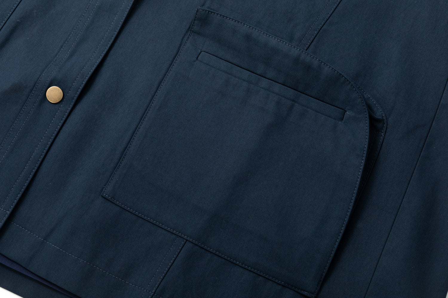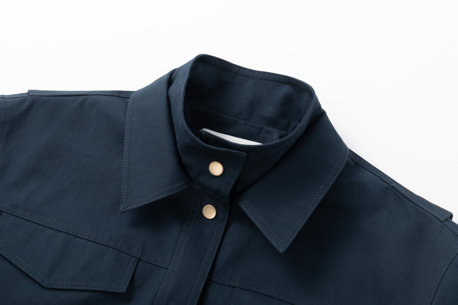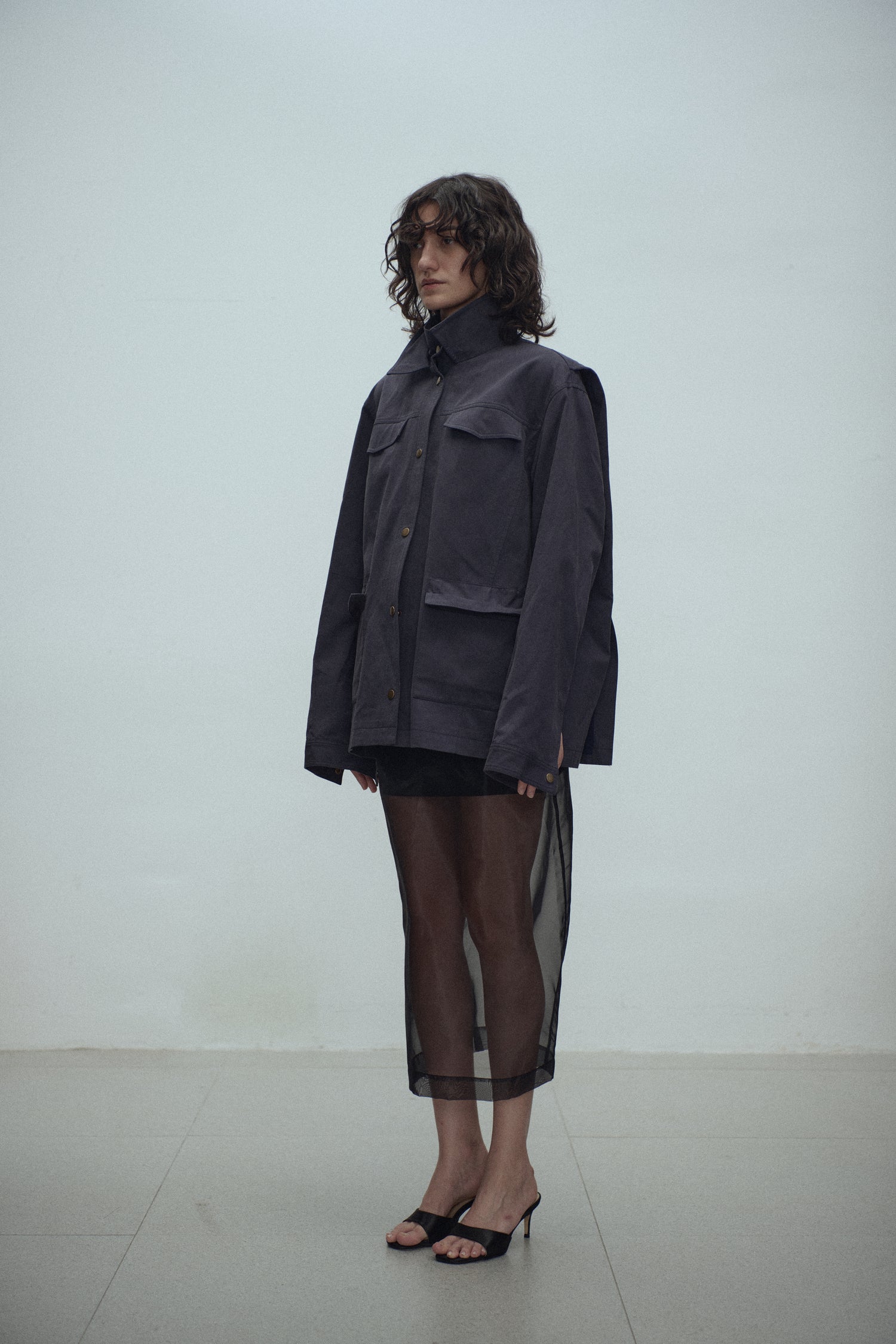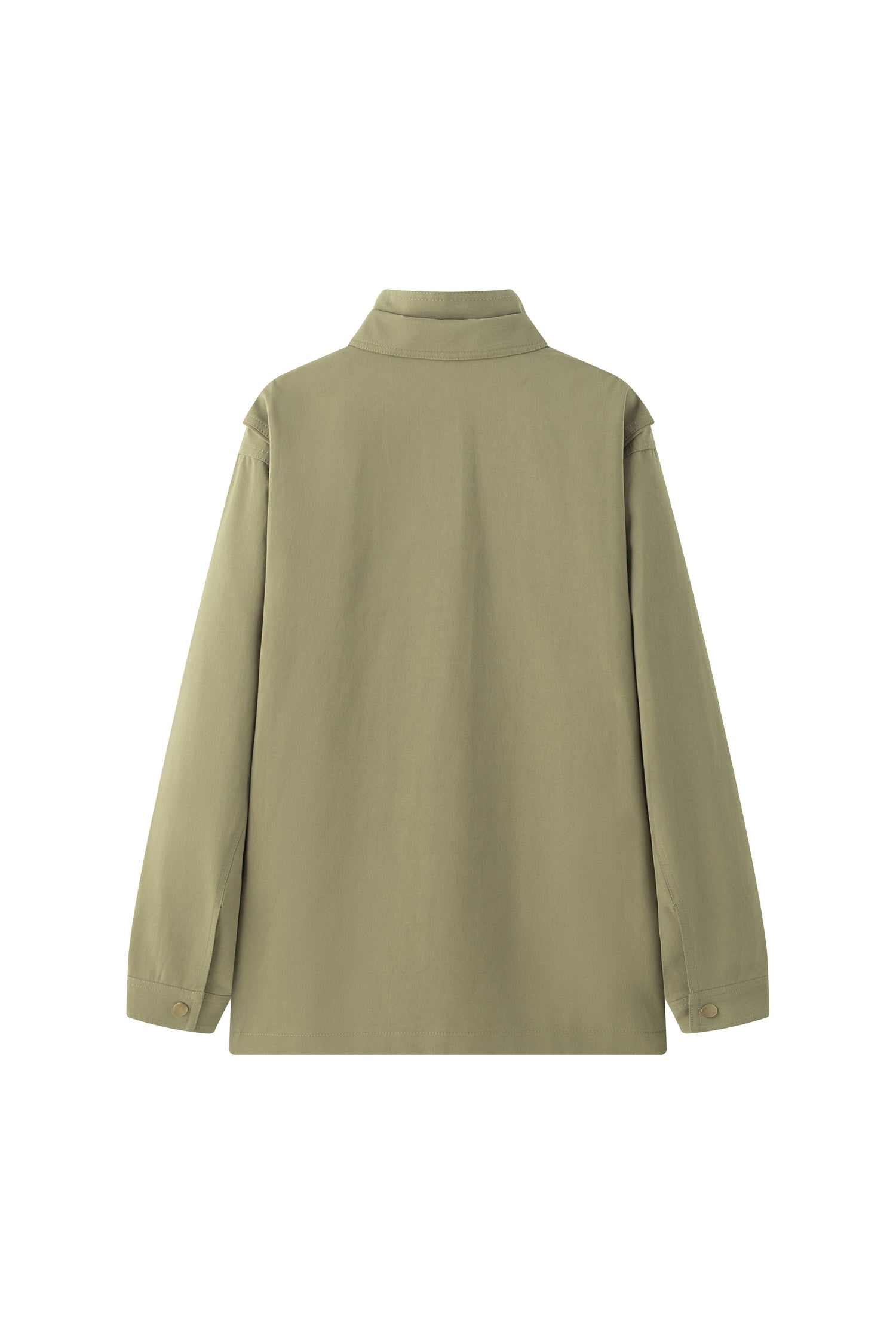A structured windbreaker with a high collar and zipper design, and four parallel pockets for enhanced functionality.