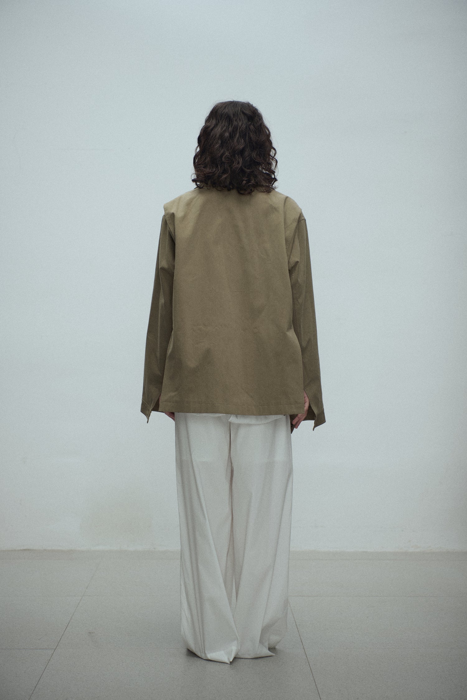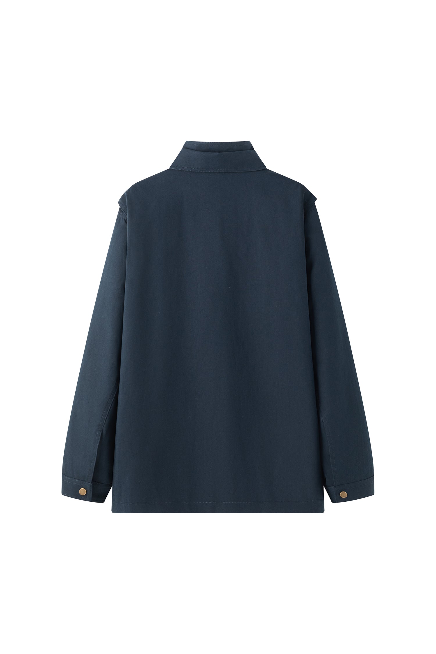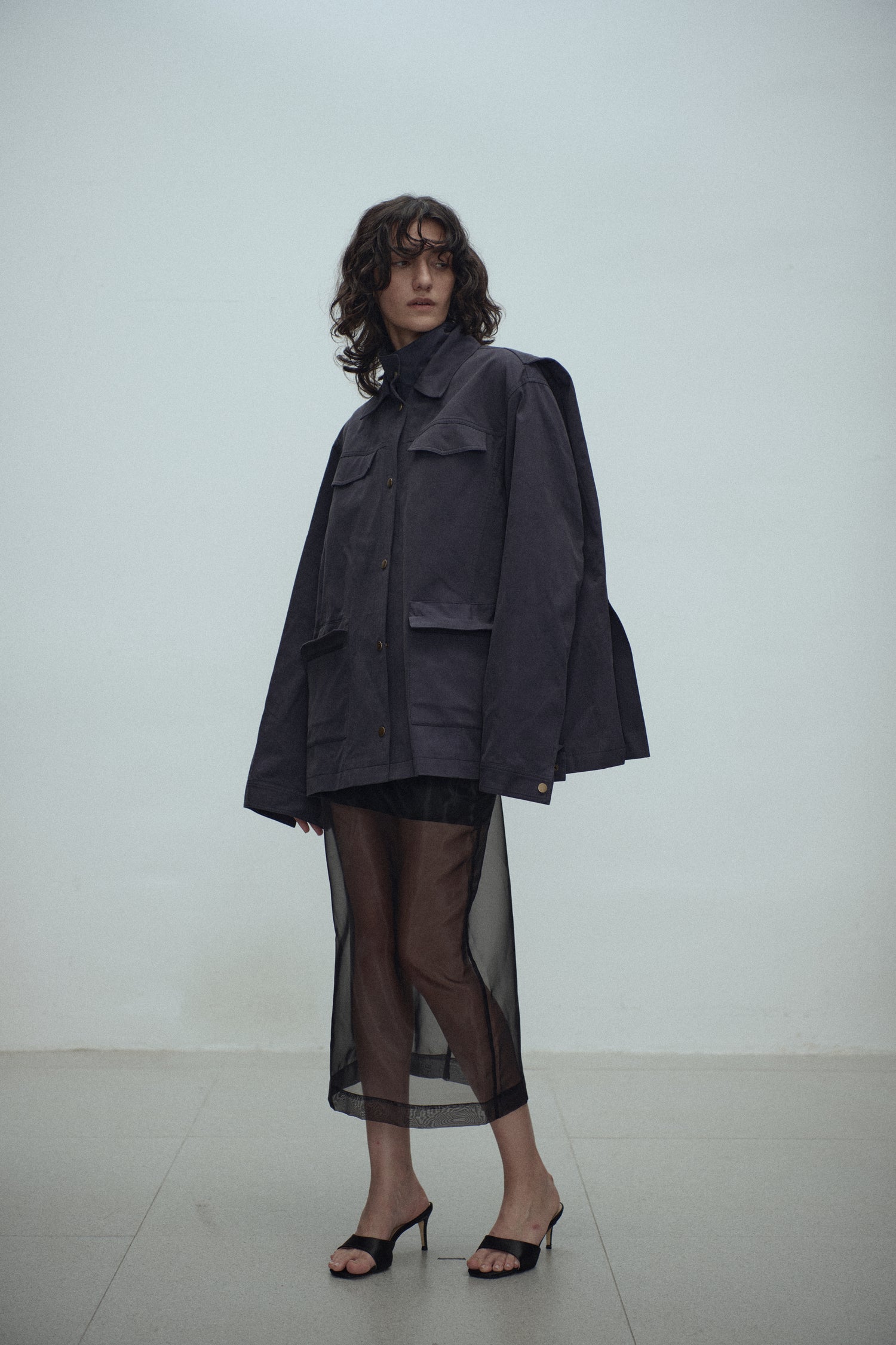 A structured windbreaker with a high collar and zipper design, and four parallel pockets for enhanced functionality.
