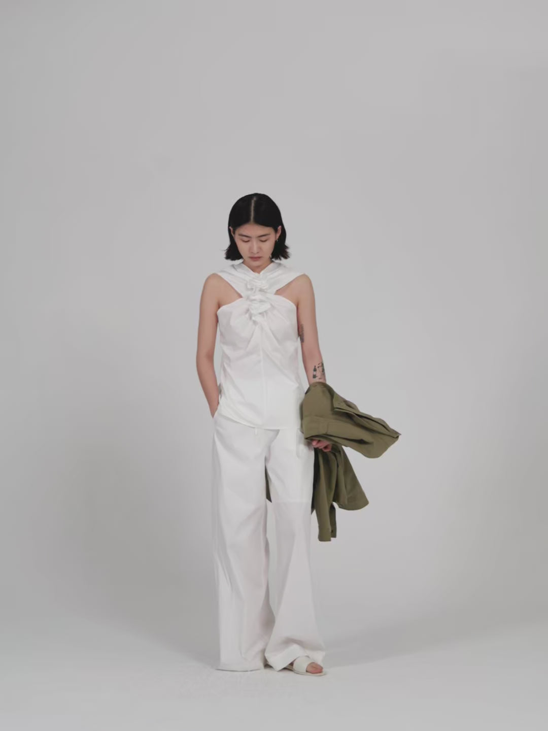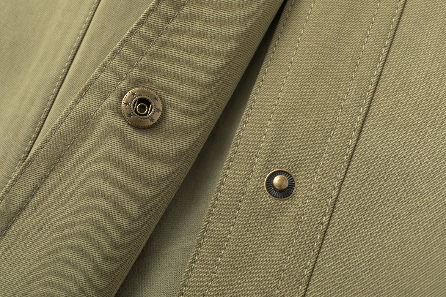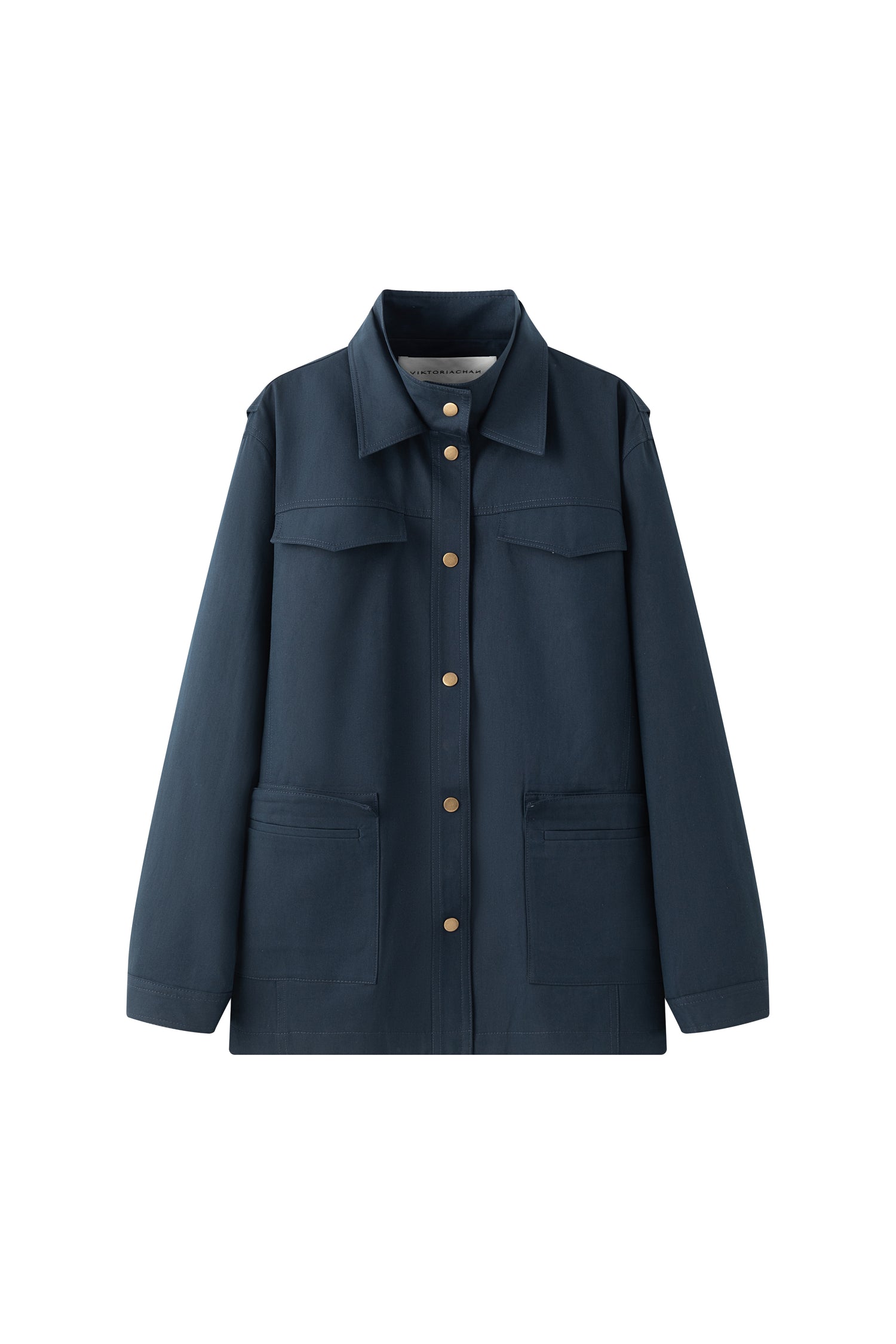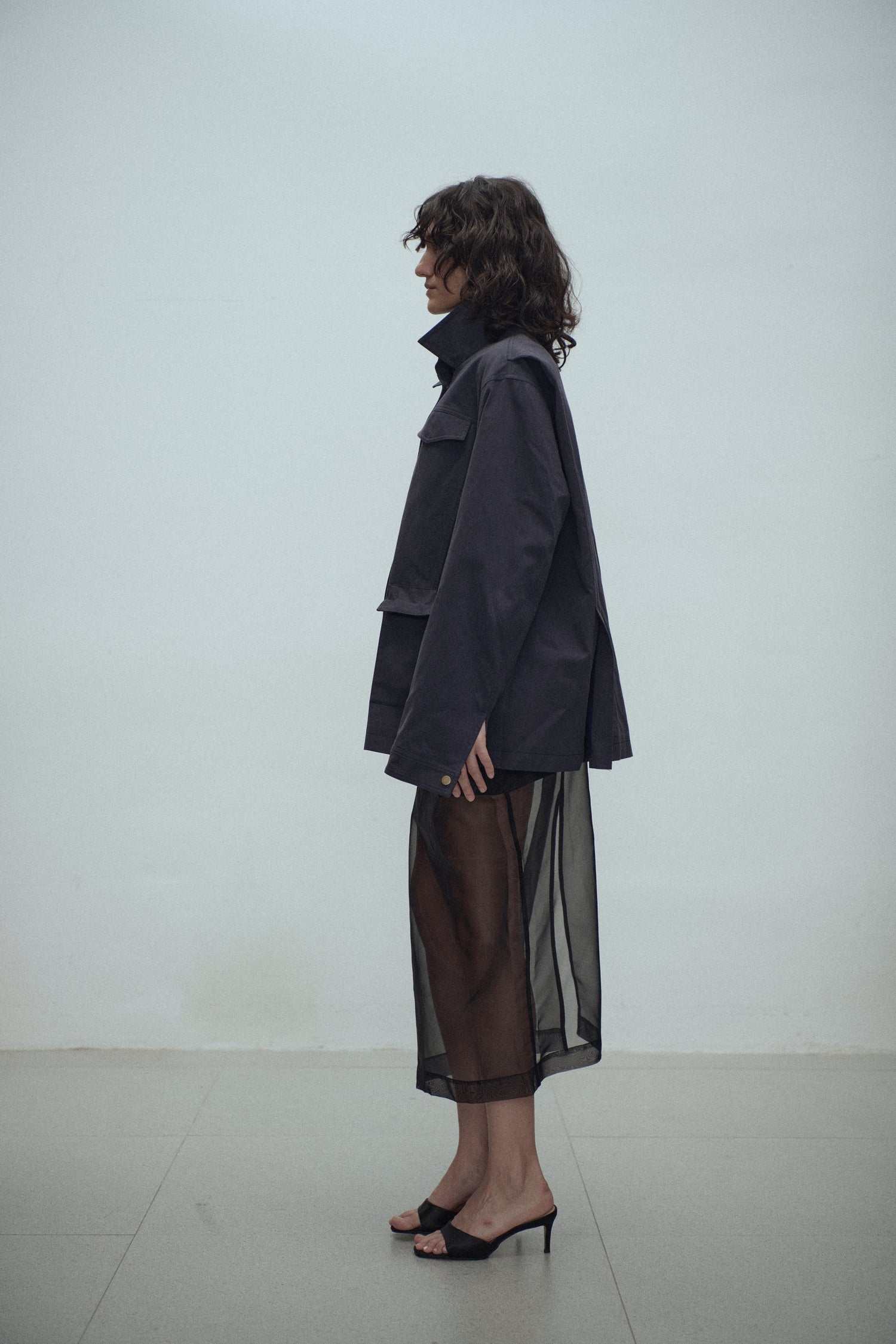 A structured windbreaker with a high collar and zipper design, and four parallel pockets for enhanced functionality.