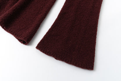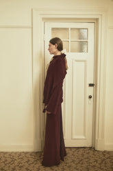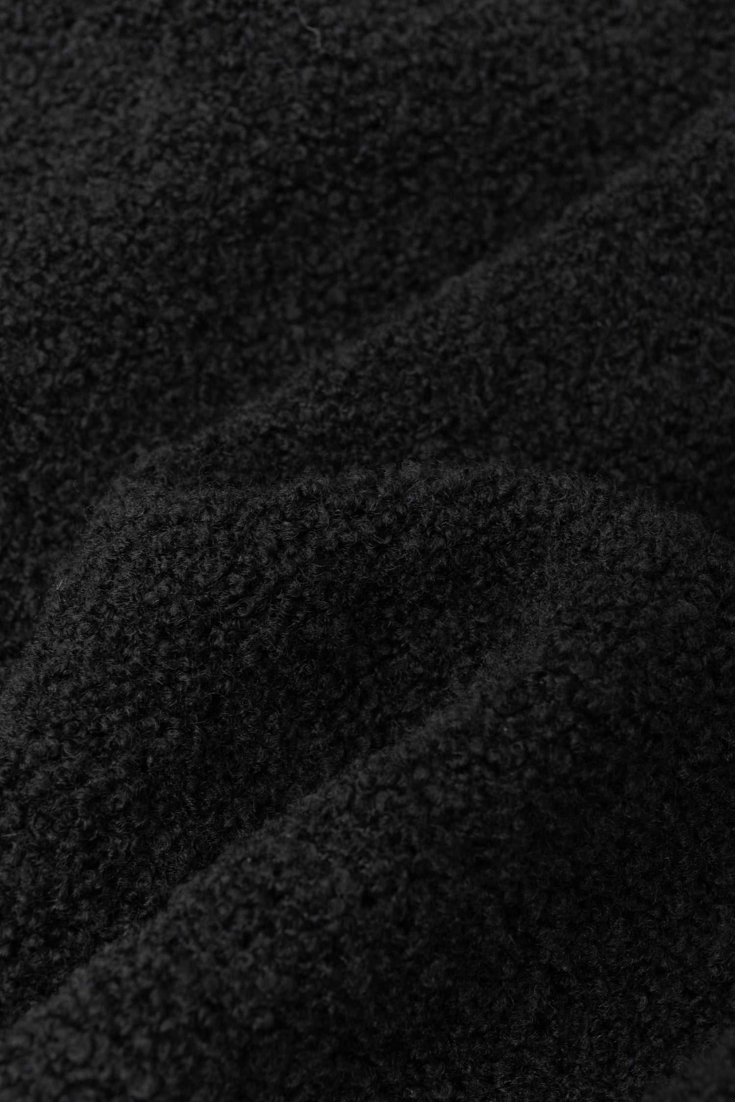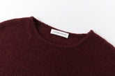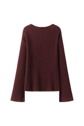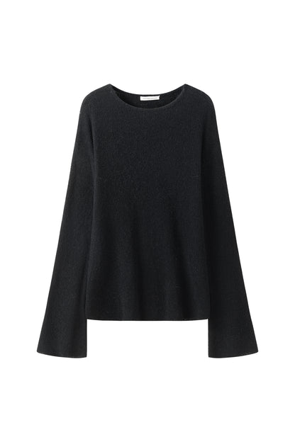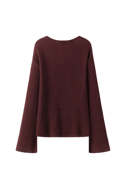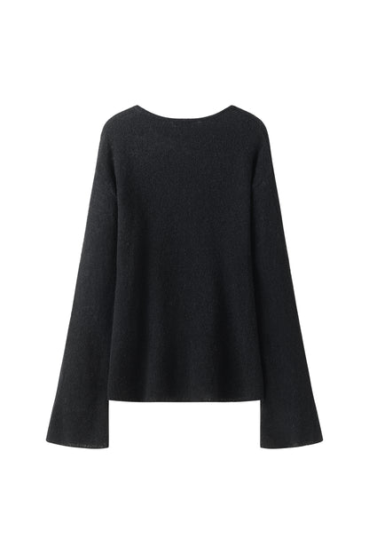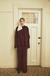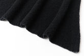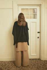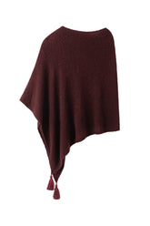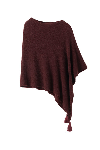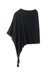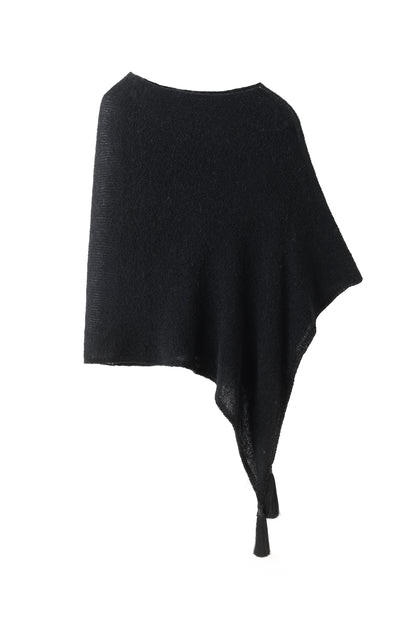 Oversized knit wool pullover featuring an over-the-top, cape-like silhouette with a diagonal drape and a tassle. Designed with a slightly wide, high neckline.