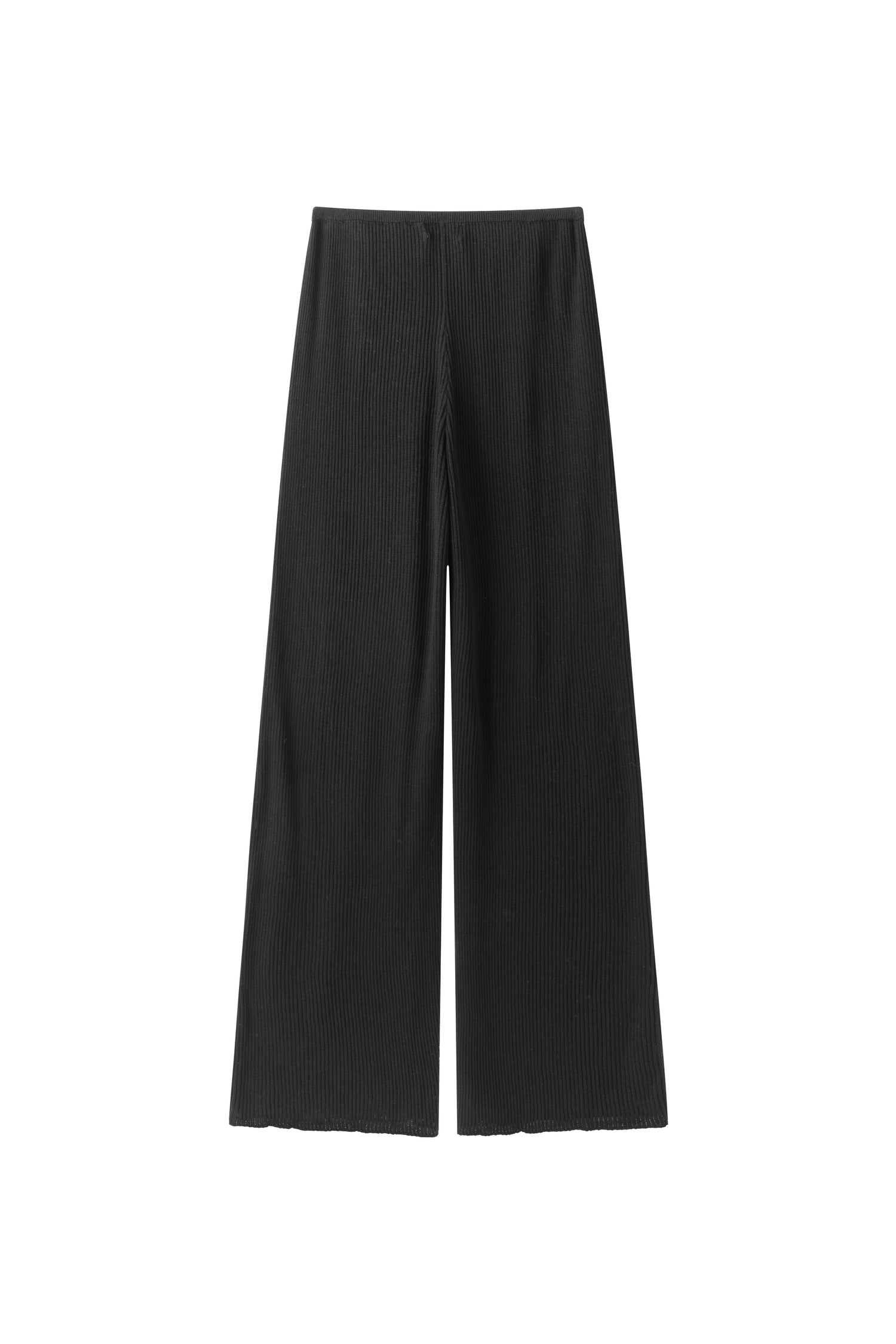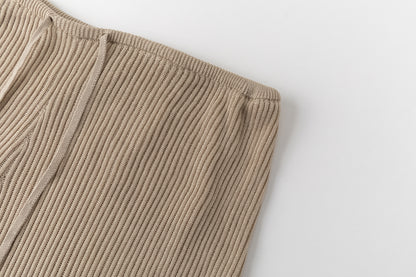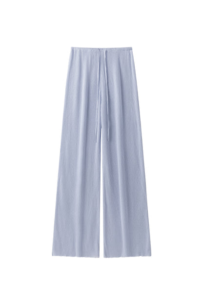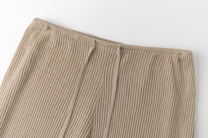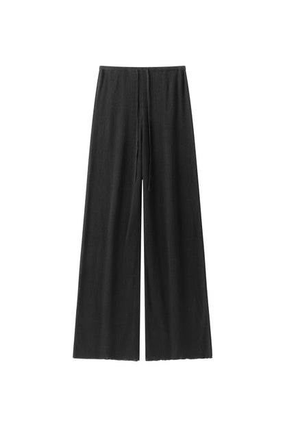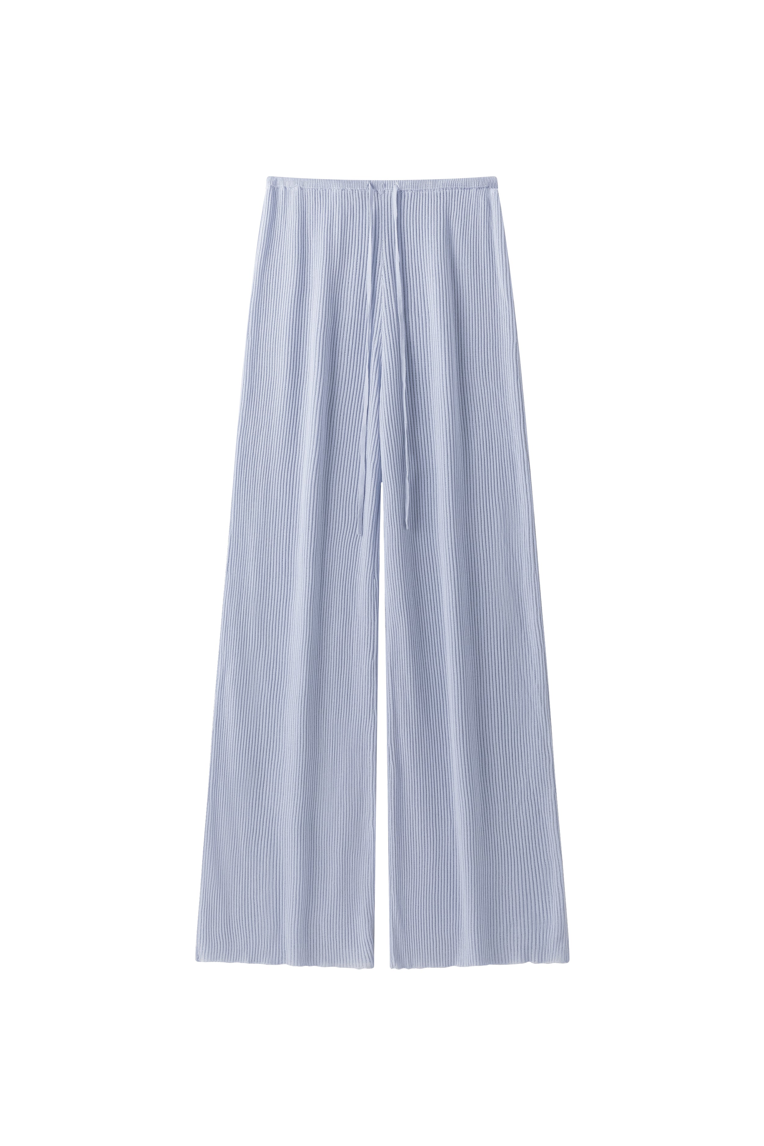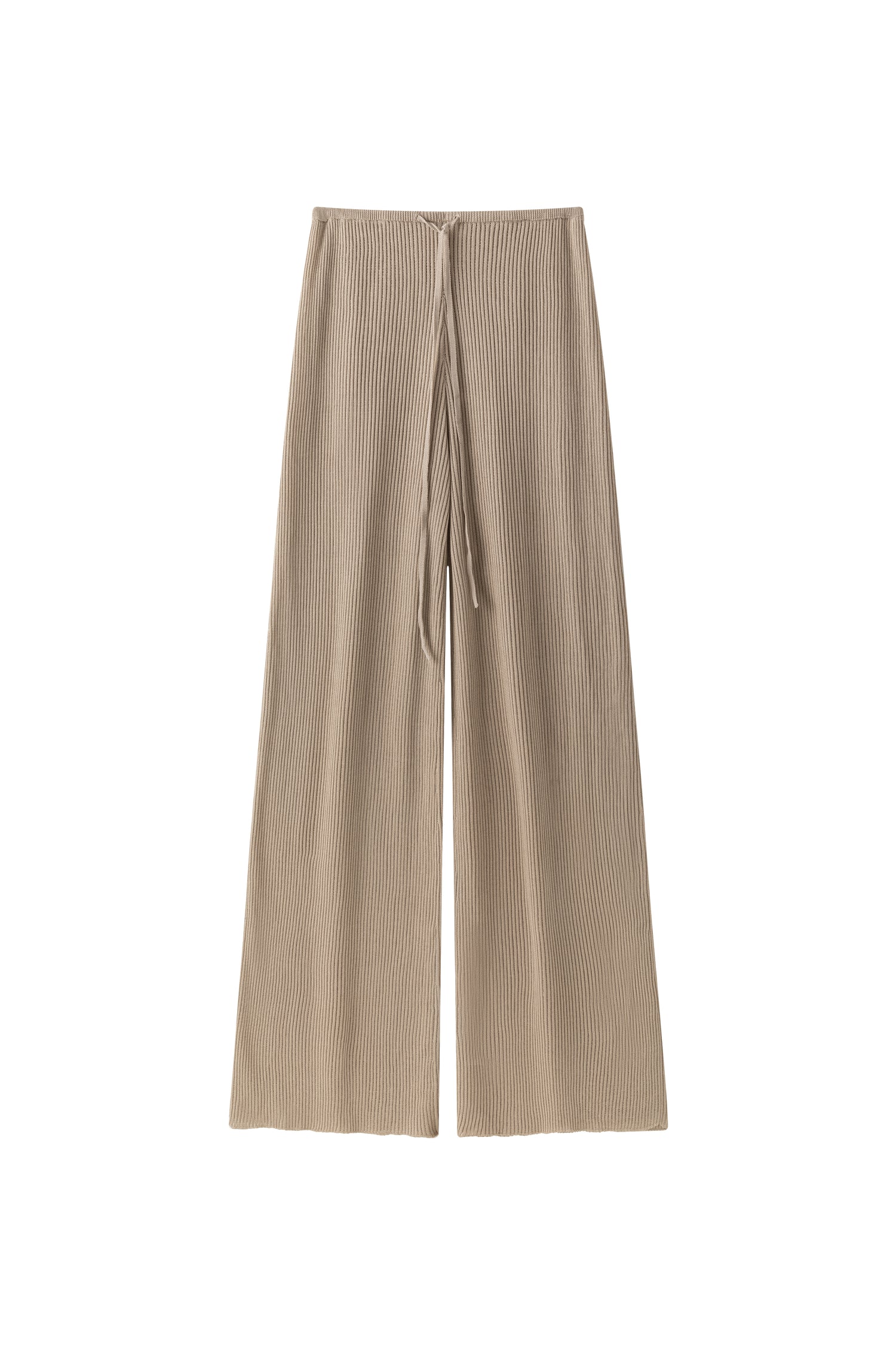 Relaxed ribbed knit trousers with a soft, fluid feel. Adjustable tie at the waist for a comfortable fit.