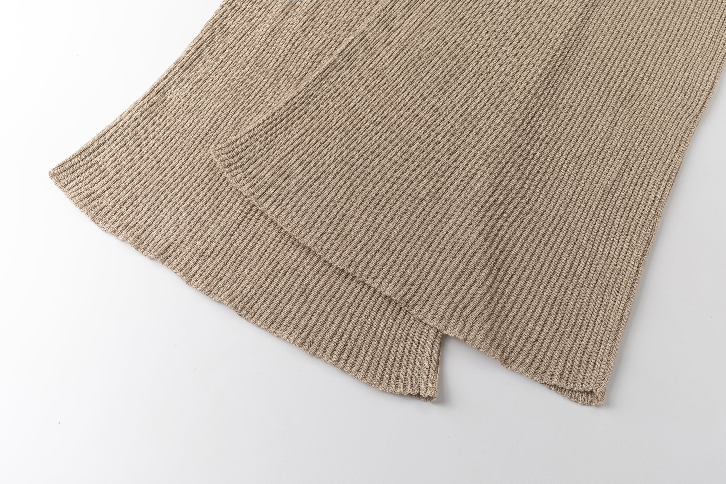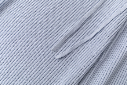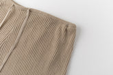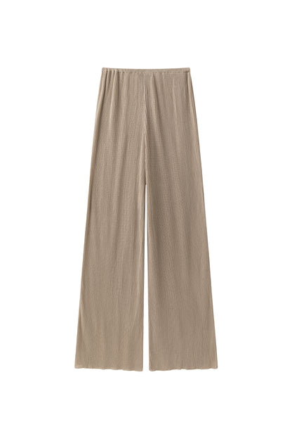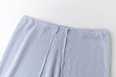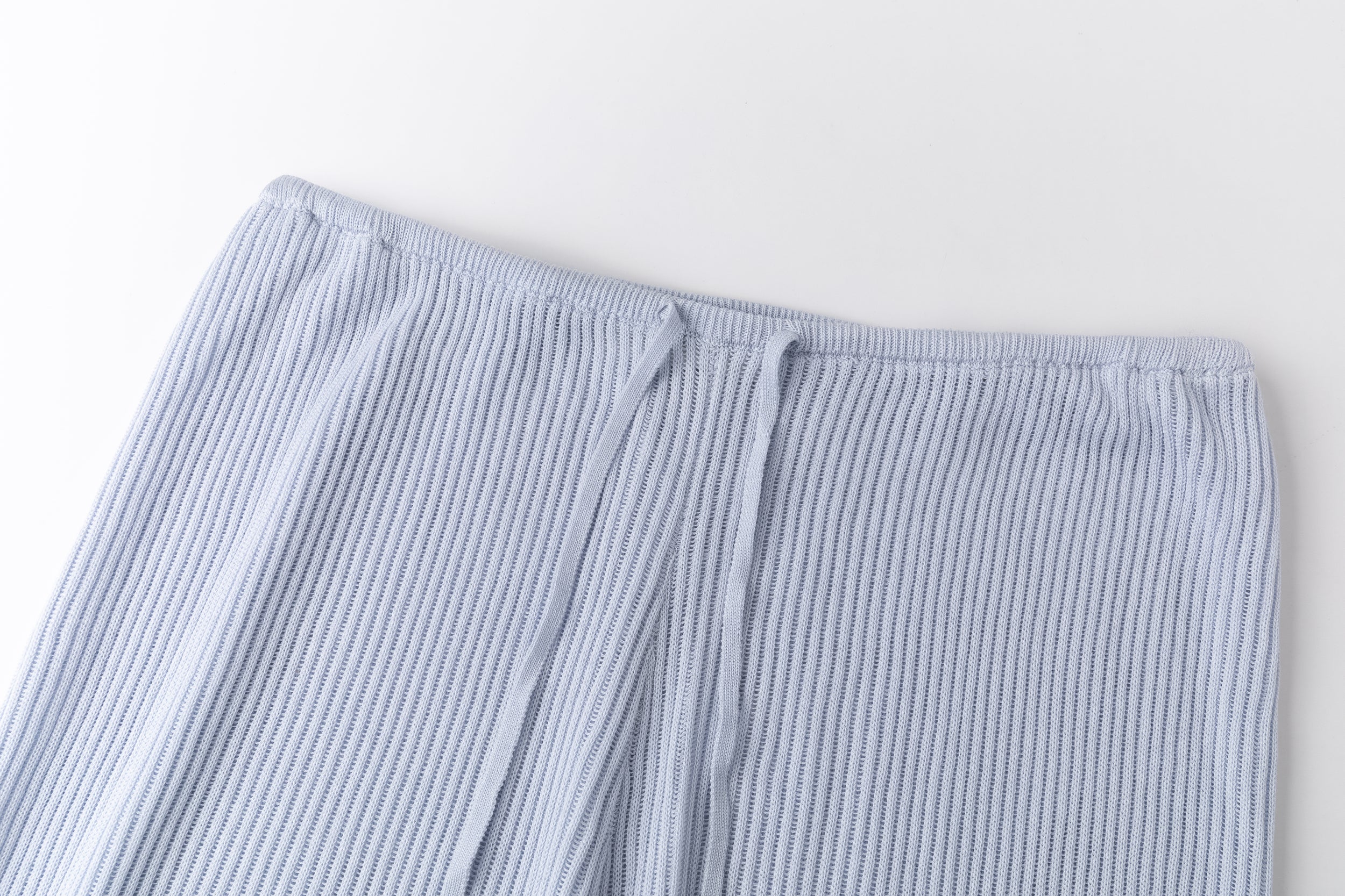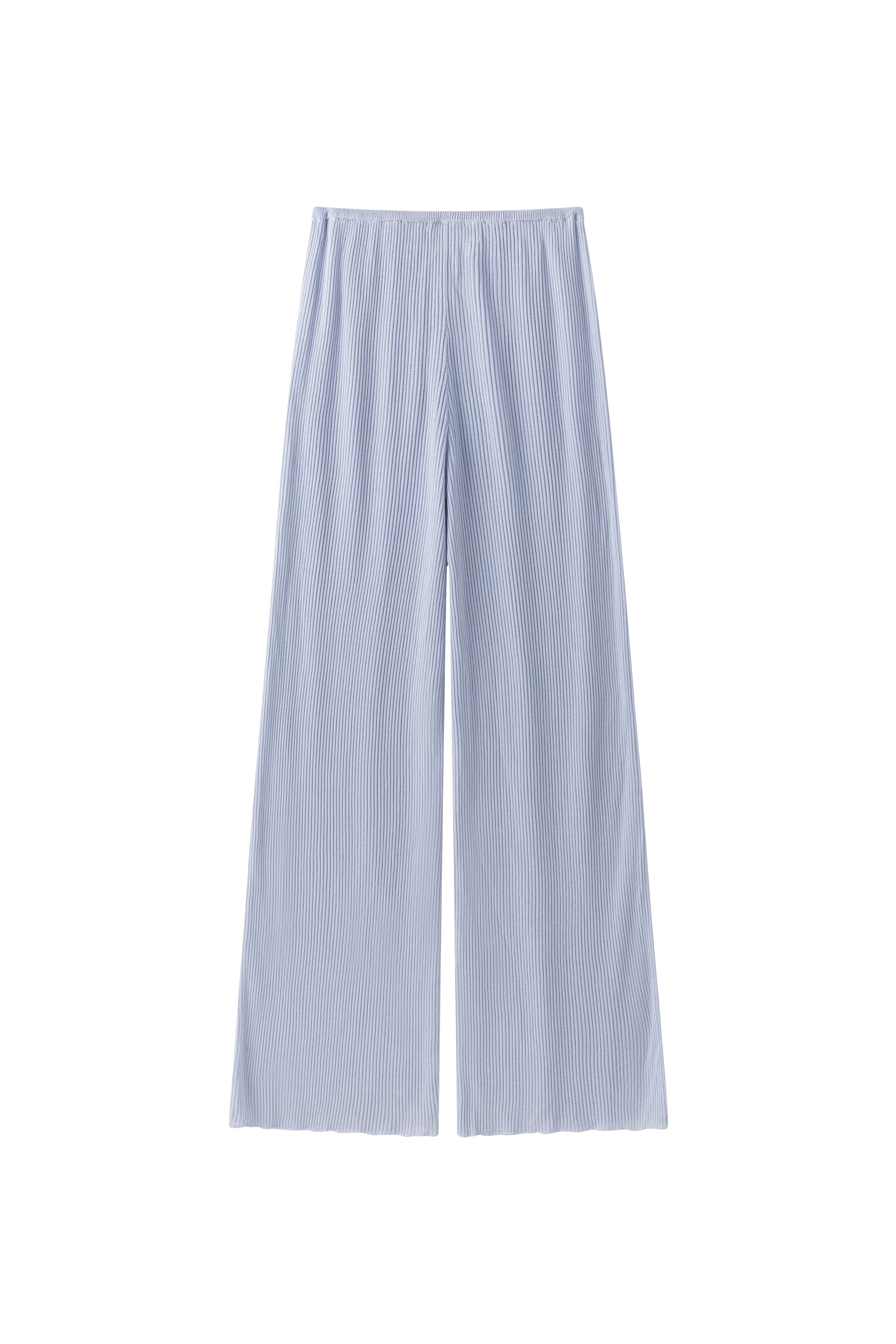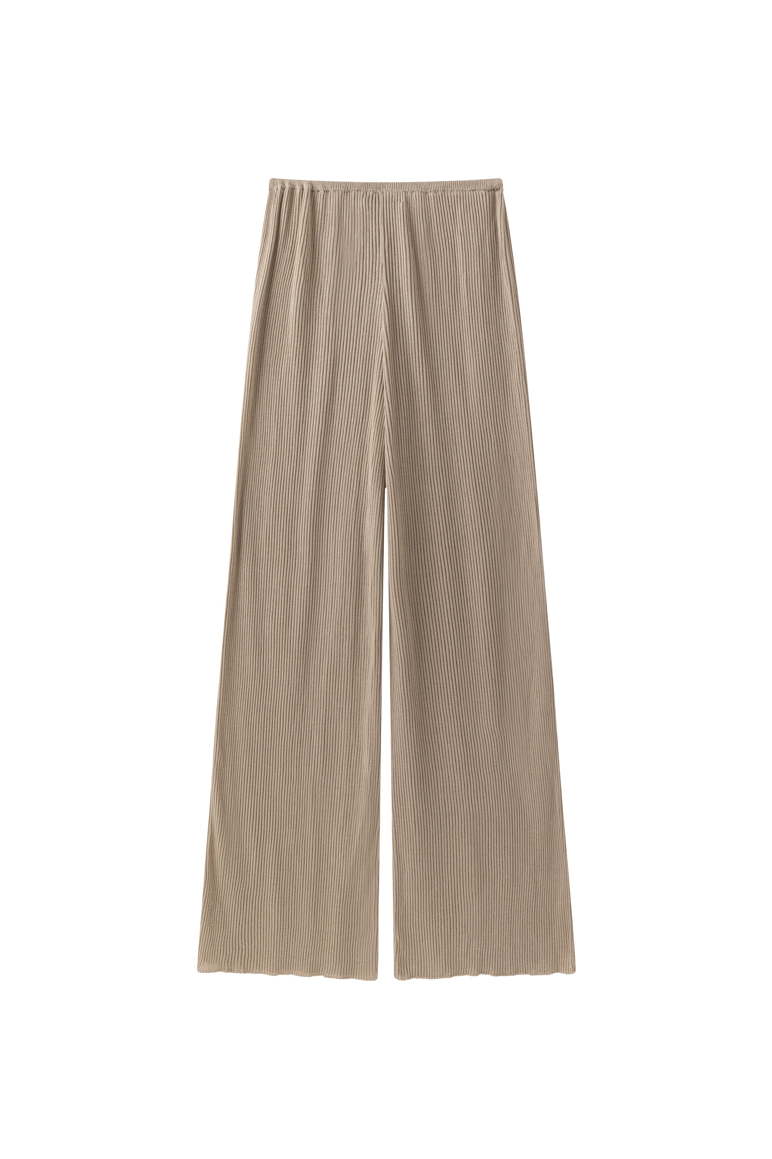 Relaxed ribbed knit trousers with a soft, fluid feel. Adjustable tie at the waist for a comfortable fit.