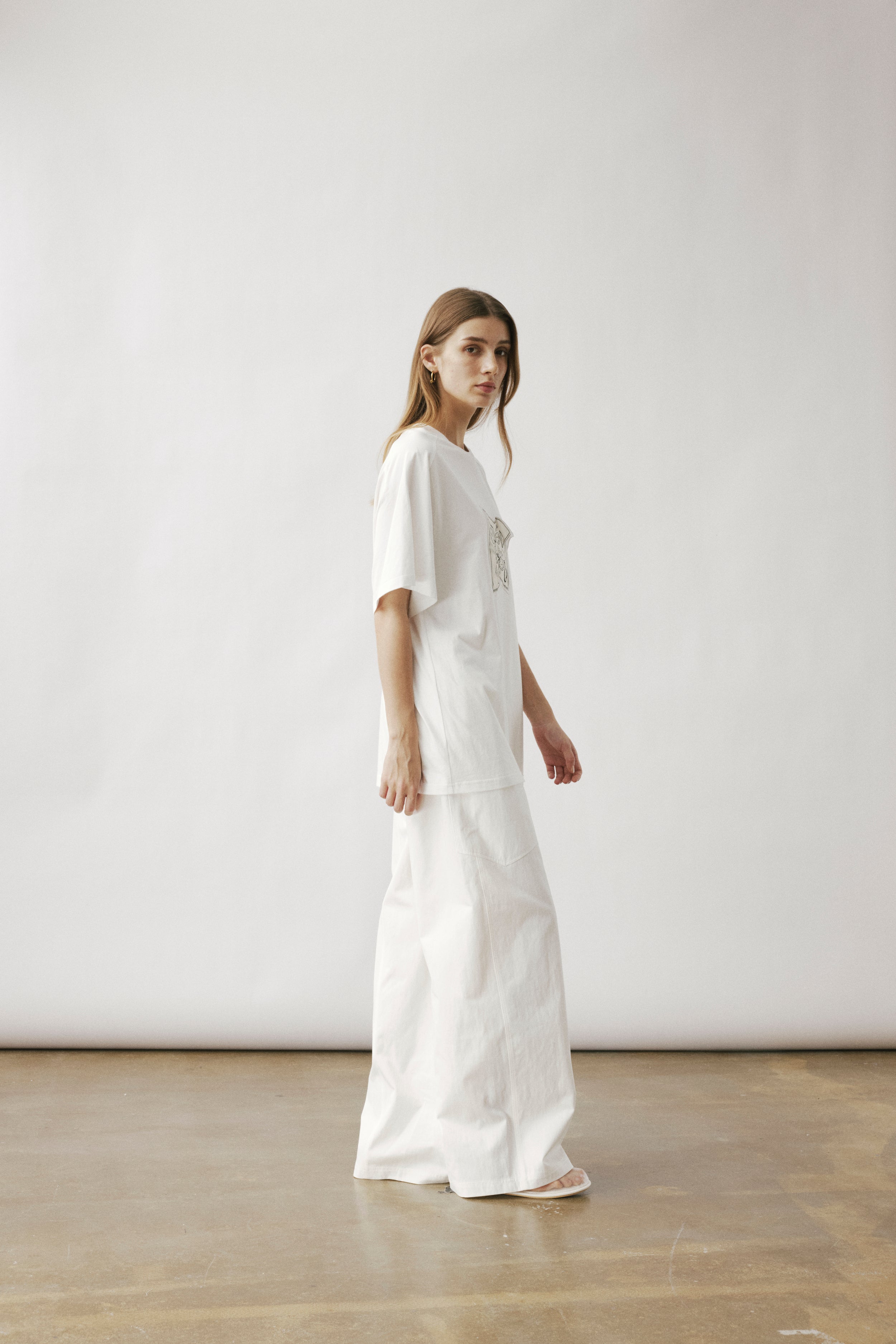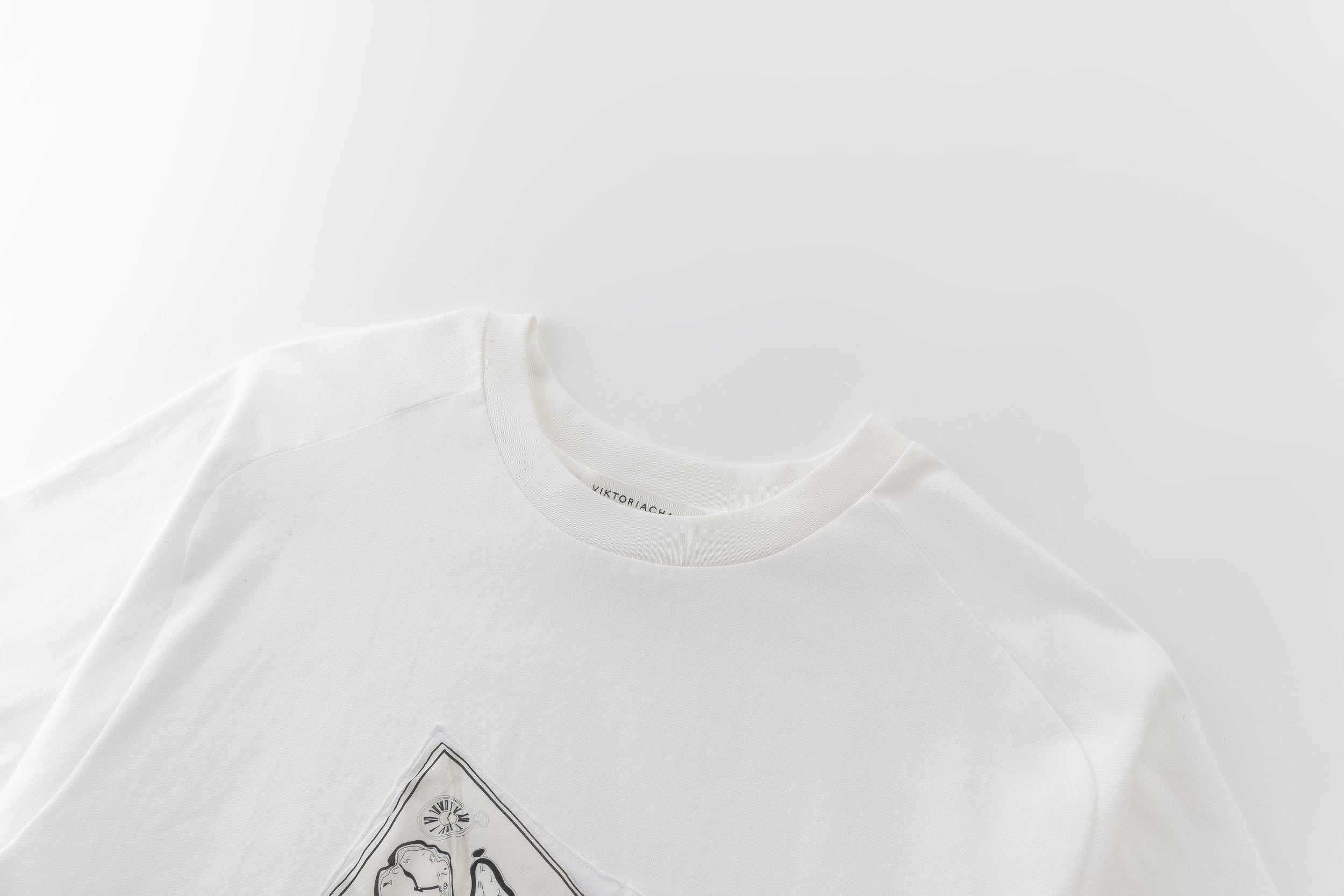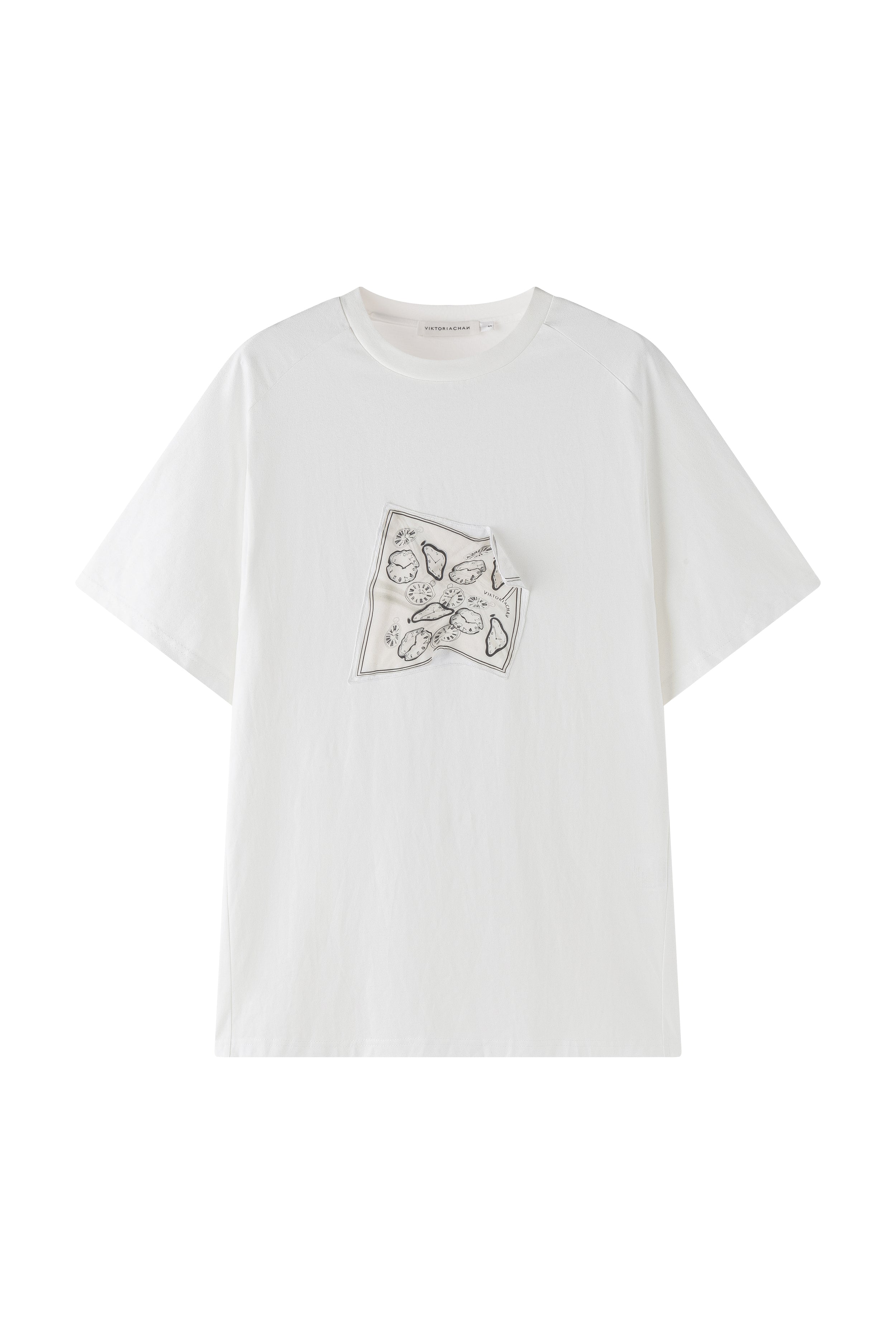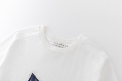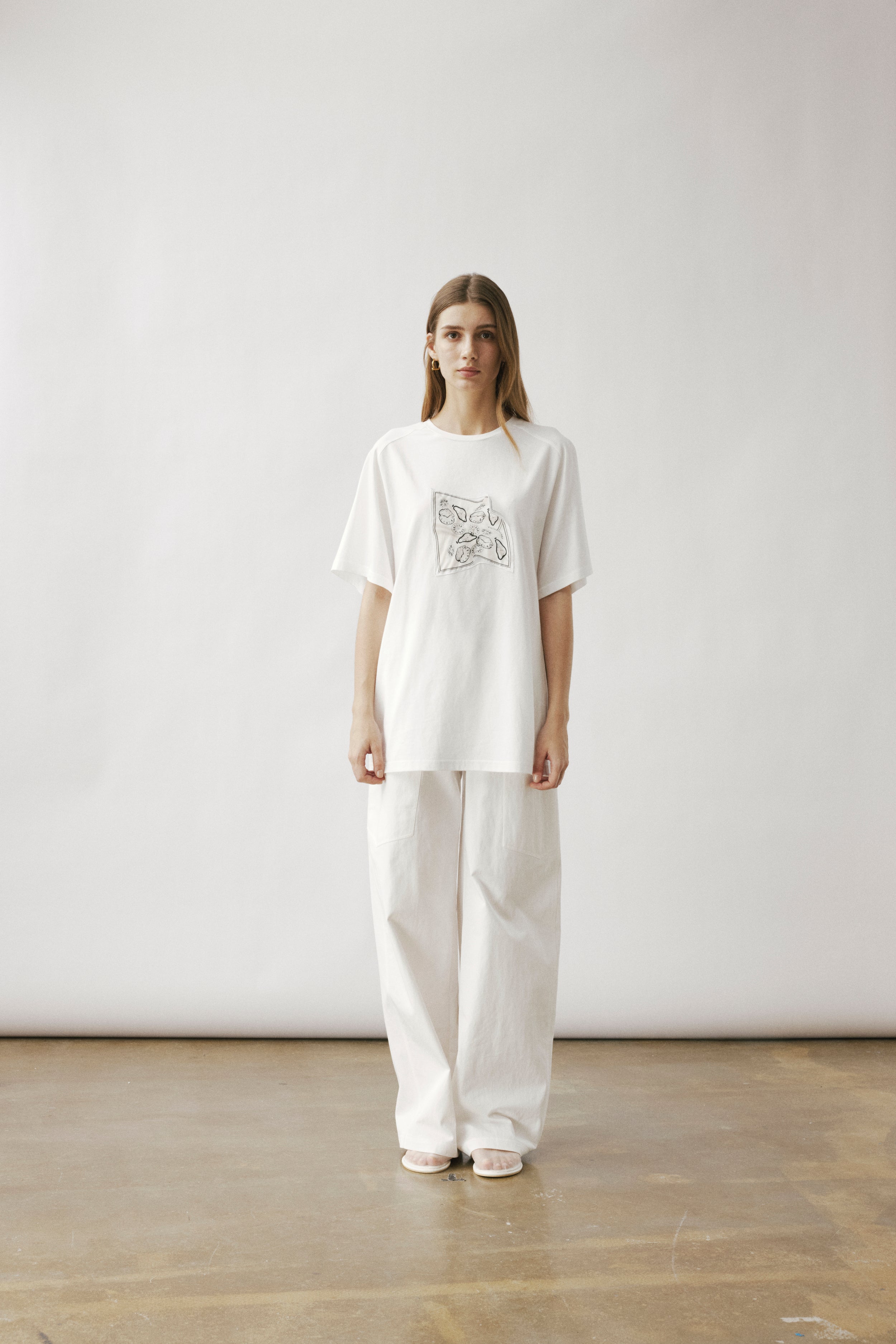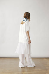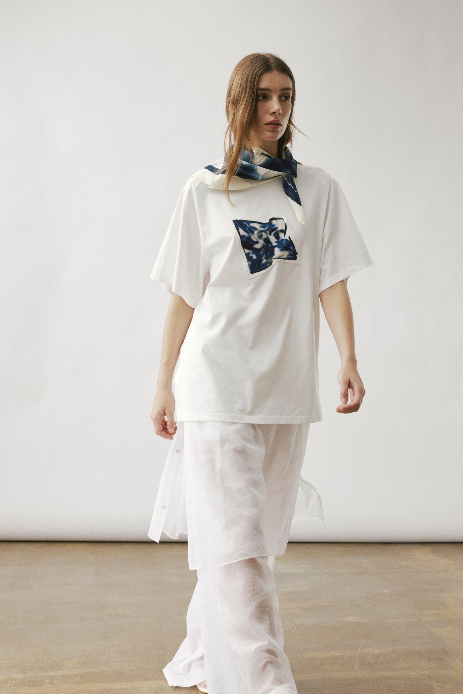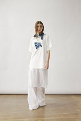 Oversized white T-shirt showcasing our printed carré scarf design, featuring the season’s emblematic shadow motif. Sewn printed patch leaving one edge free.