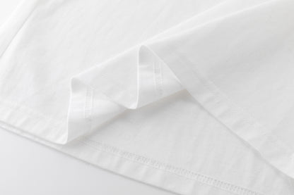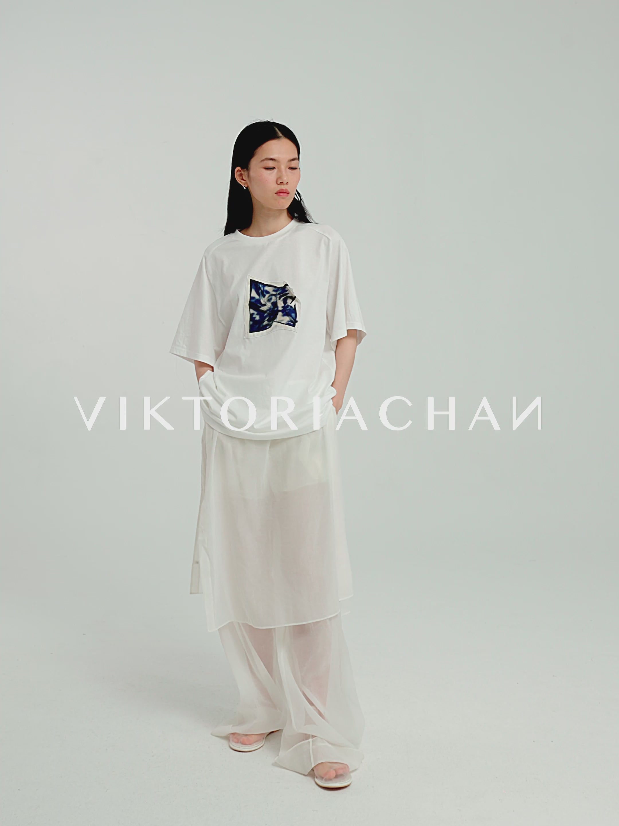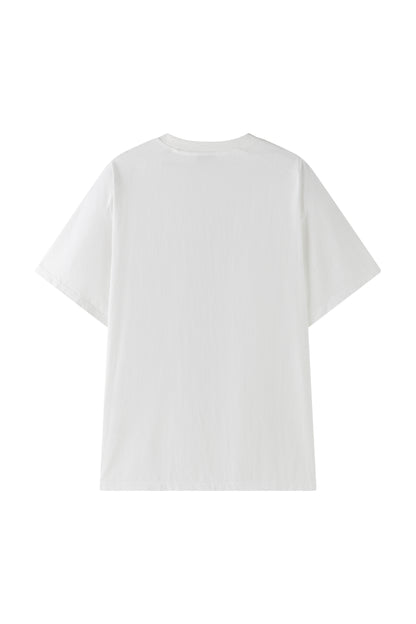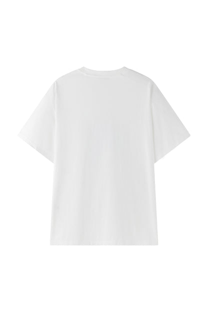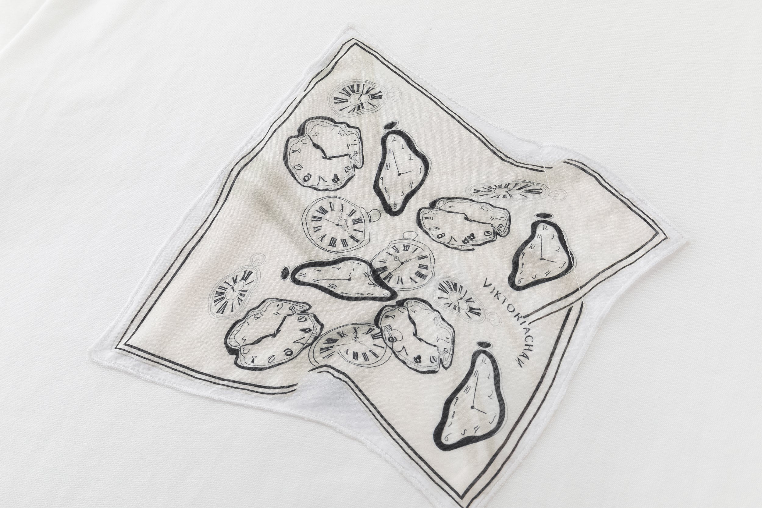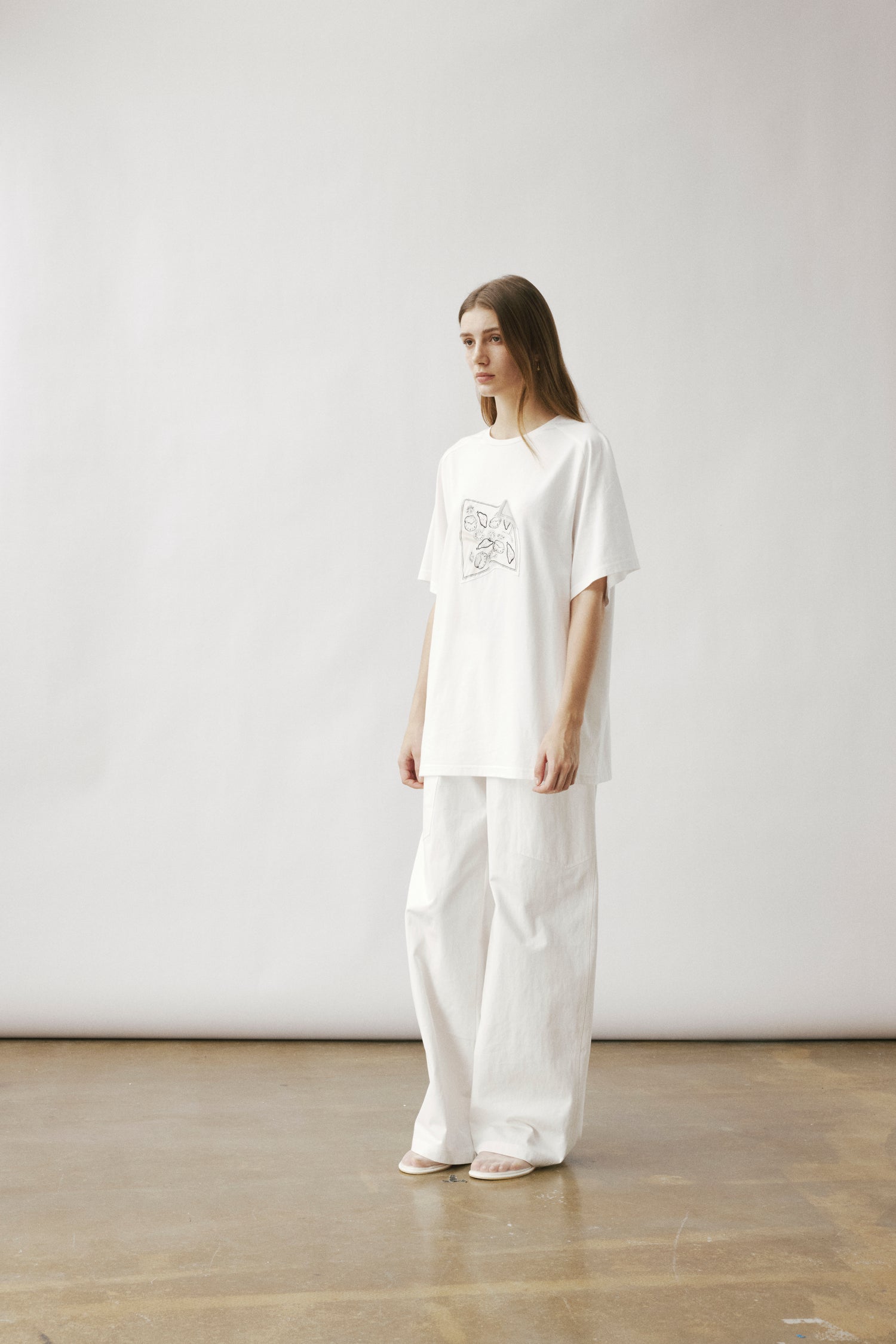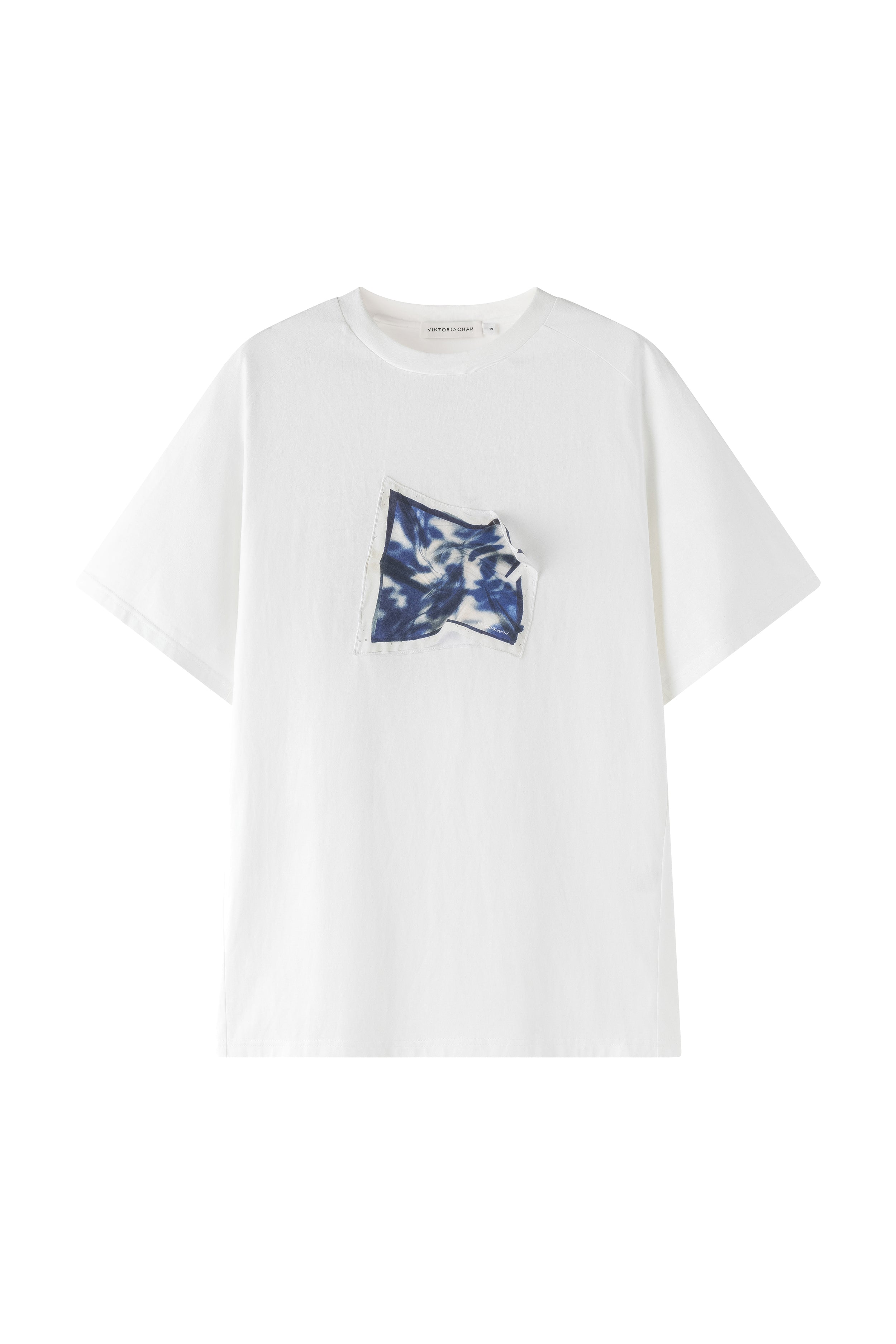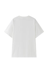 Oversized white T-shirt showcasing our printed carré scarf design, featuring the season’s emblematic shadow motif. Sewn printed patch leaving one edge free.