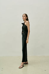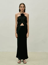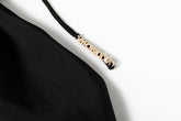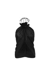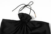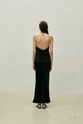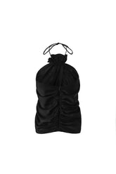 Draped halterneck top. Zipper in the back and two spaghetti straps tied in the neck. Logo buttons. The ultimate vacation top! Style for occasion, with skirt or trousers, sandals or heels...