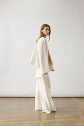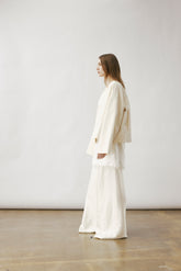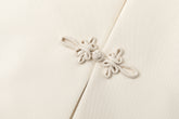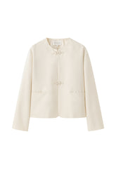 Structured, collarless jacket inspired by traditional Chinese silhouettes. Features handcrafted frog button closures at the front and subtle welt pockets. Soft matte finish. Cut with a b...
