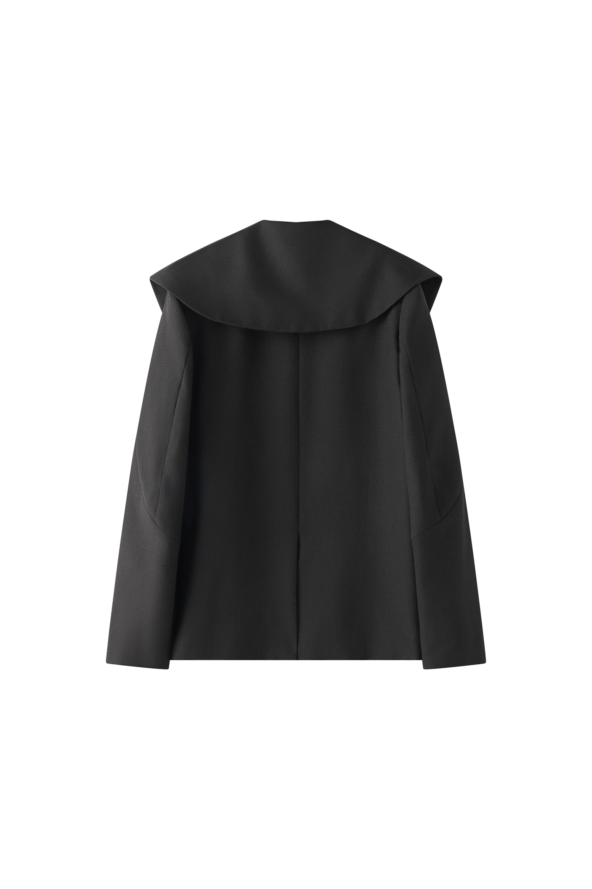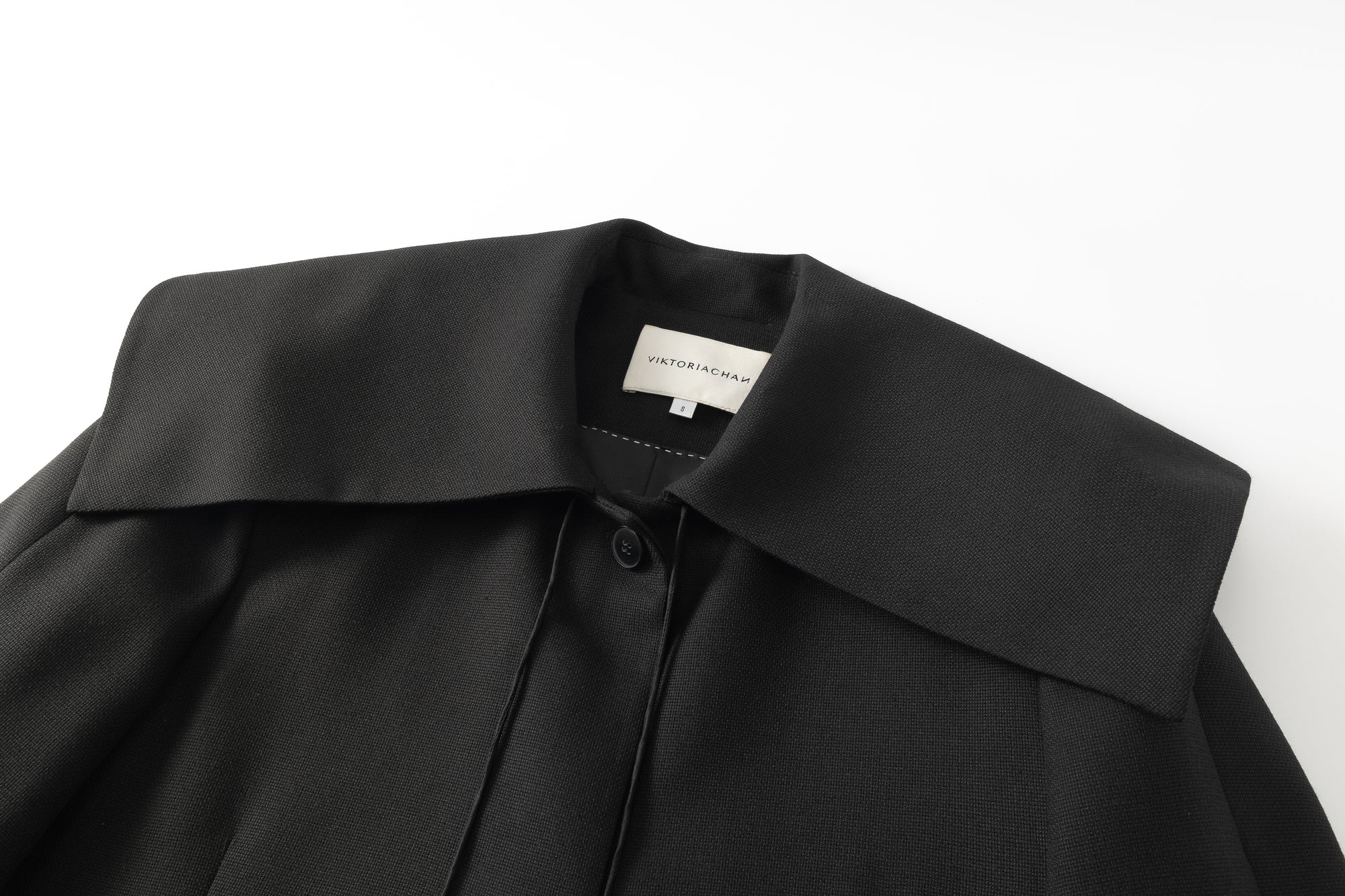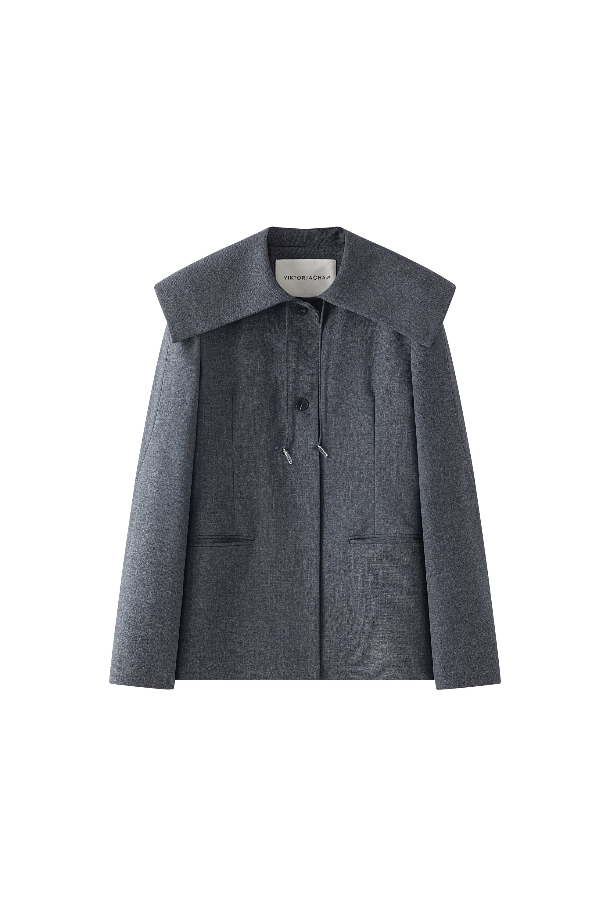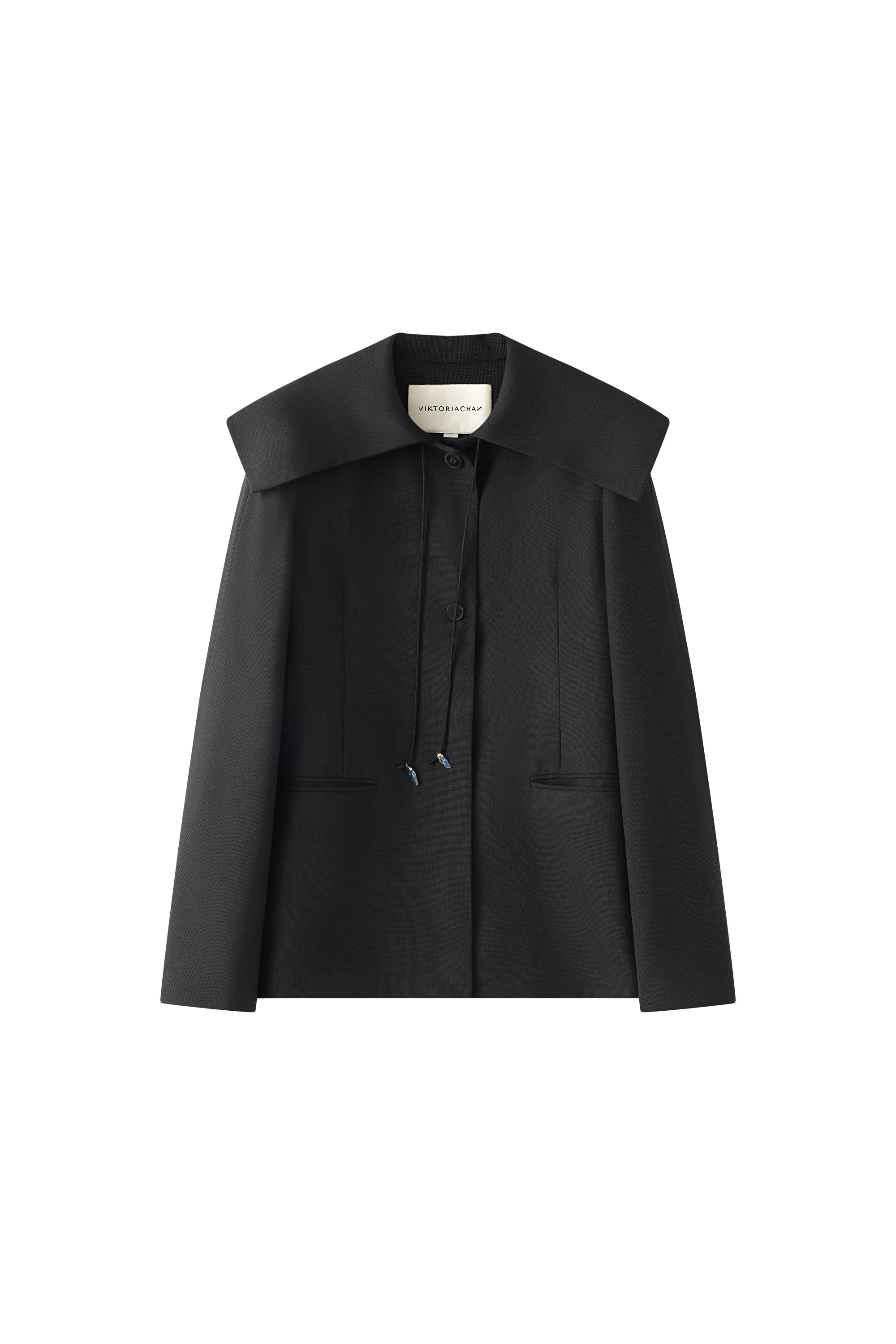 Jacket with an oversize rectangular collar and strings with crystal embellishments. Buttons closure down the front and flap pockets.