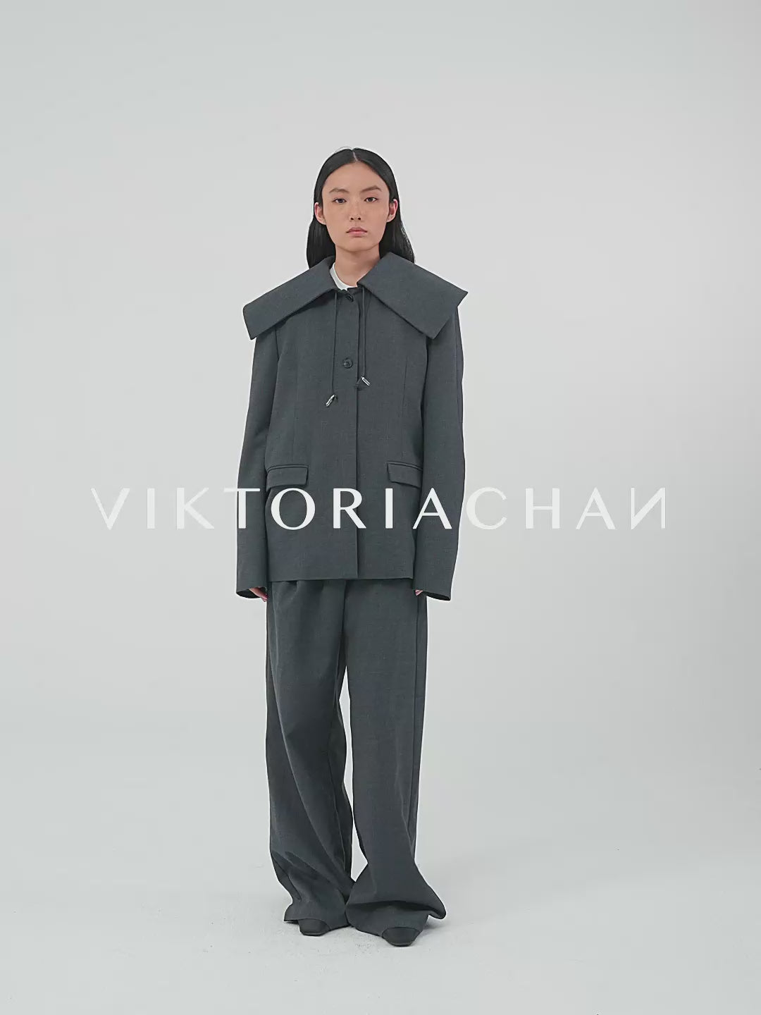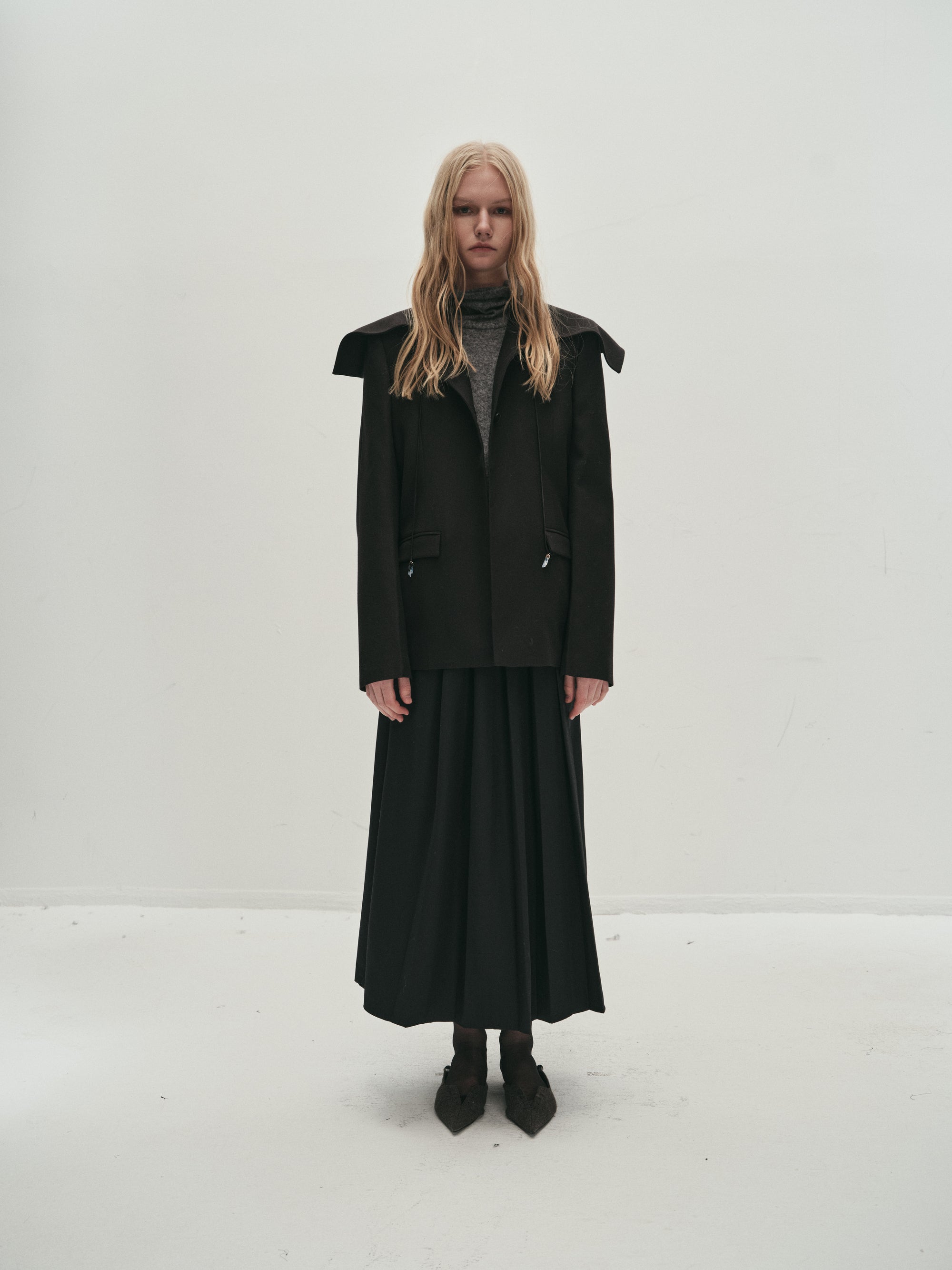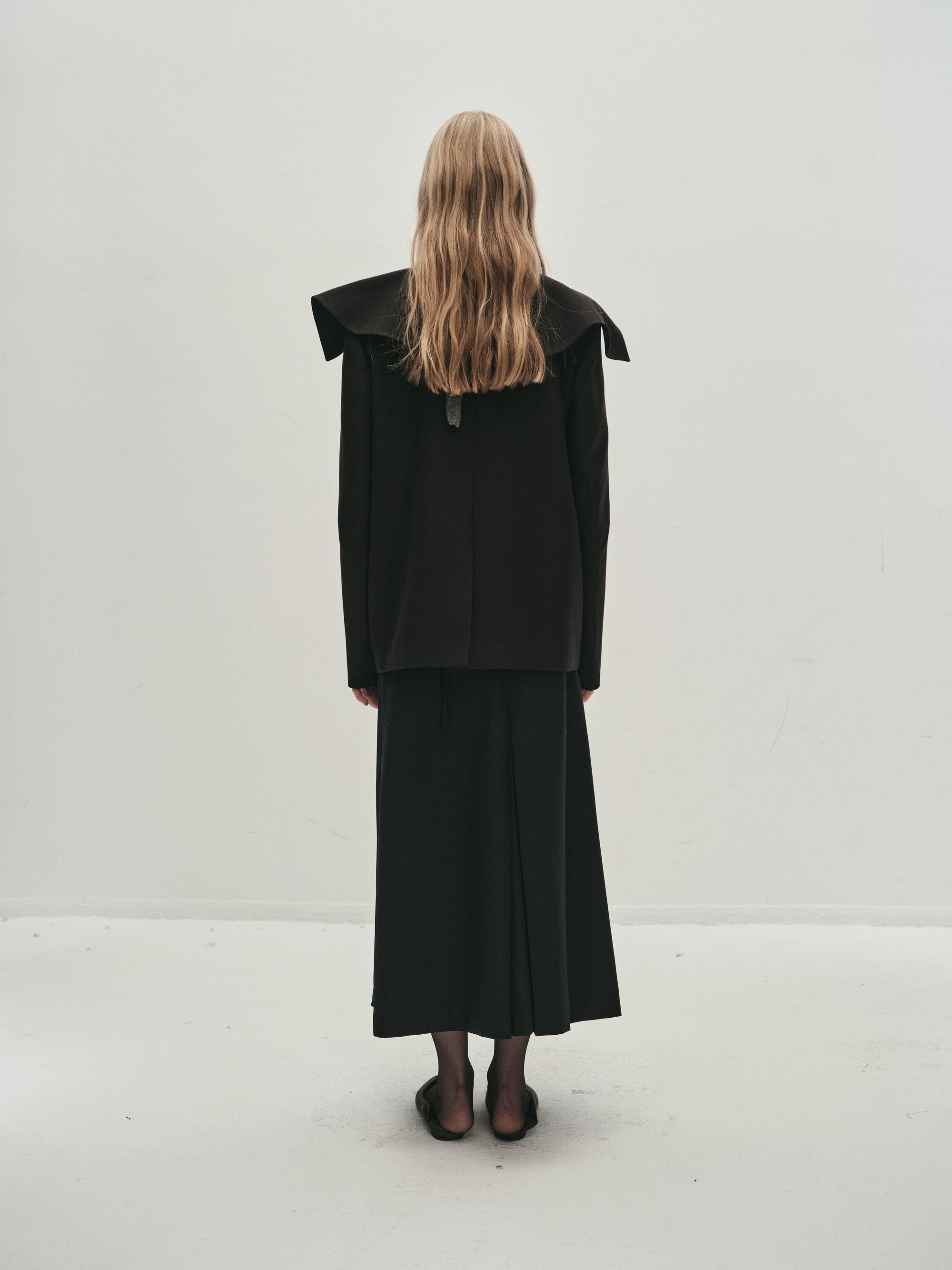 Jacket with an oversize rectangular collar and strings with crystal embellishments. Buttons closure down the front and flap pockets.