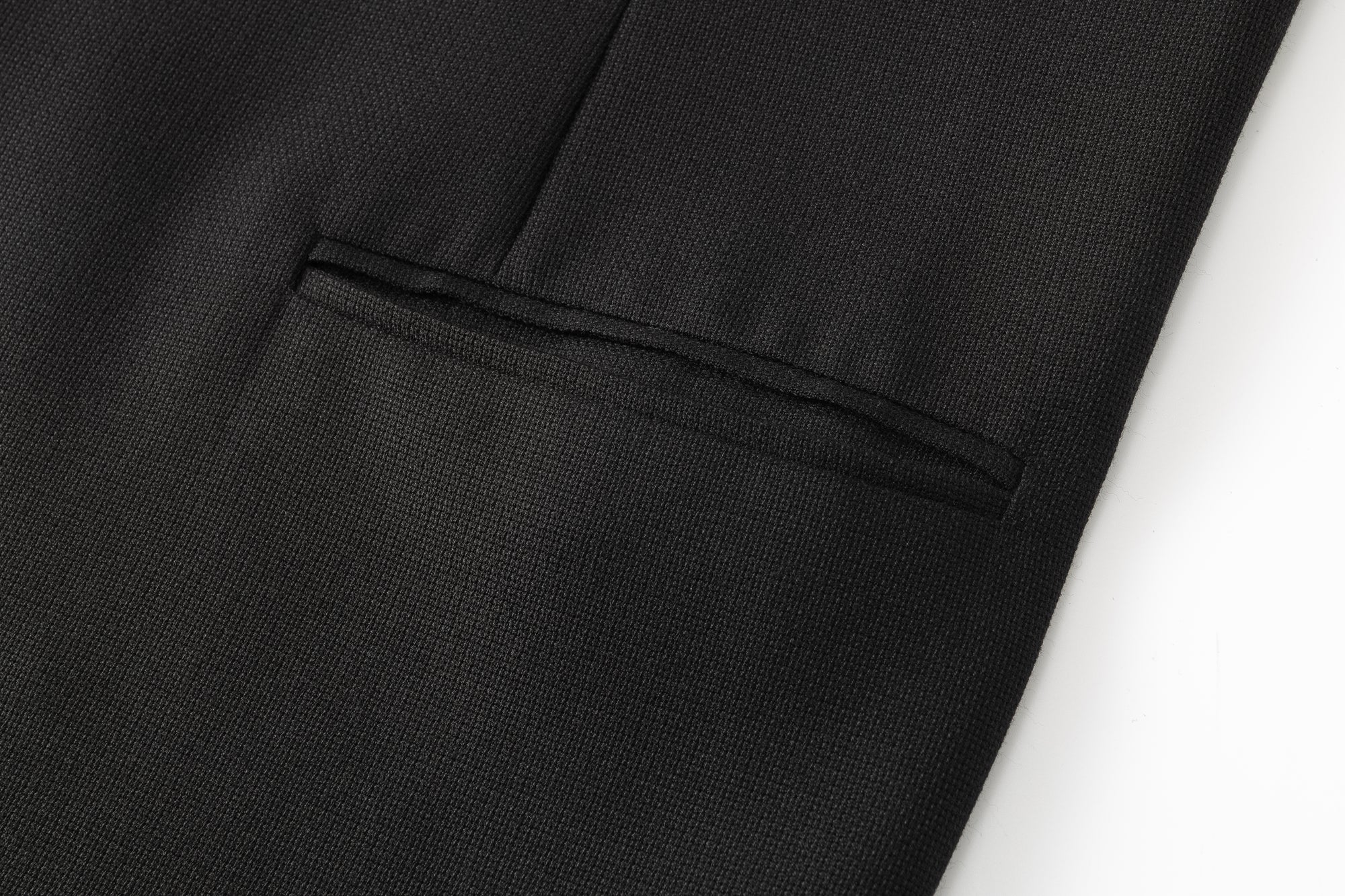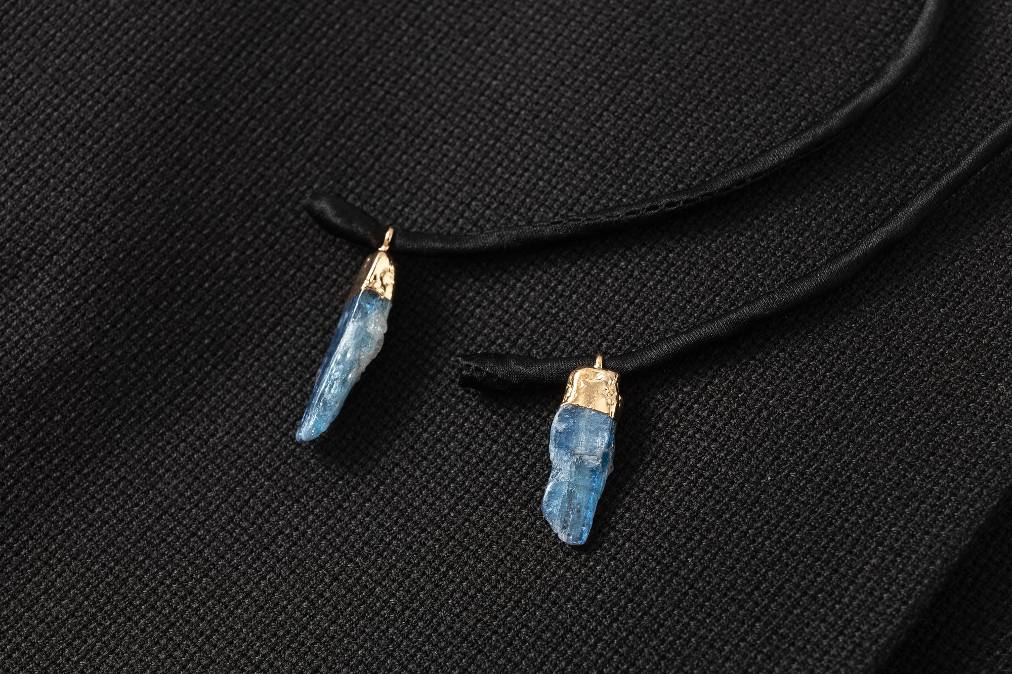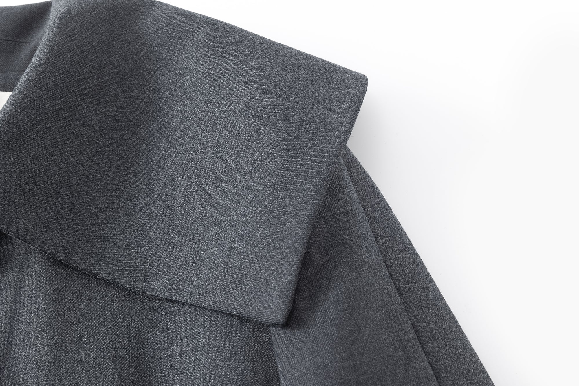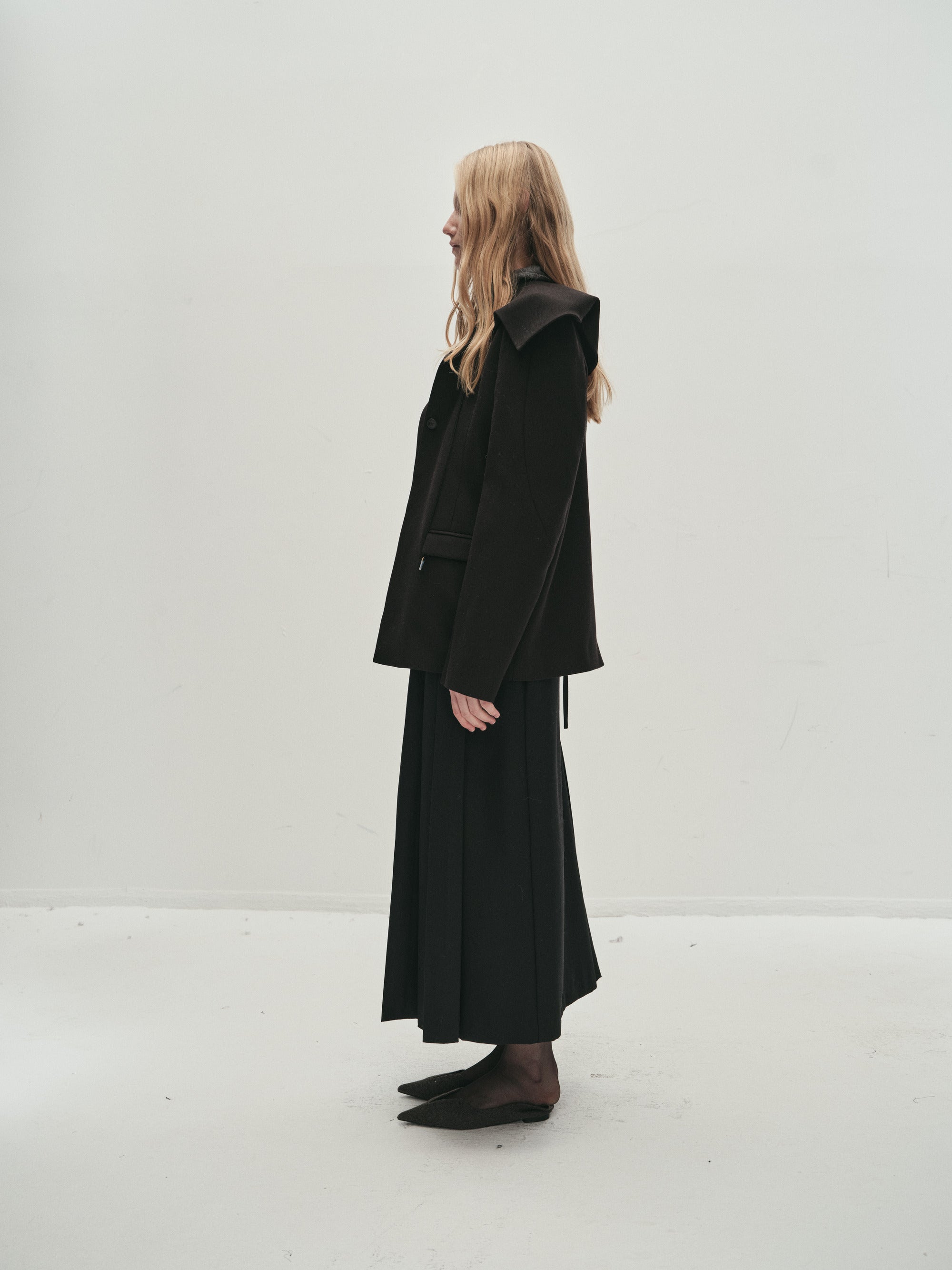 Jacket with an oversize rectangular collar and strings with crystal embellishments. Buttons closure down the front and flap pockets.