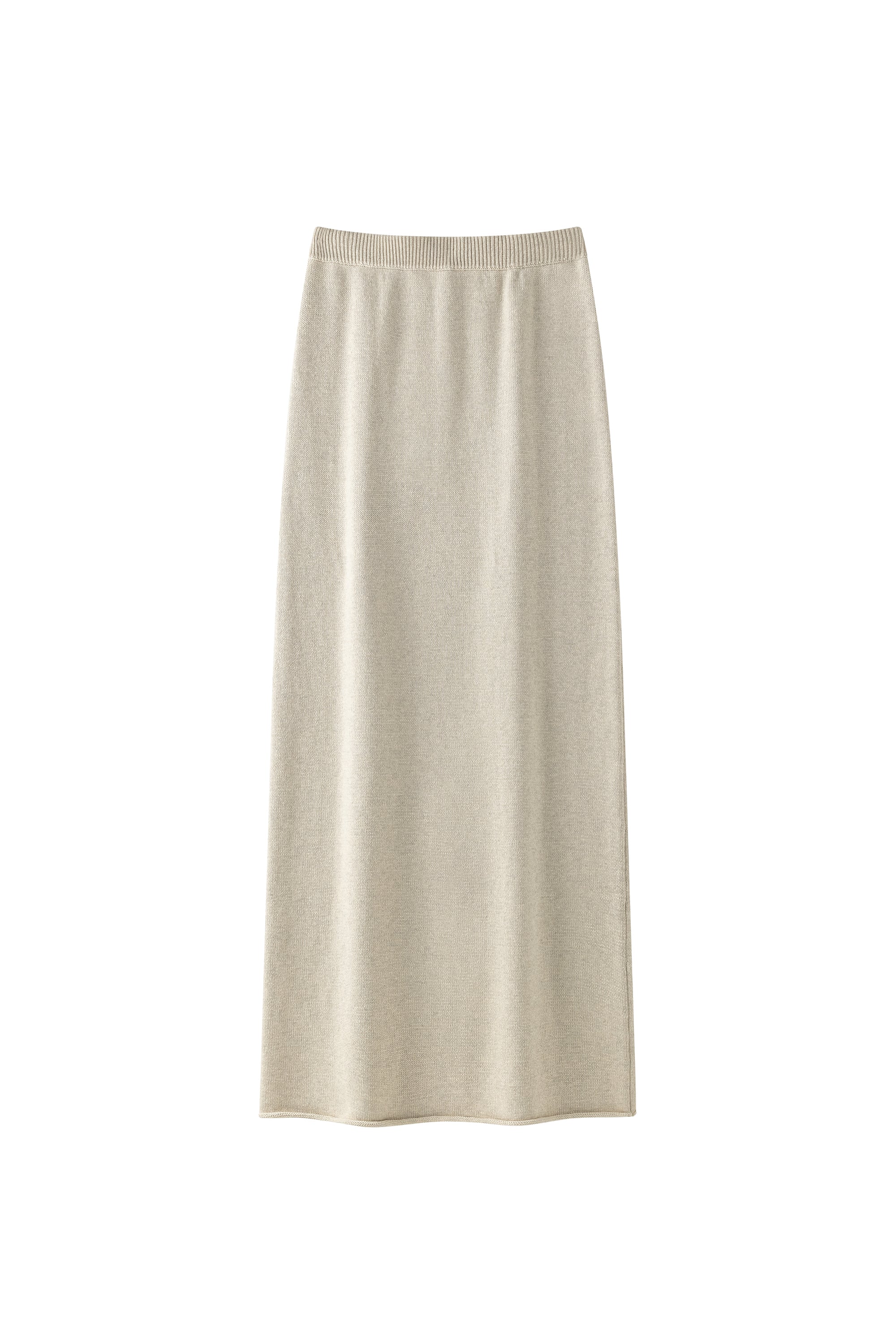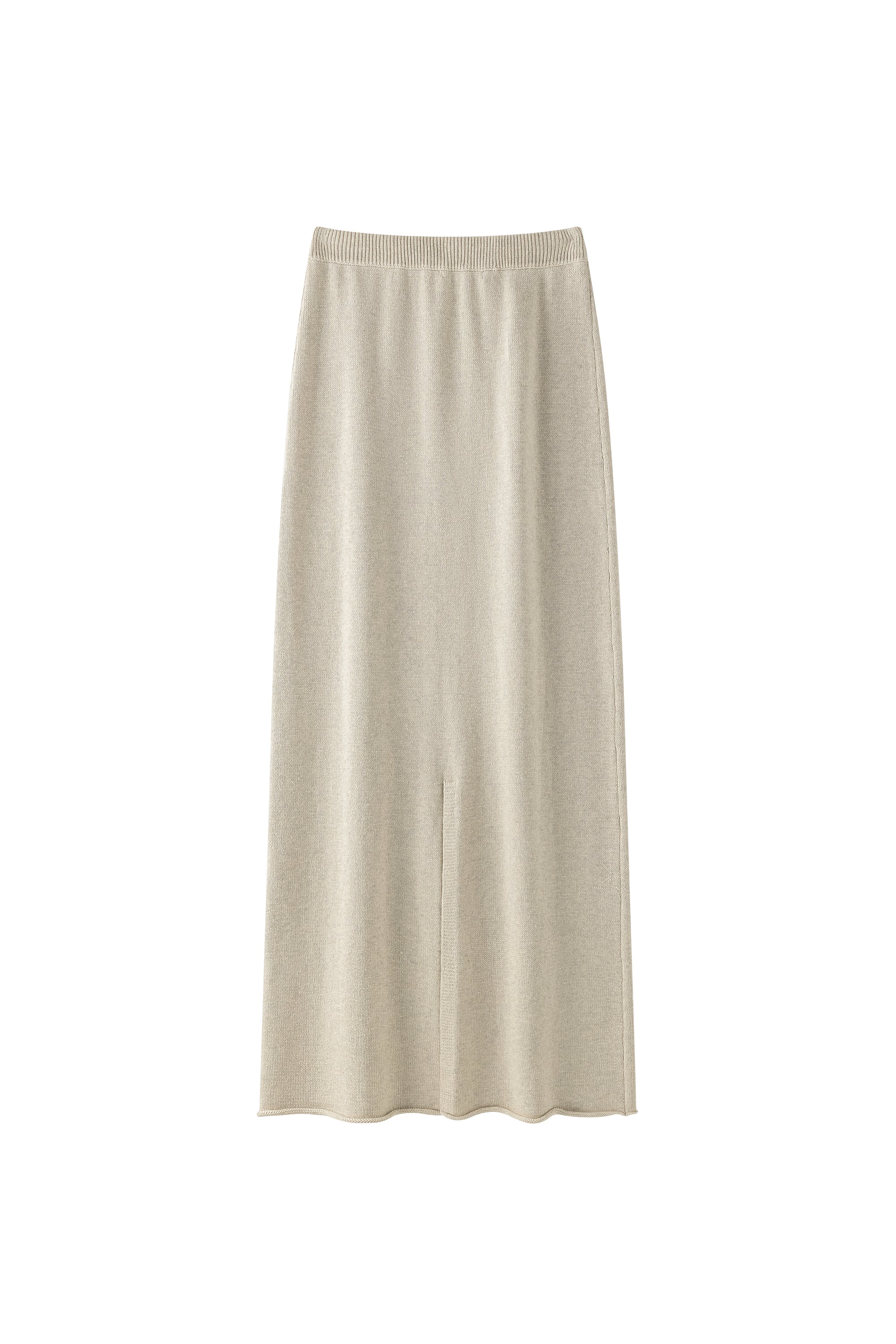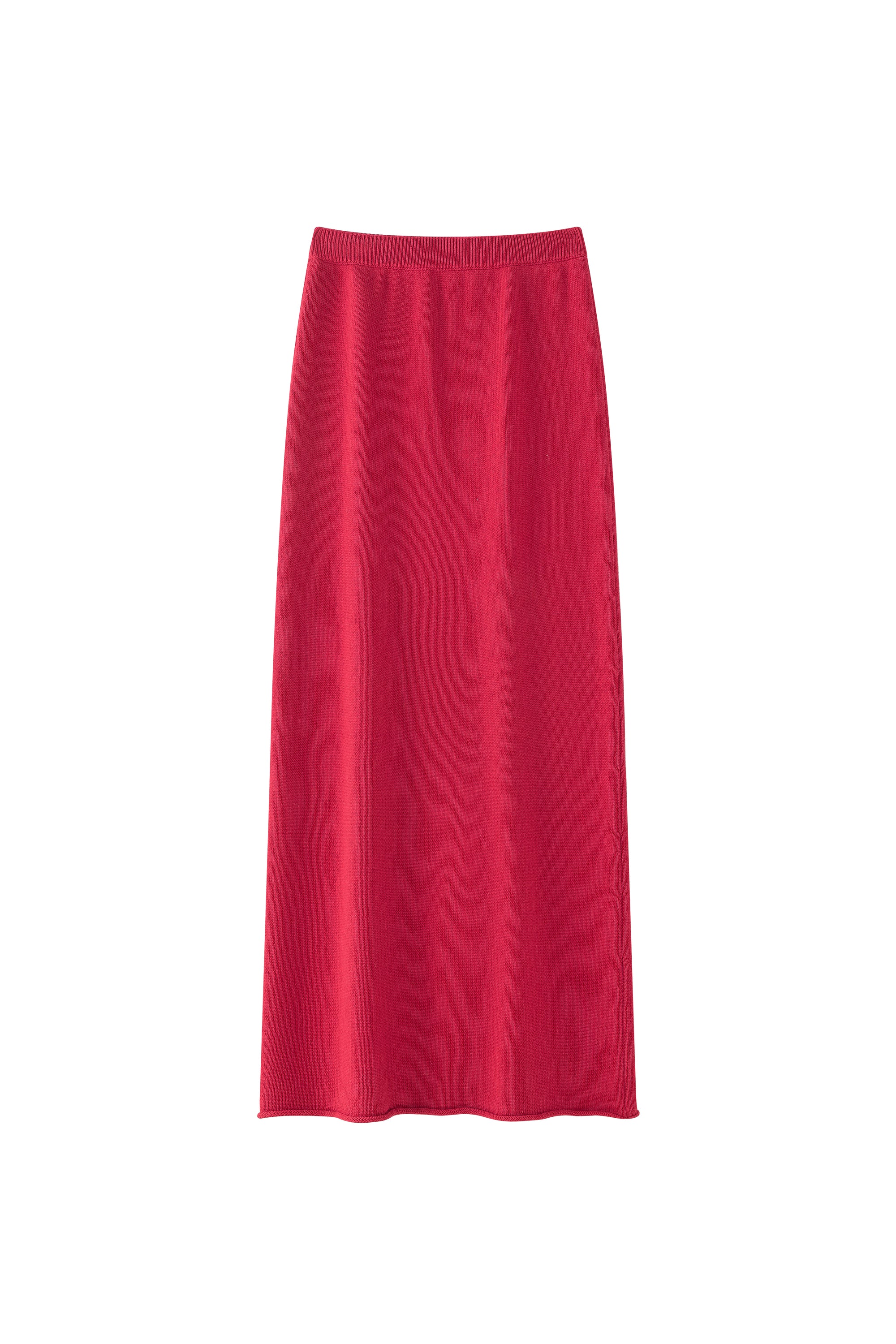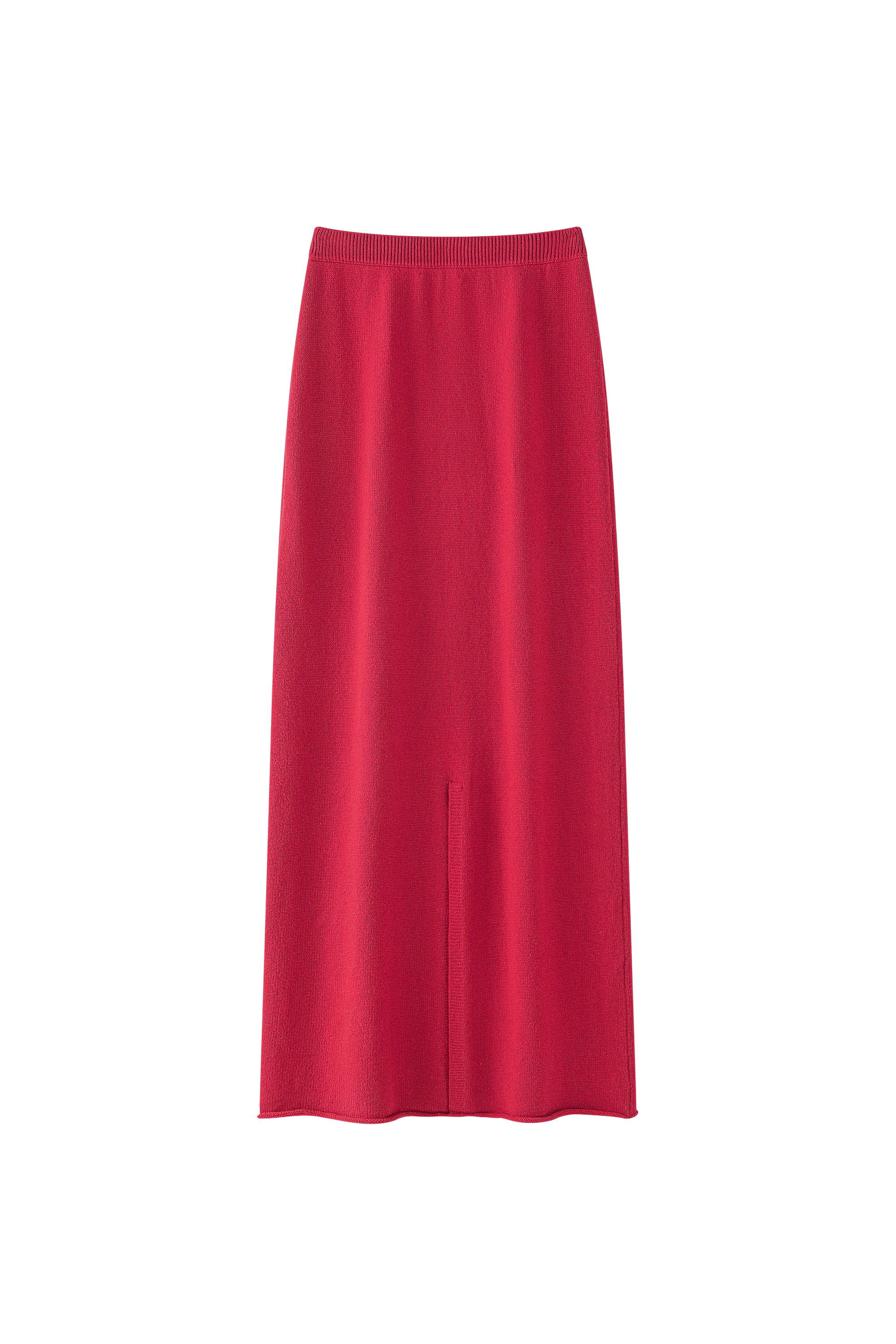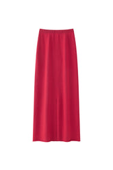 A long straight knit skirt designed with a comfortable ribbed waistband for a secure fit. The minimalist silhouette is elevated by an open back slit.