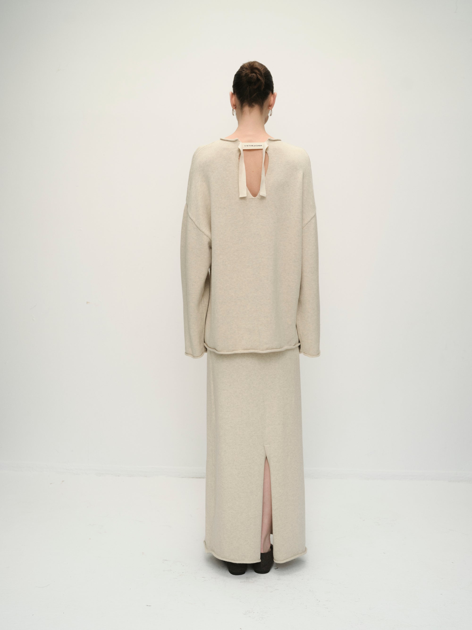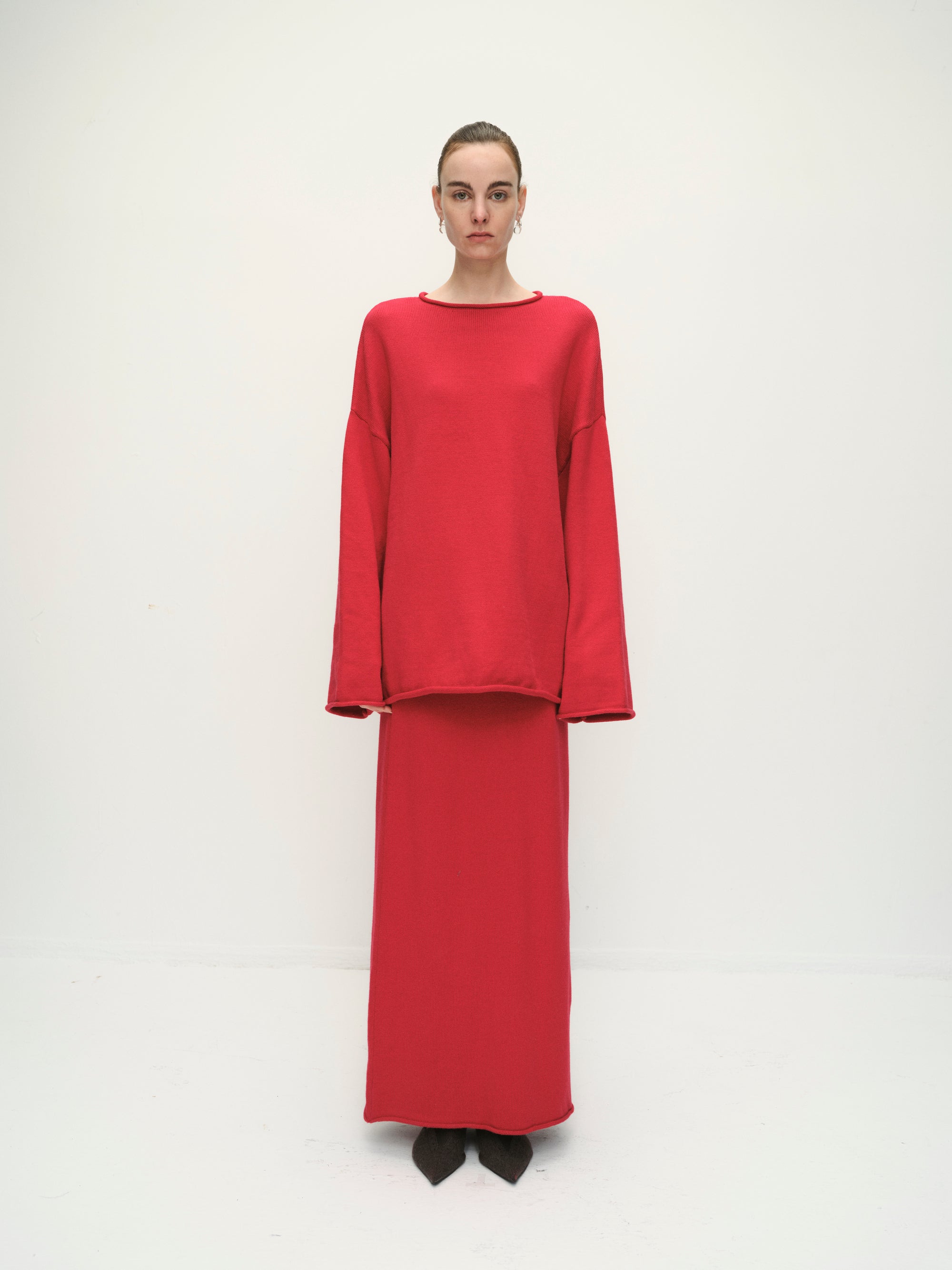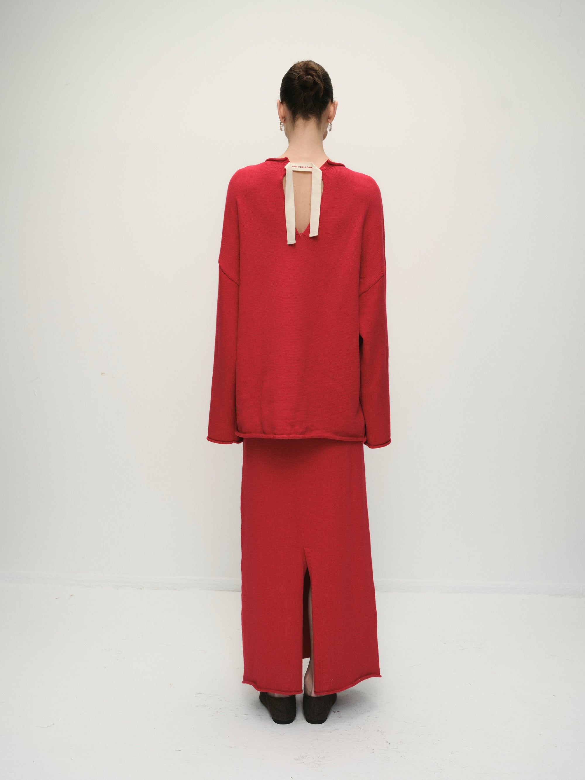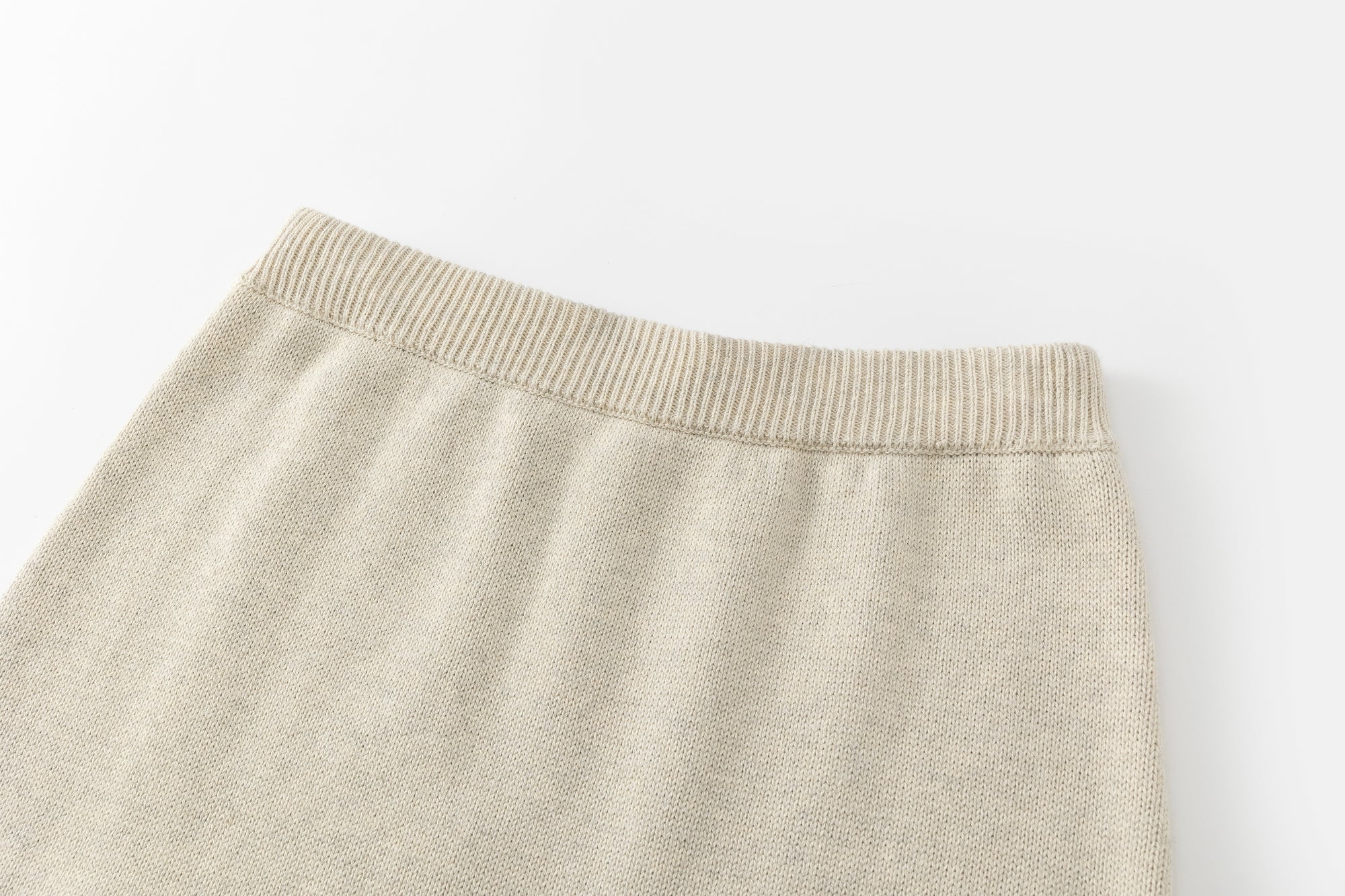 A long straight knit skirt designed with a comfortable ribbed waistband for a secure fit. The minimalist silhouette is elevated by an open back slit.