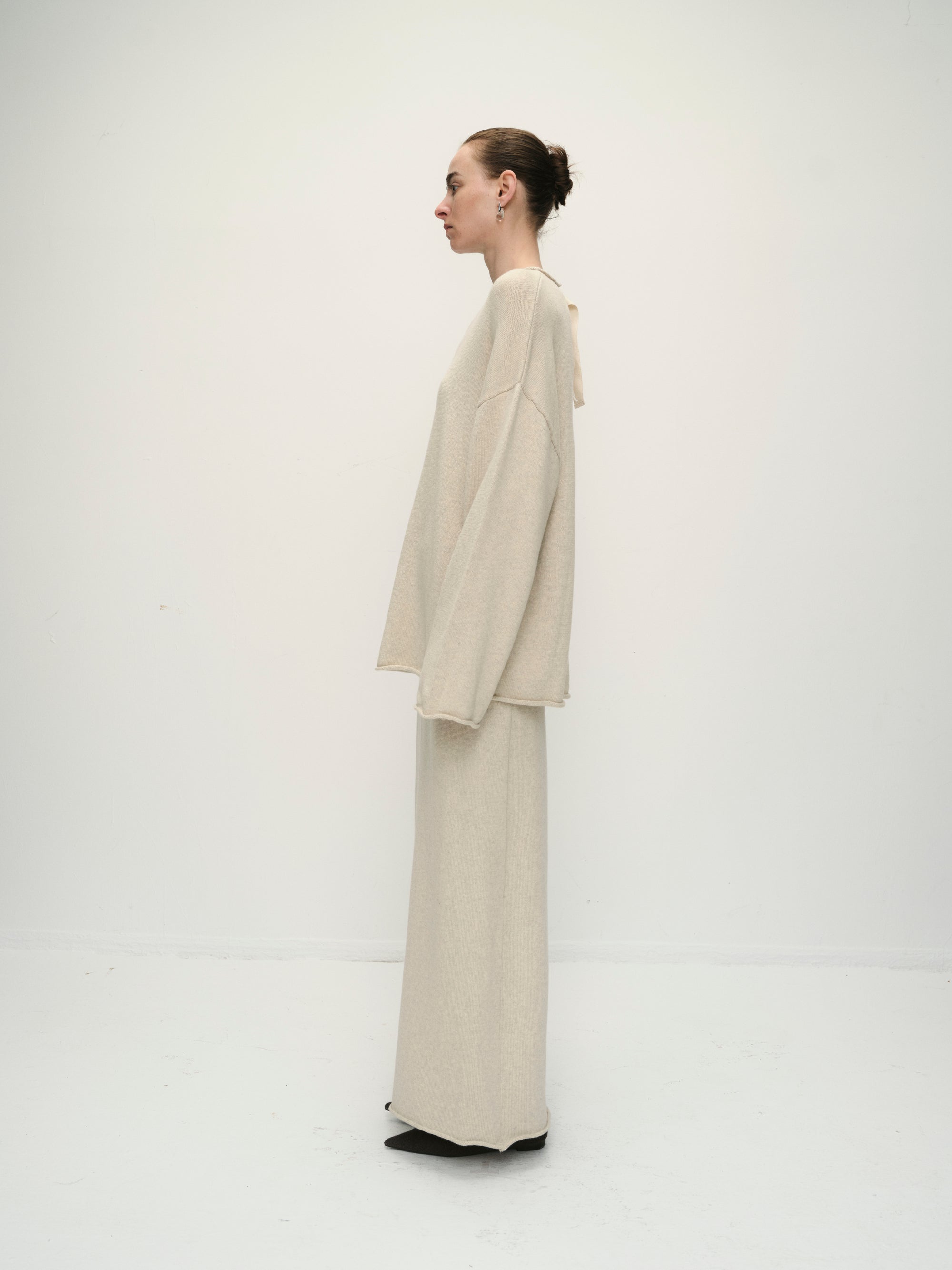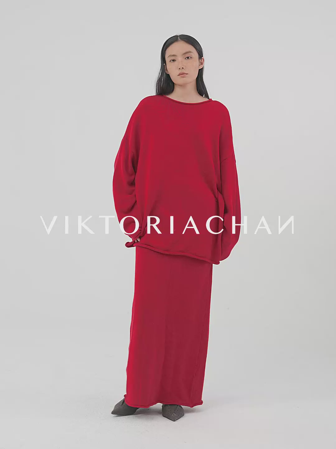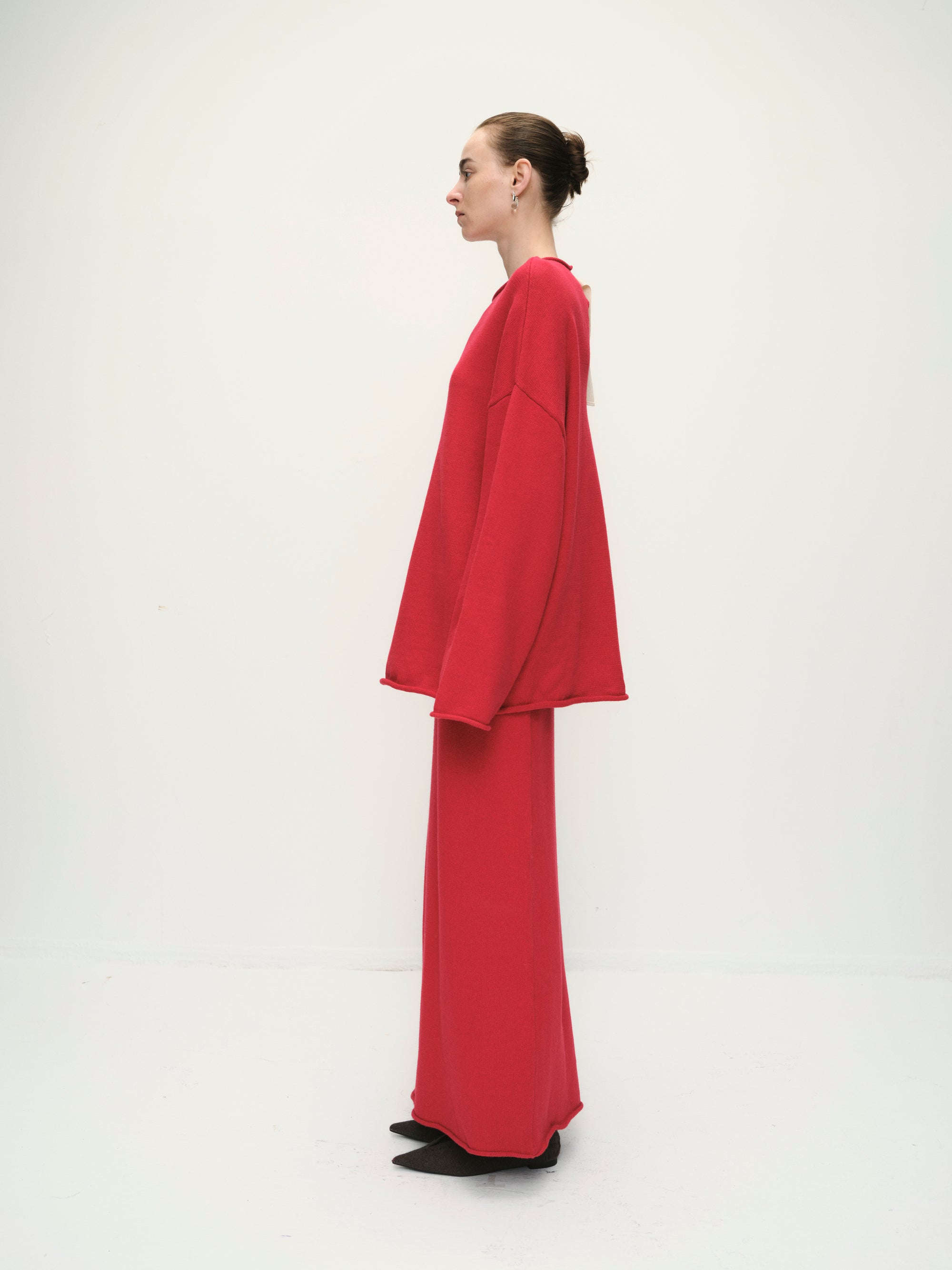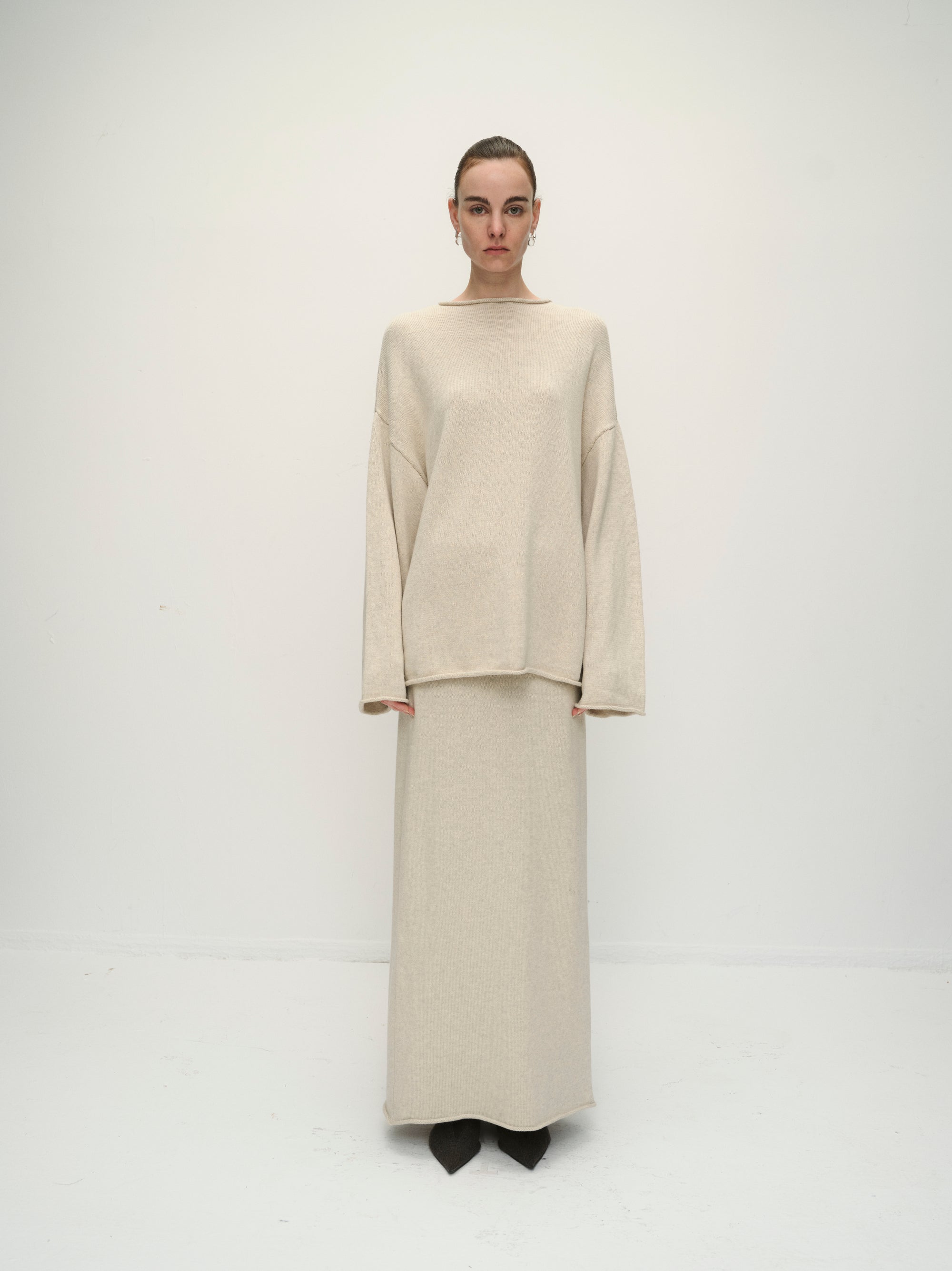 A long straight knit skirt designed with a comfortable ribbed waistband for a secure fit. The minimalist silhouette is elevated by an open back slit.