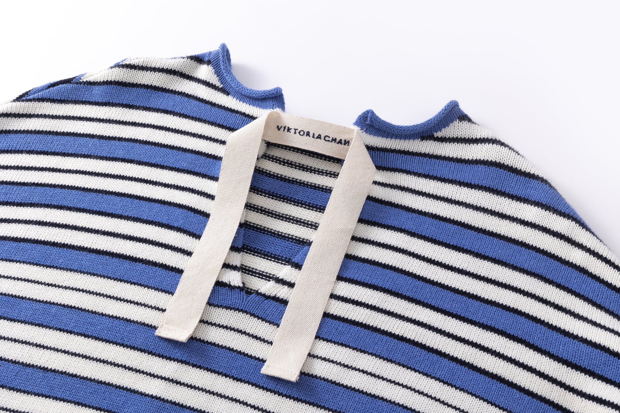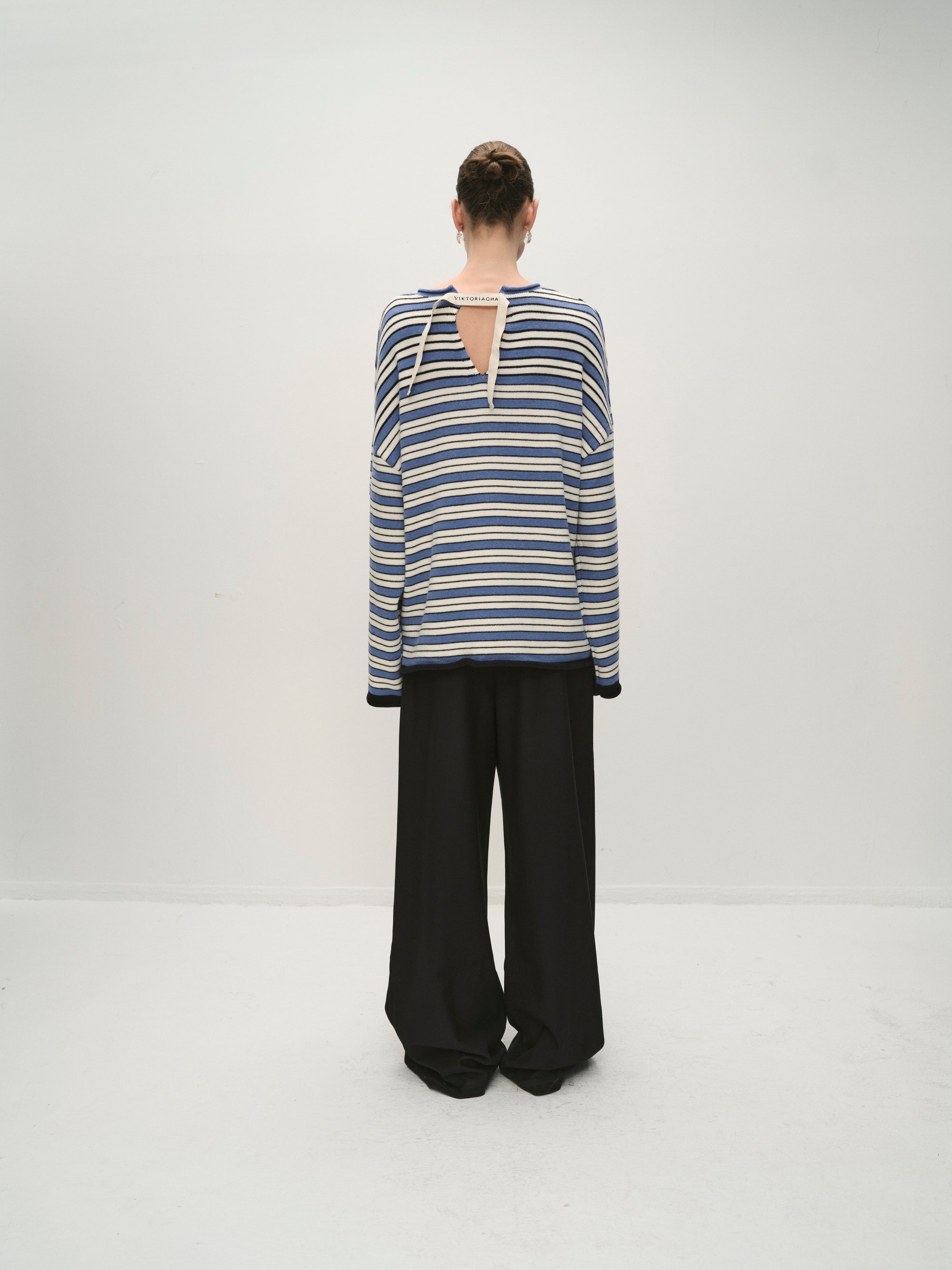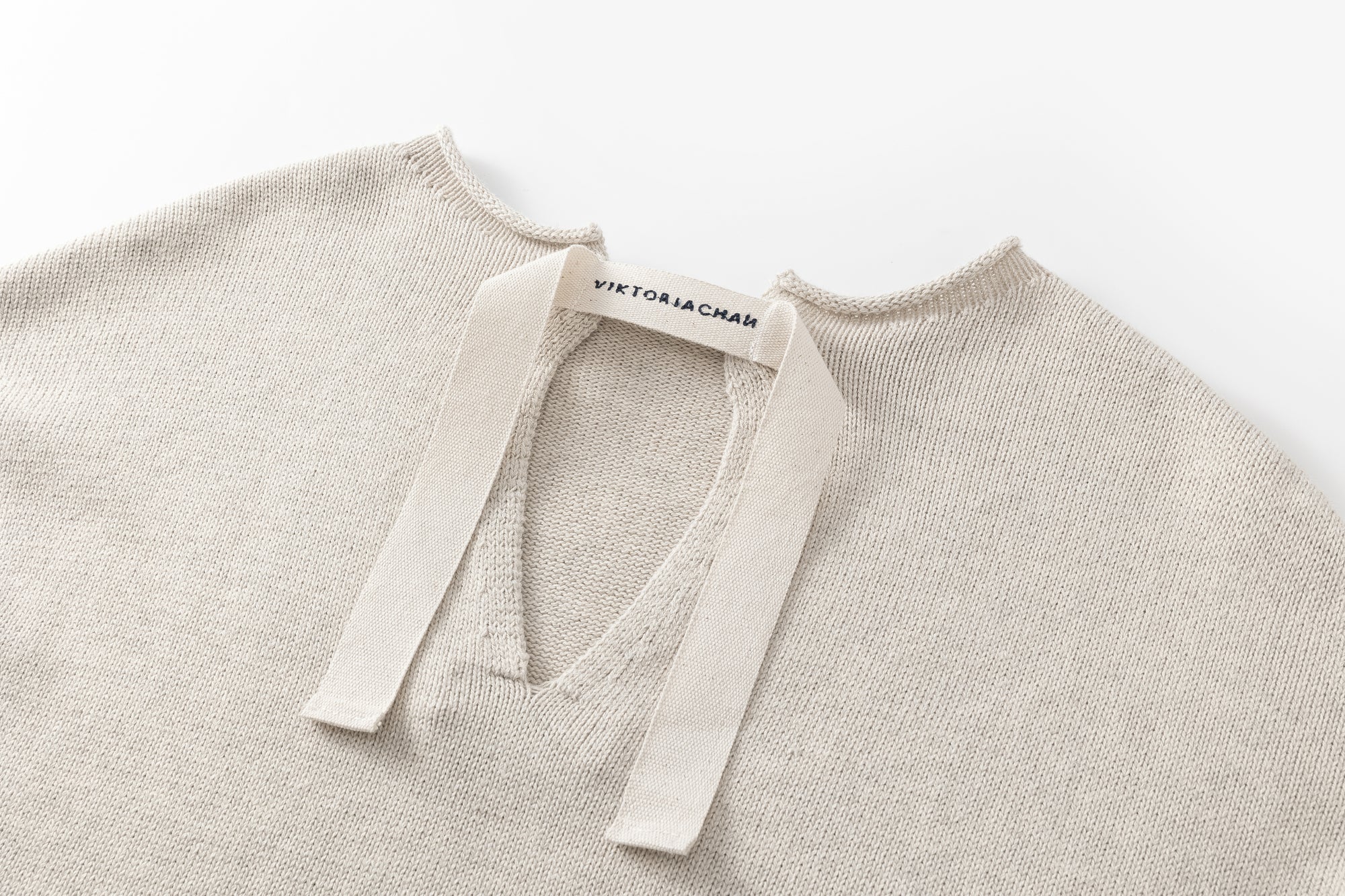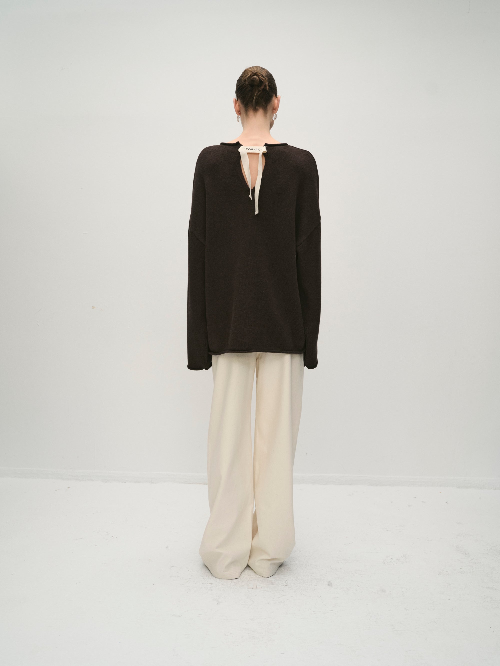 A contemporary knit sweater featuring relaxed dropped shoulders and softly rolled hems for an effortless finish. The standout detail is the open back cut, secured by a sleek strip showca...