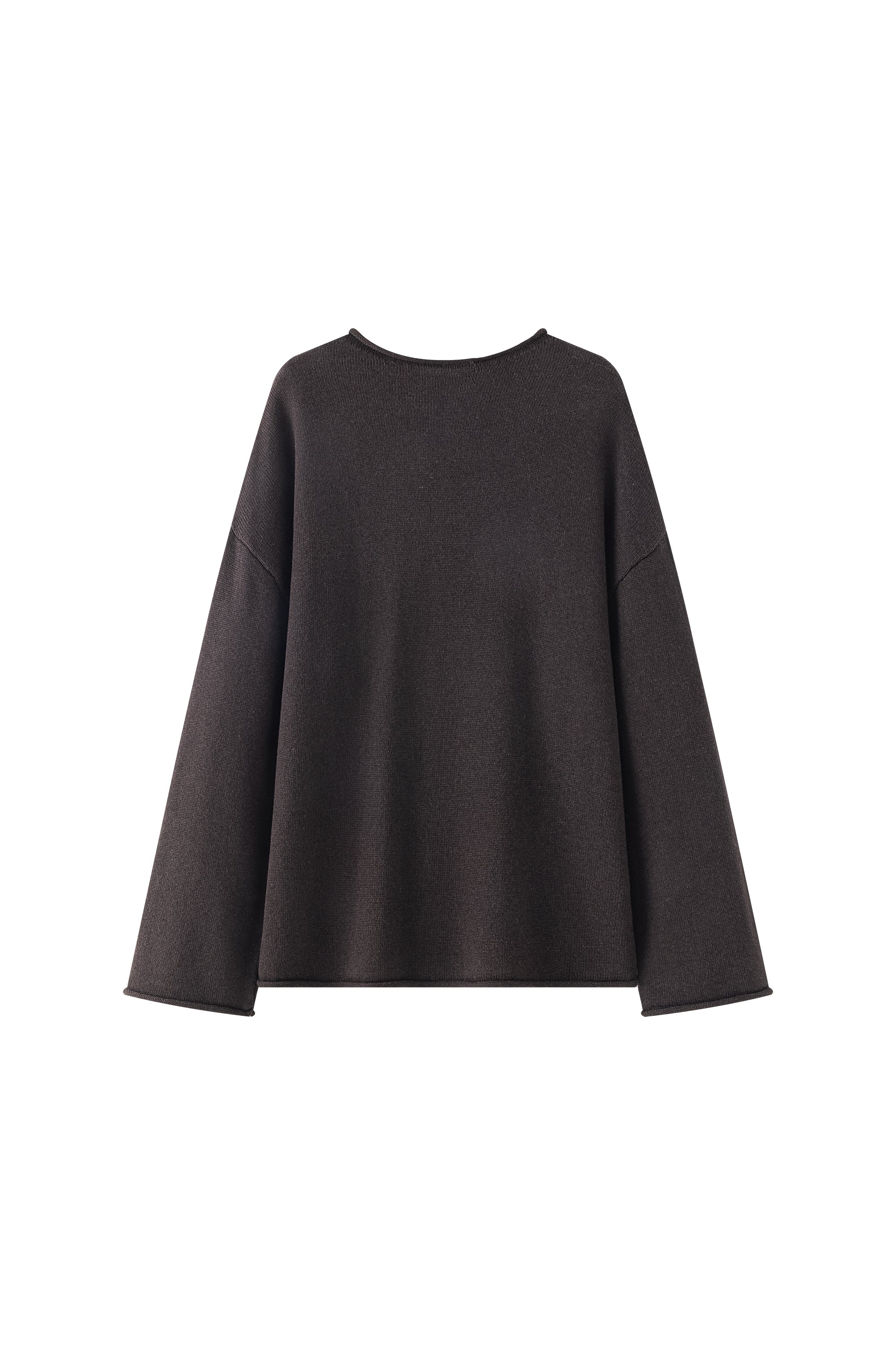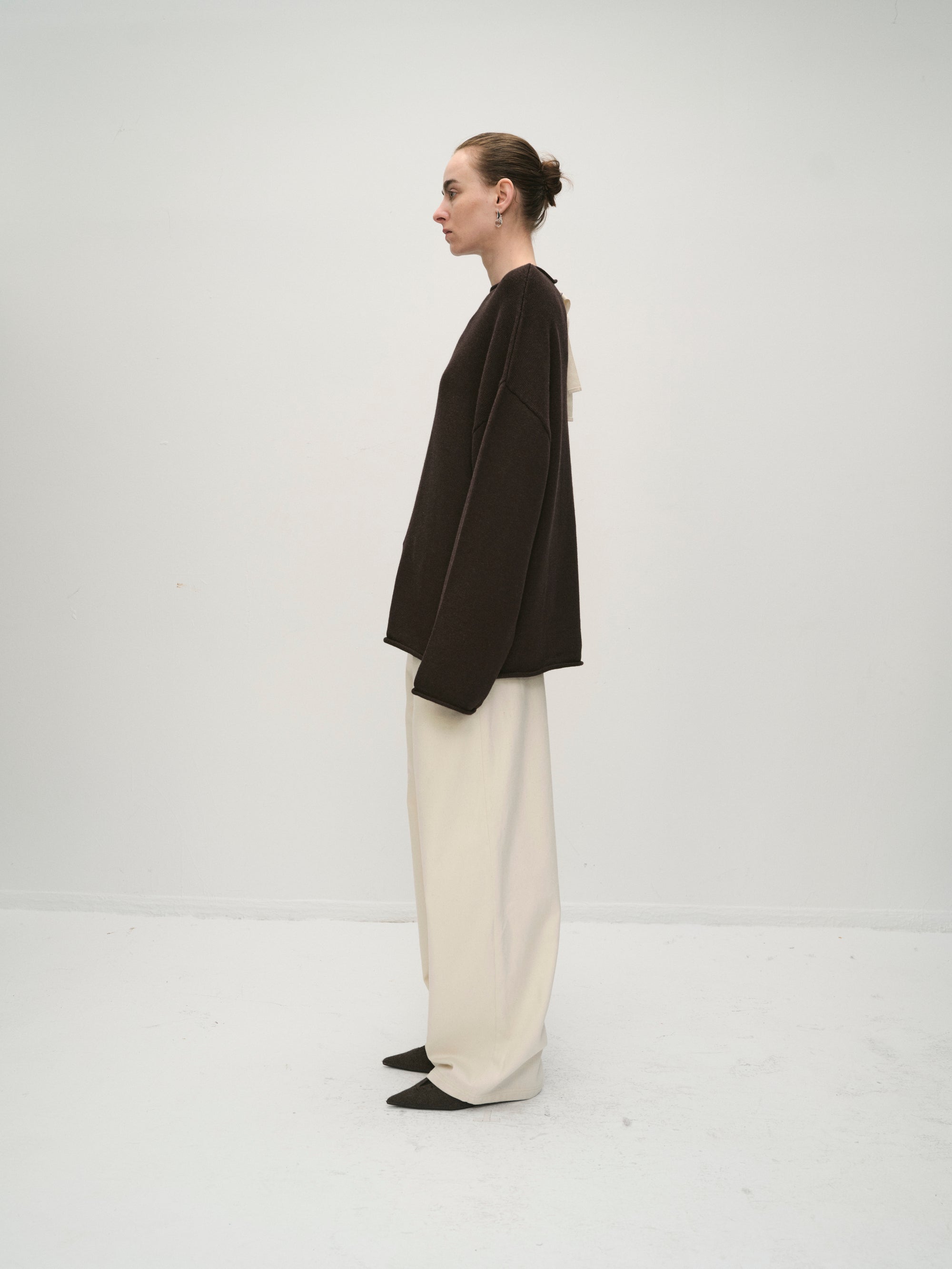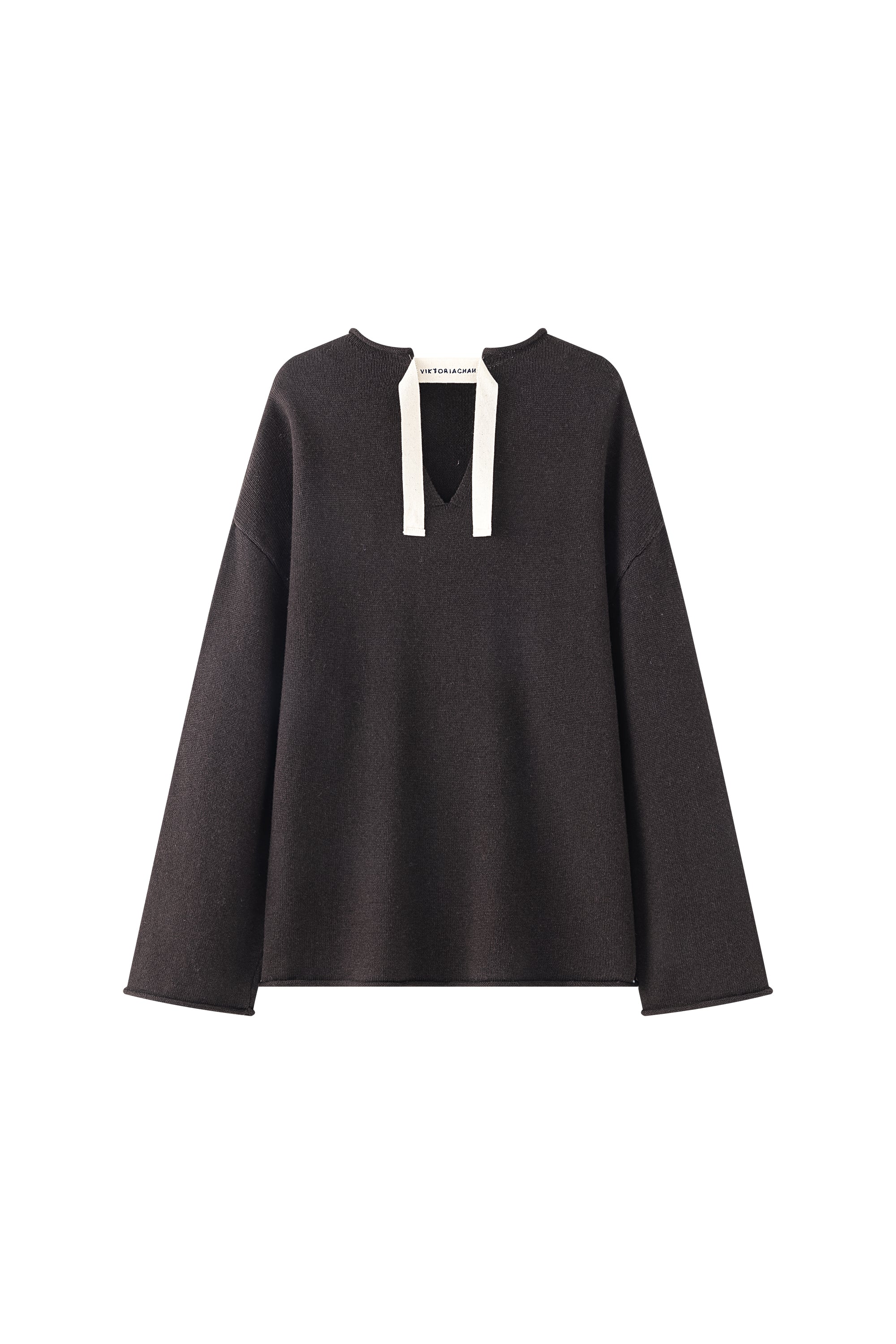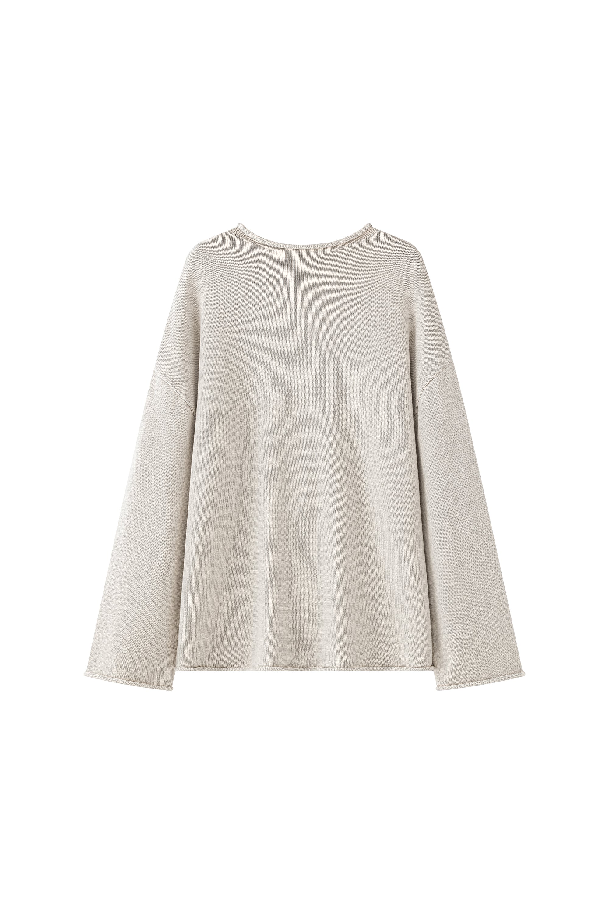 A contemporary knit sweater featuring relaxed dropped shoulders and softly rolled hems for an effortless finish. The standout detail is the open back cut, secured by a sleek strip showca...