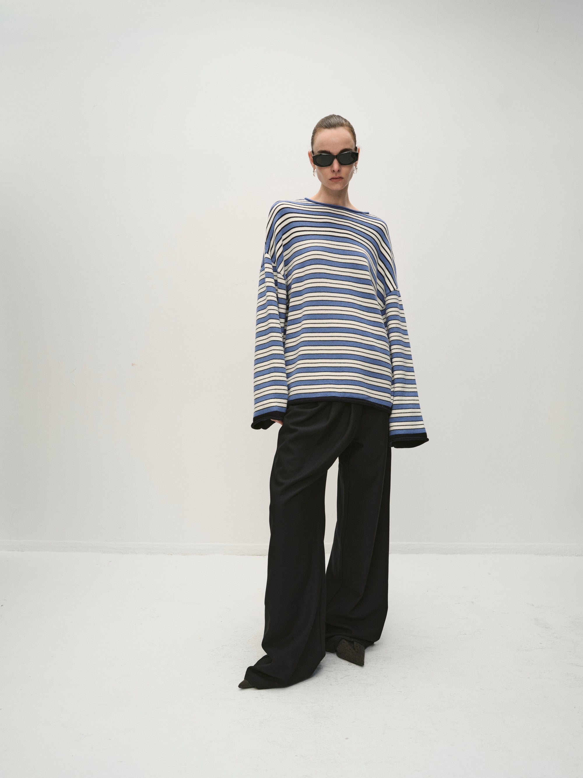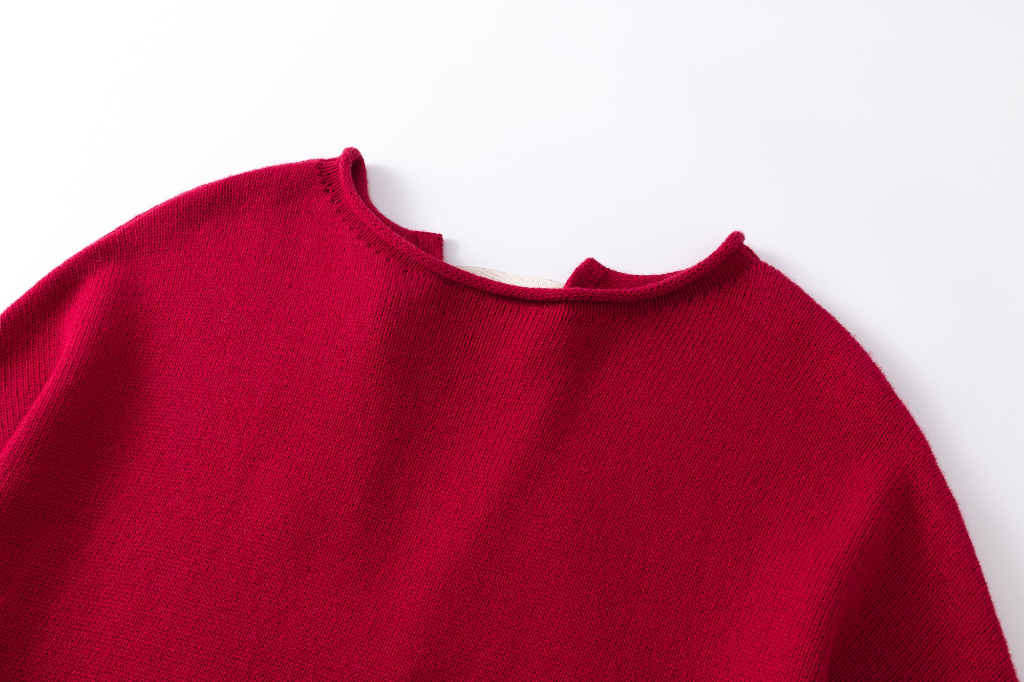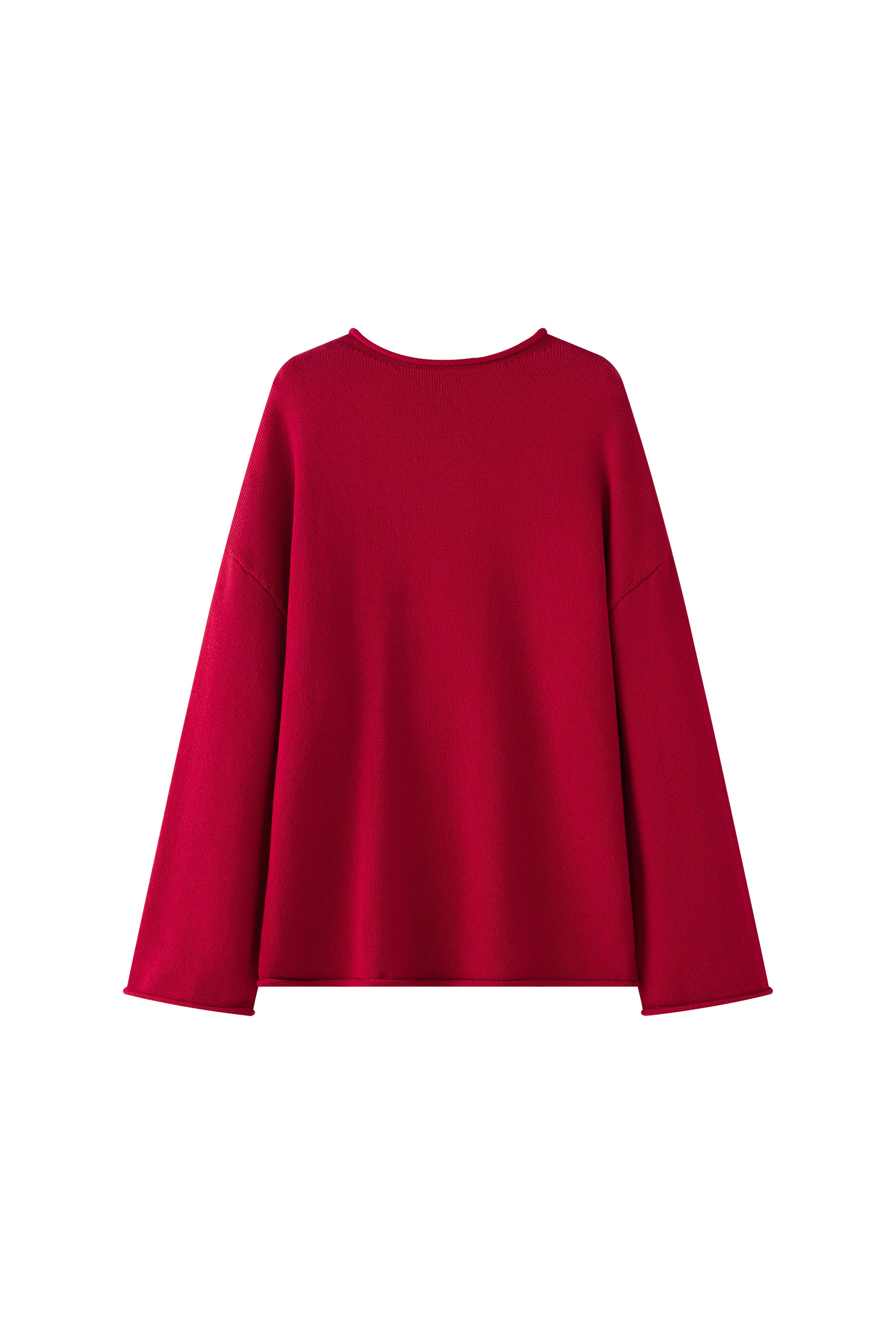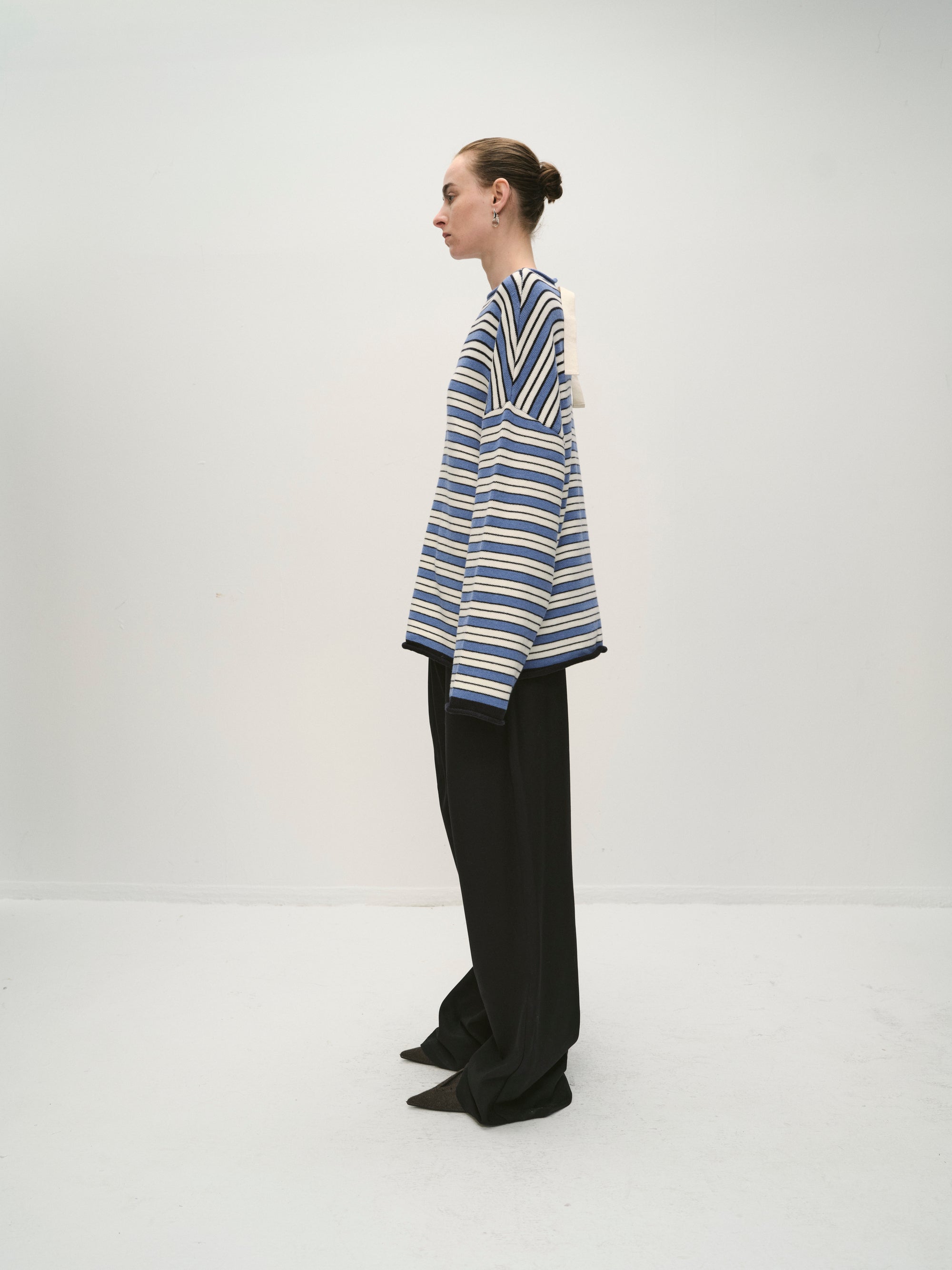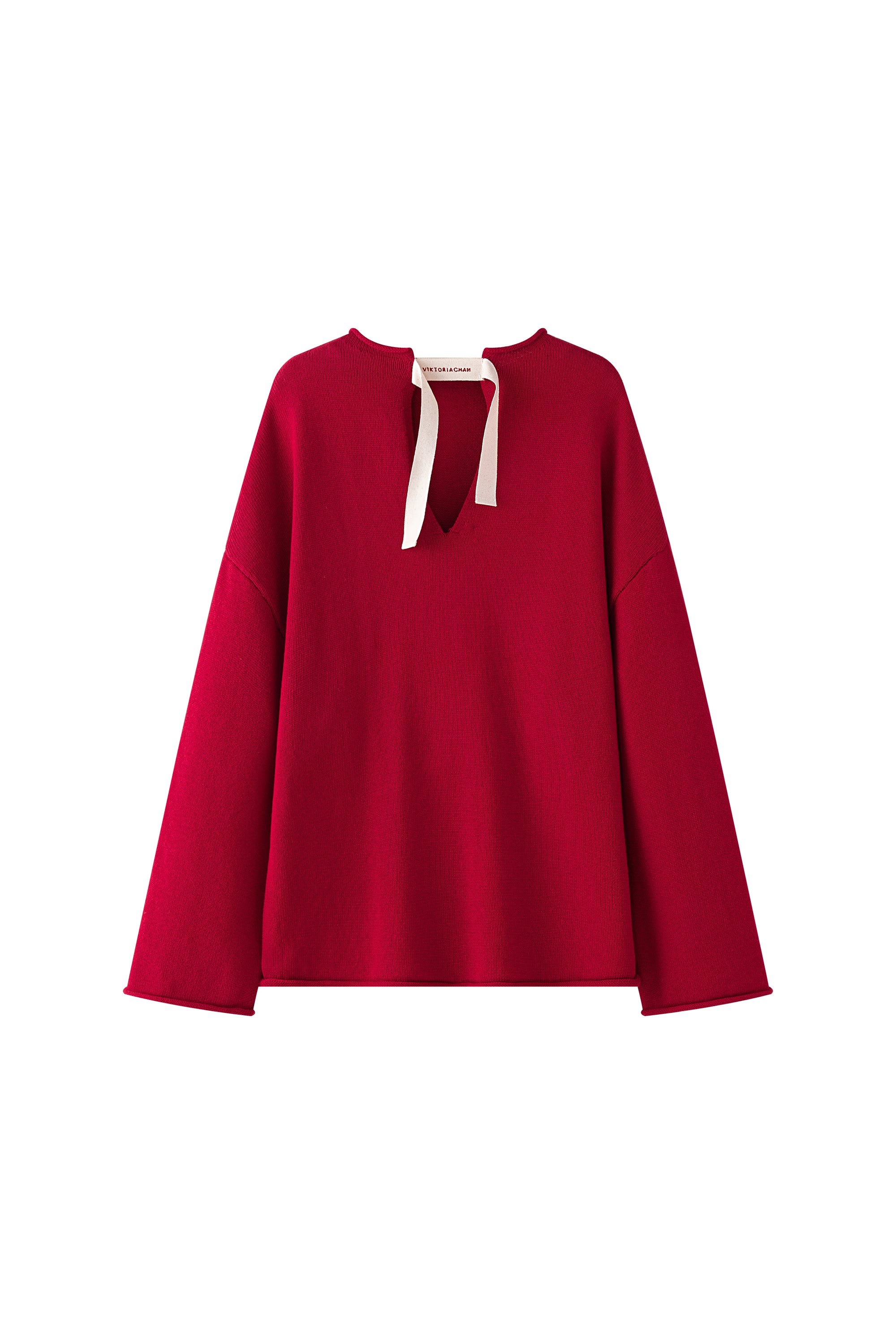 A contemporary knit sweater featuring relaxed dropped shoulders and softly rolled hems for an effortless finish. The standout detail is the open back cut, secured by a sleek strip showca...