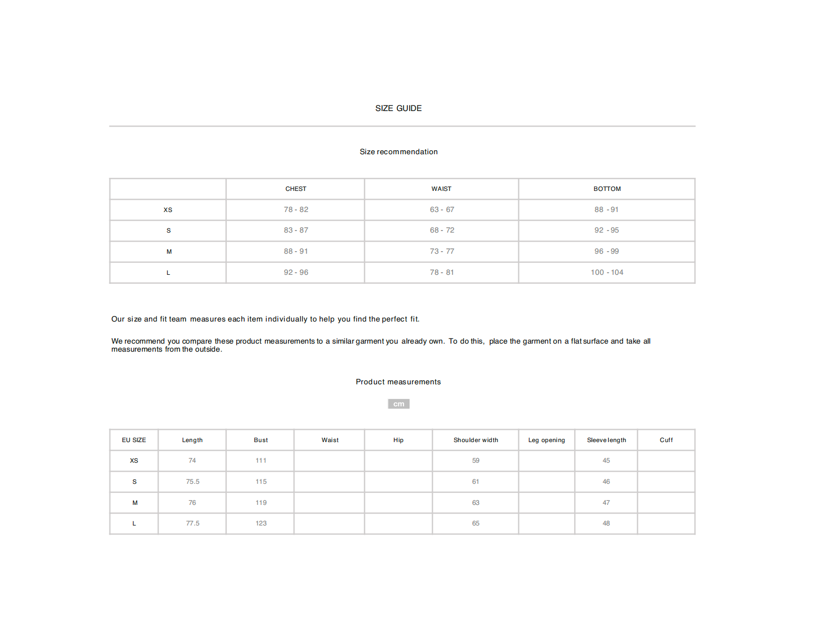 The model is 1.76 m tall and wears a size S. For more detailed sizing information, please consult our size charts.