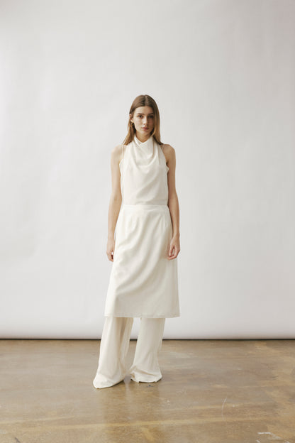 Made from a soft wool blend, this piece can be worn multiple ways. Style it as a skirt, with the separate spaghetti strap top, as a halterneck by buttoning the front panel, or with butto...