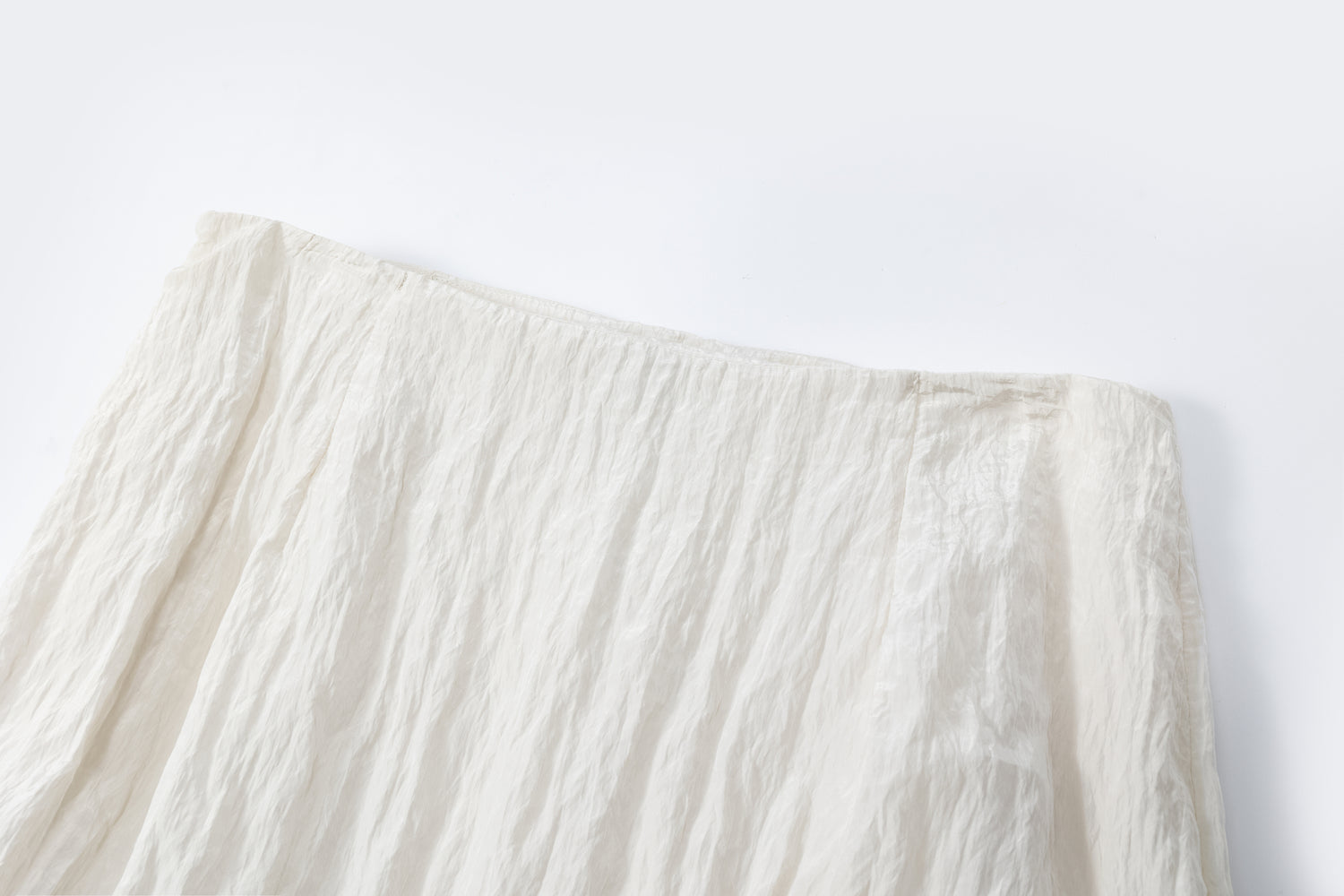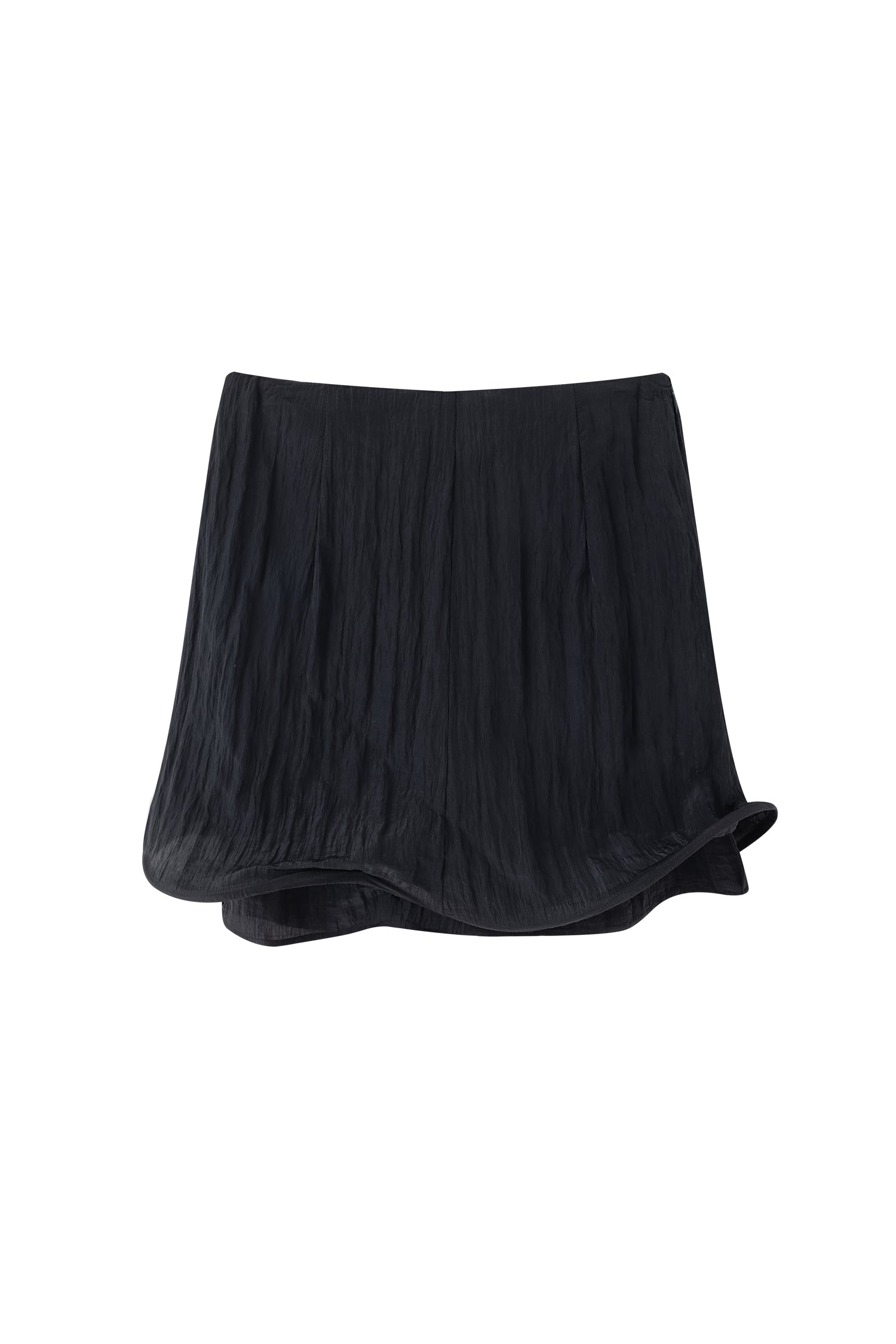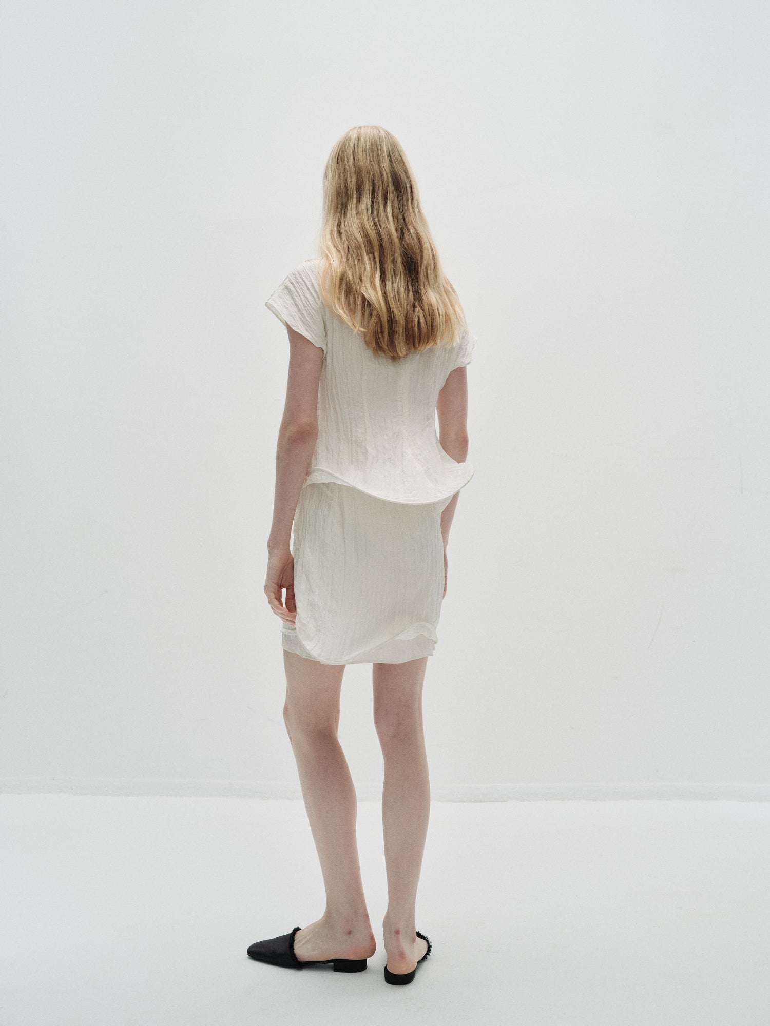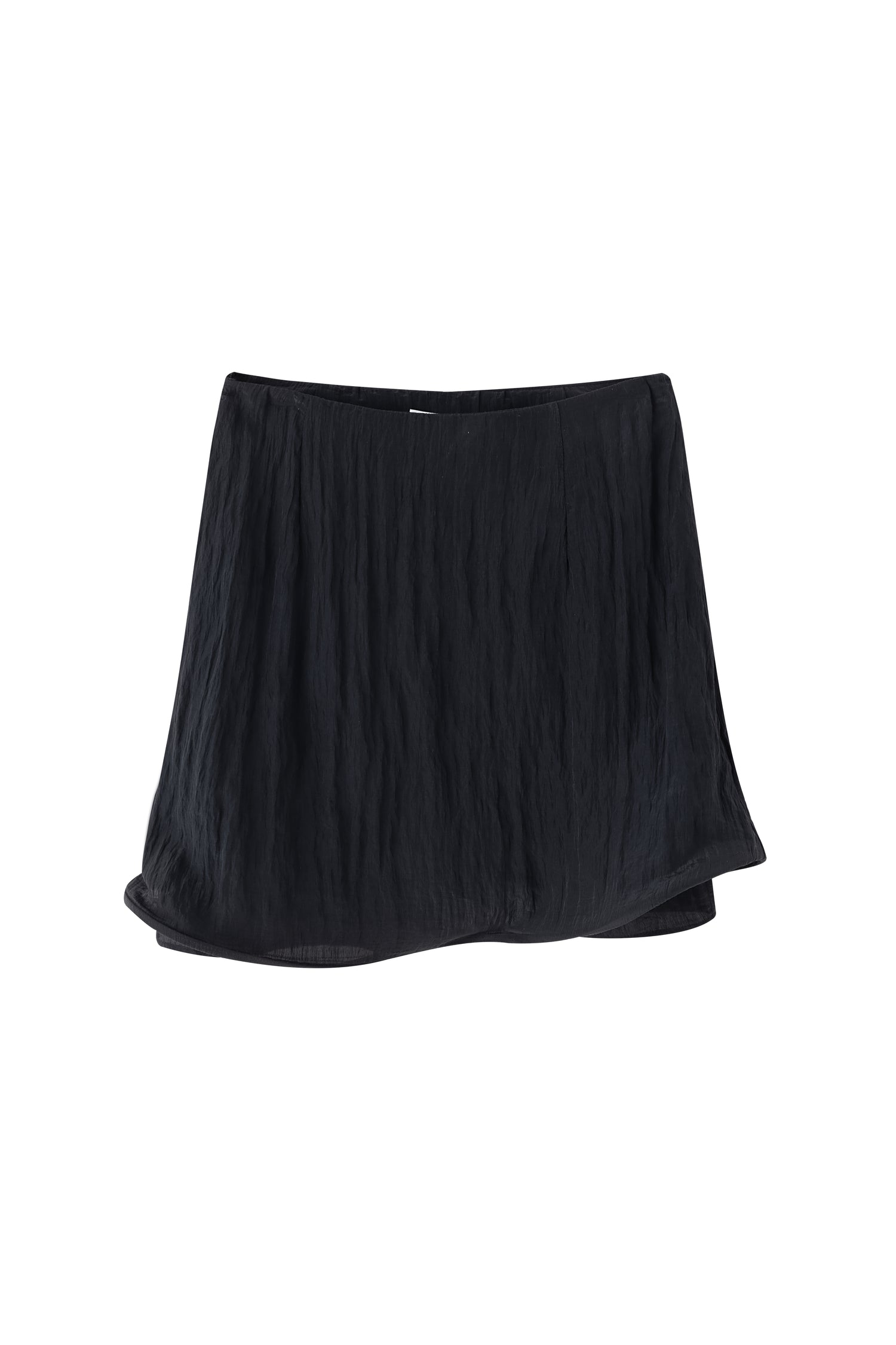 Crinkled short skirt with an asymmetrical stiff hemline creating a gentle twirling effect. To be paired with the matching Uni short sleeve top.