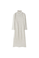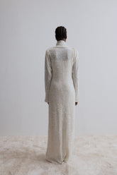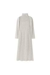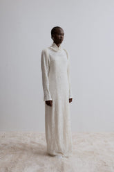 This floor-length dress features a high collar that drapes loosely around the neck. The sleeves are designed to offer a distinctive draping appearance at the seam, enhancing the overall ...